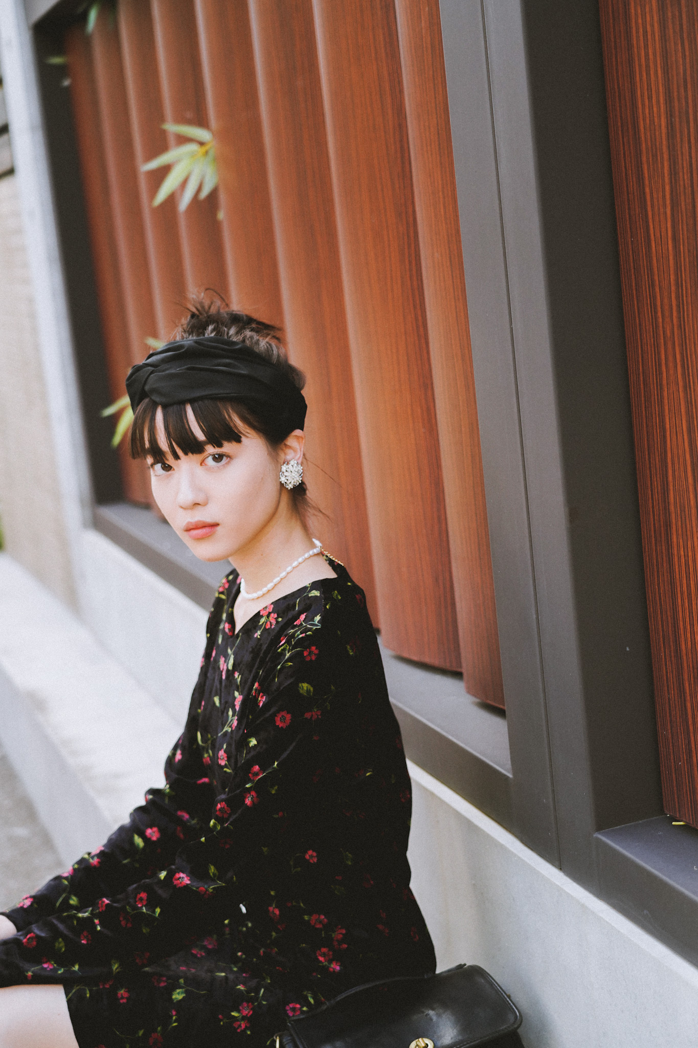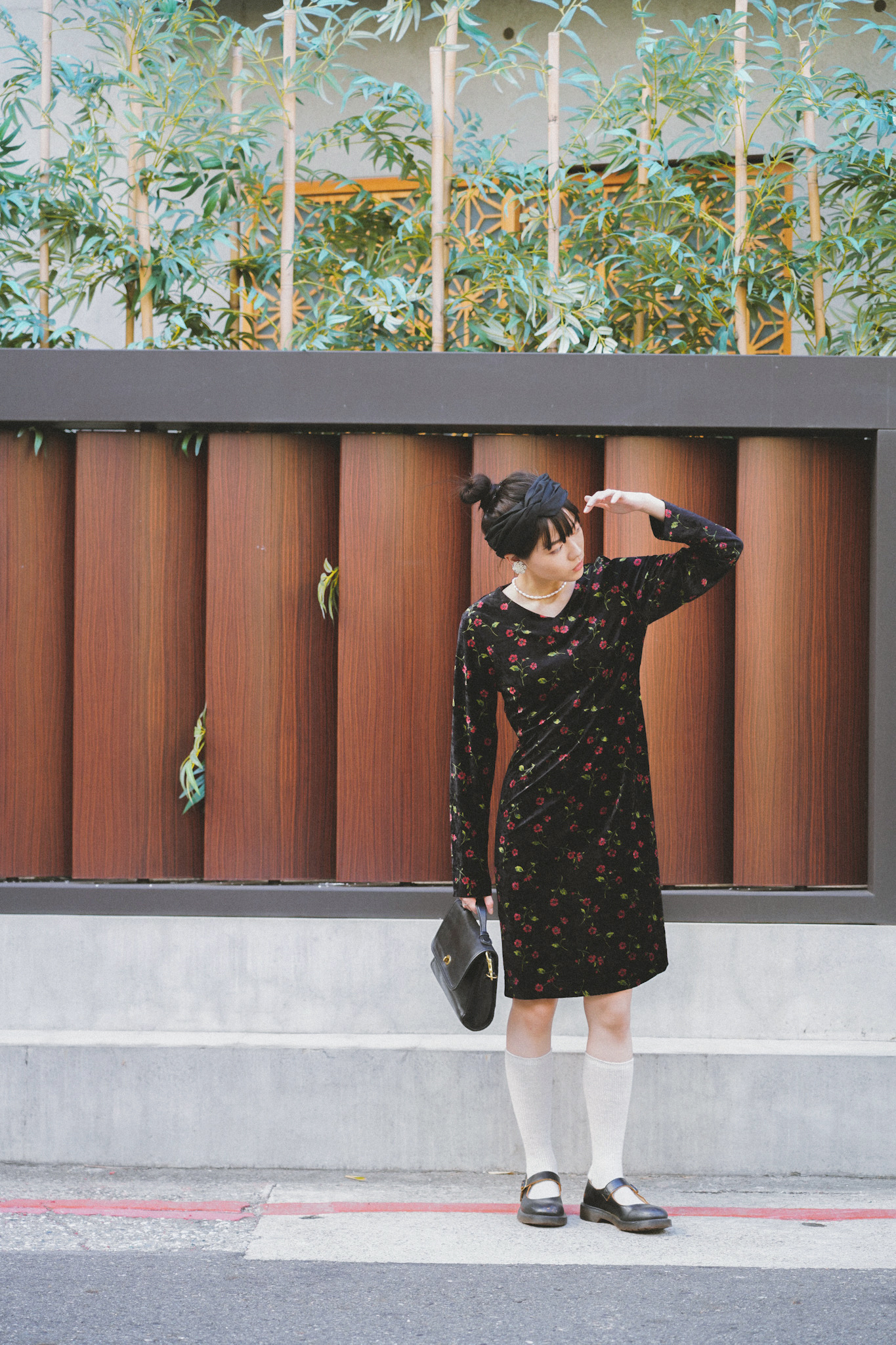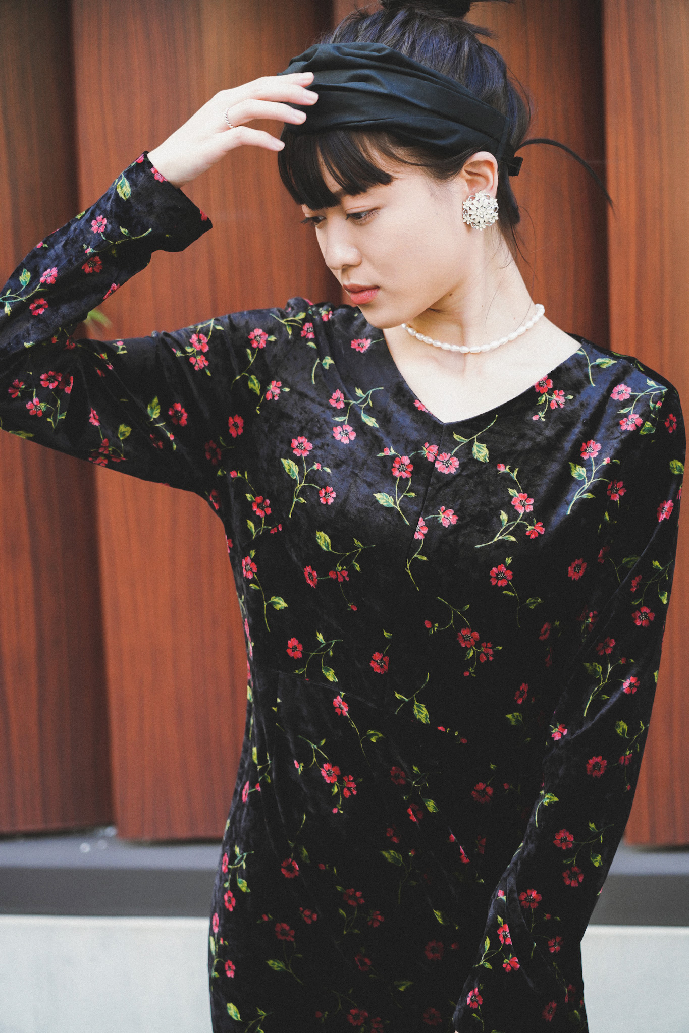 天鵝絨的面料,讓黑色小洋裝有了成熟氛圍,錯落的花朵們就像慶祝著秋季的到來多麼令人開心。搭配同色系的髮帶與皮革包,就能打造充滿儀式感的約會穿搭。