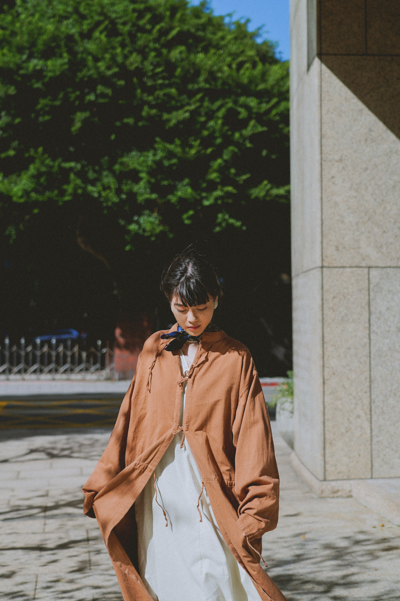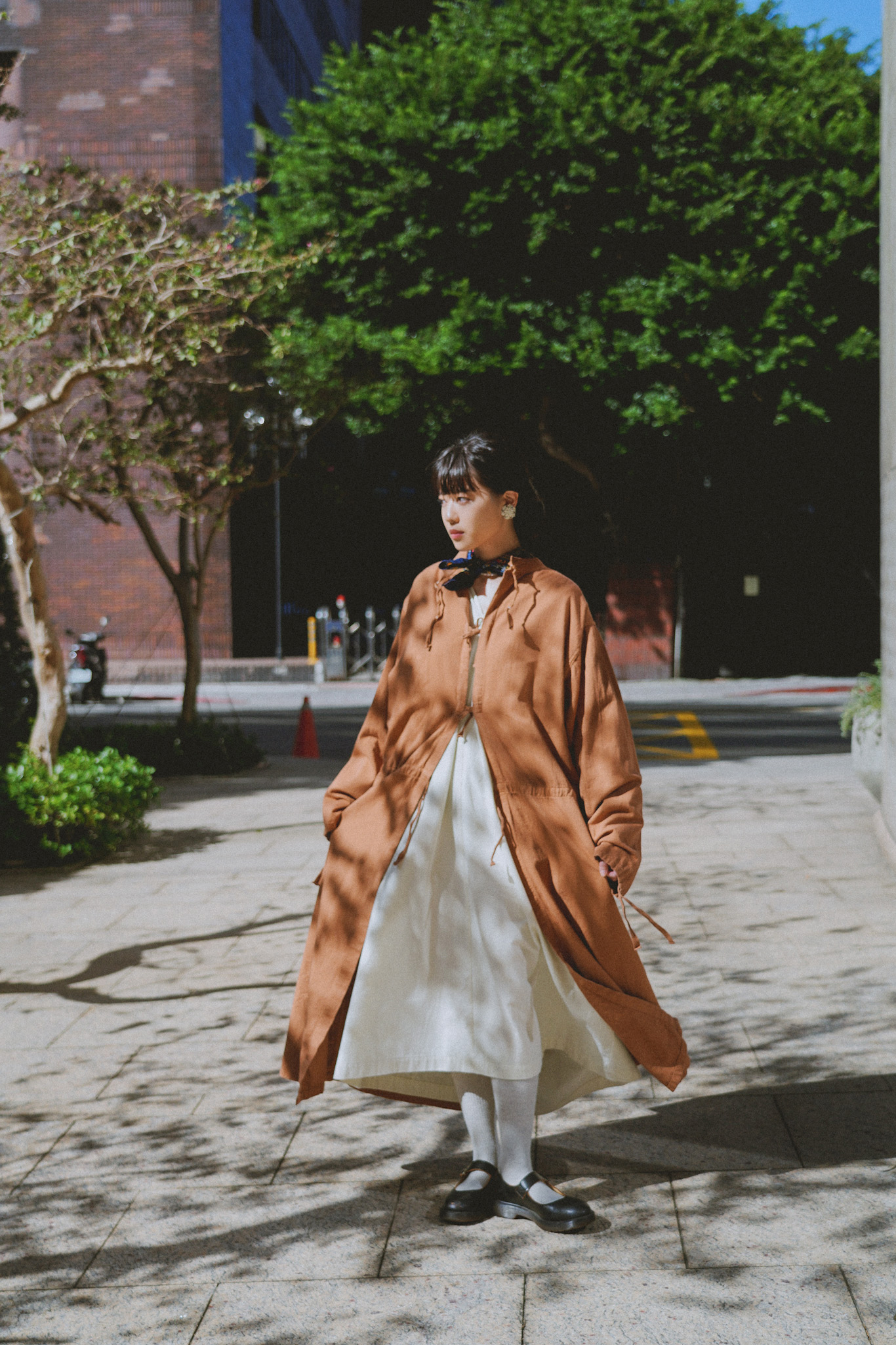 外罩長袍同樣來自我們的 F5 系列,原先是作為捷克醫療外袍軍用品,經染製後呈現溫暖的橘棕色,讓衣著延續過去的版型,卻有了不同樣貌的可能性。