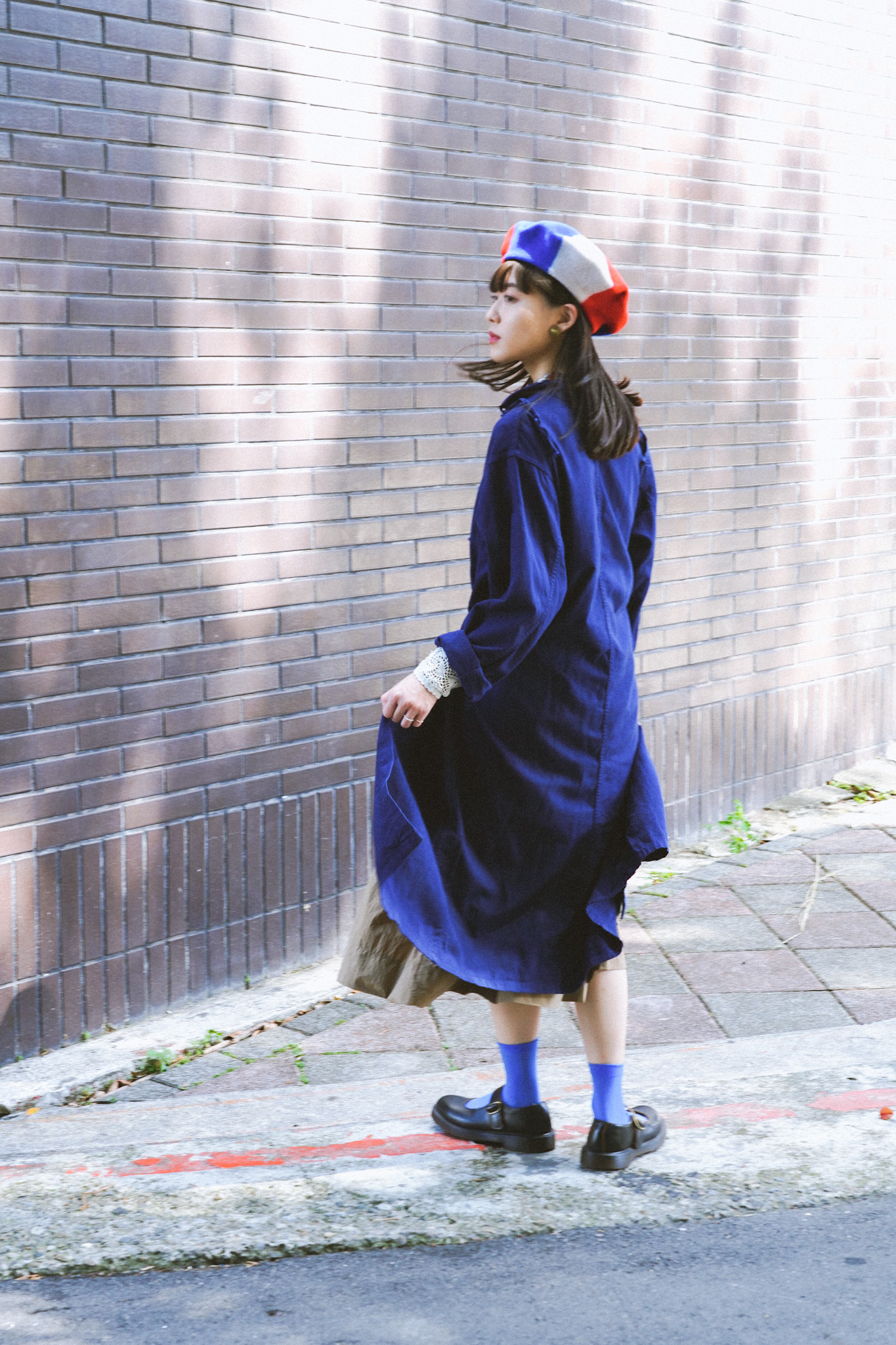 穿搭的第一步先採取多層次穿搭的守則,讓卡其半身裙揉和藍色捷克外袍的色調比重,內著則是搶眼的 Vintege 格子襯衫與蕾絲外罩,看似複雜的組合,只要將捷克外袍的綁帶繫上,展露一點點內著色系,即可達到點綴的效果,就算單品們各自坐擁不同色系,卻能和諧共存。 最後用貝蕾帽上的藍,來呼應捷克外袍的沈穩存在感。