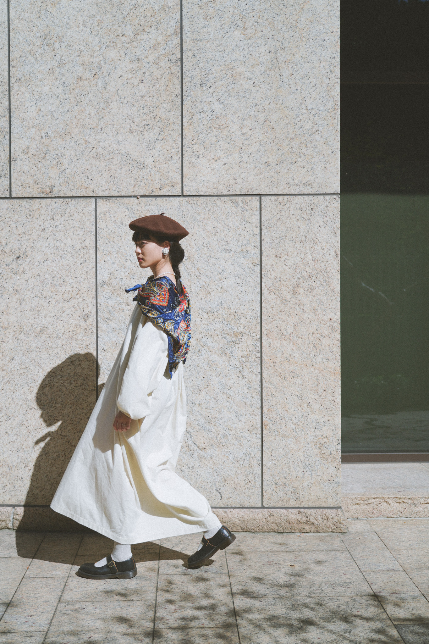 秋季首部曲,獻上了我們都喜愛的日本品牌 Nicholson & Nicholson,用簡單的廓形,搭配精細的材質與工法,打造能長時間融入日常的衣著,這件長度及踝的米白色 Dollie Cotton Flannel Dress,就像一張空白畫布般,有了大地色系長袍與絲巾的點綴後,飄飄裙擺與和諧色系,讓你就像油畫描繪出的精緻女性。