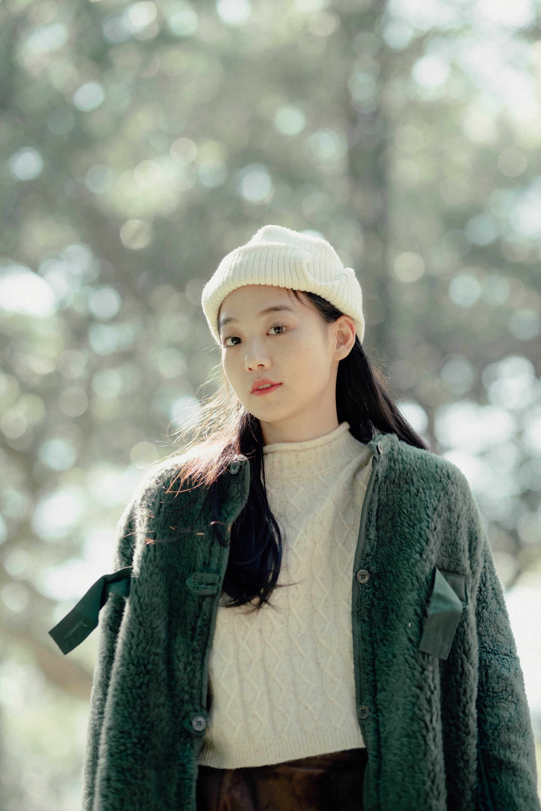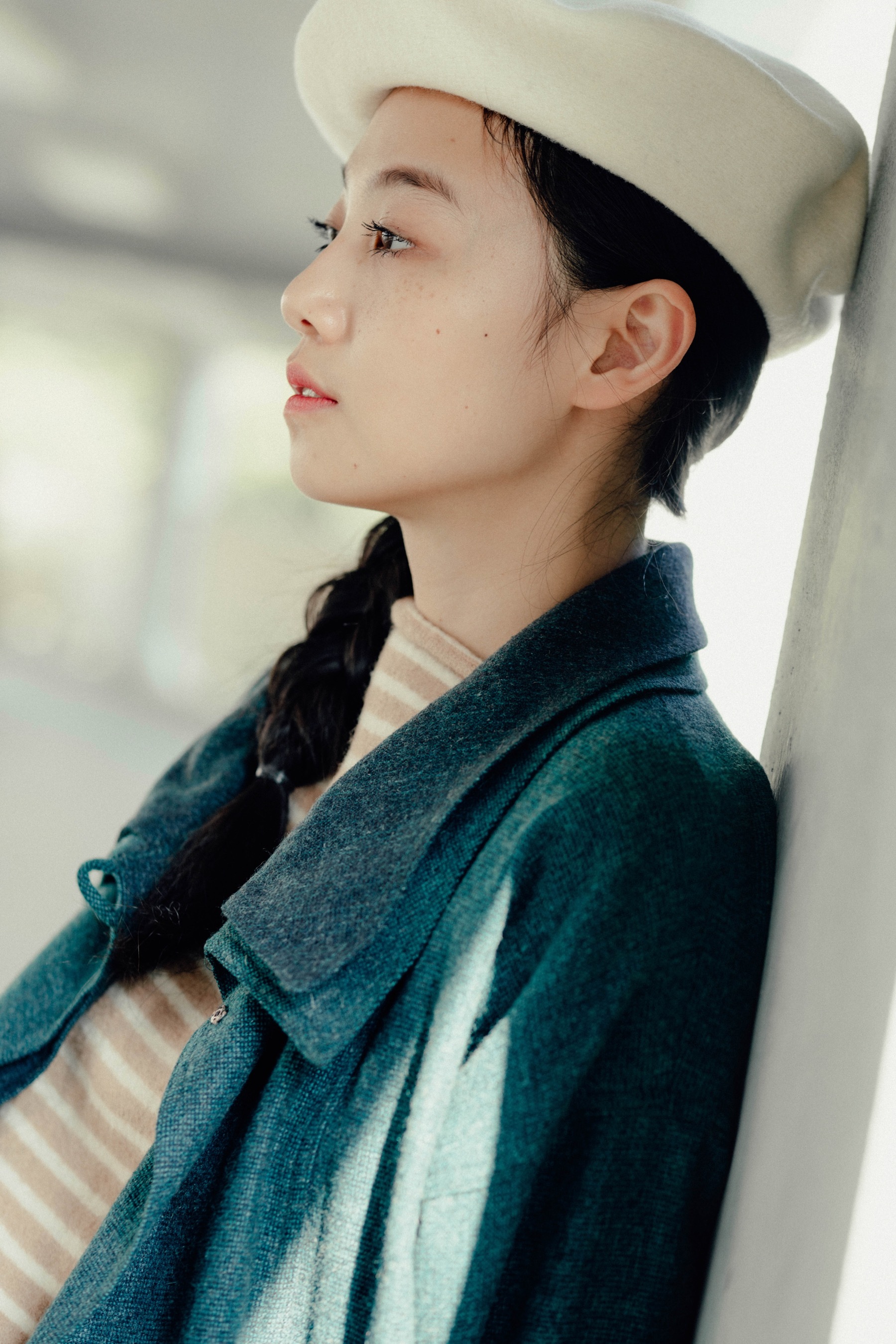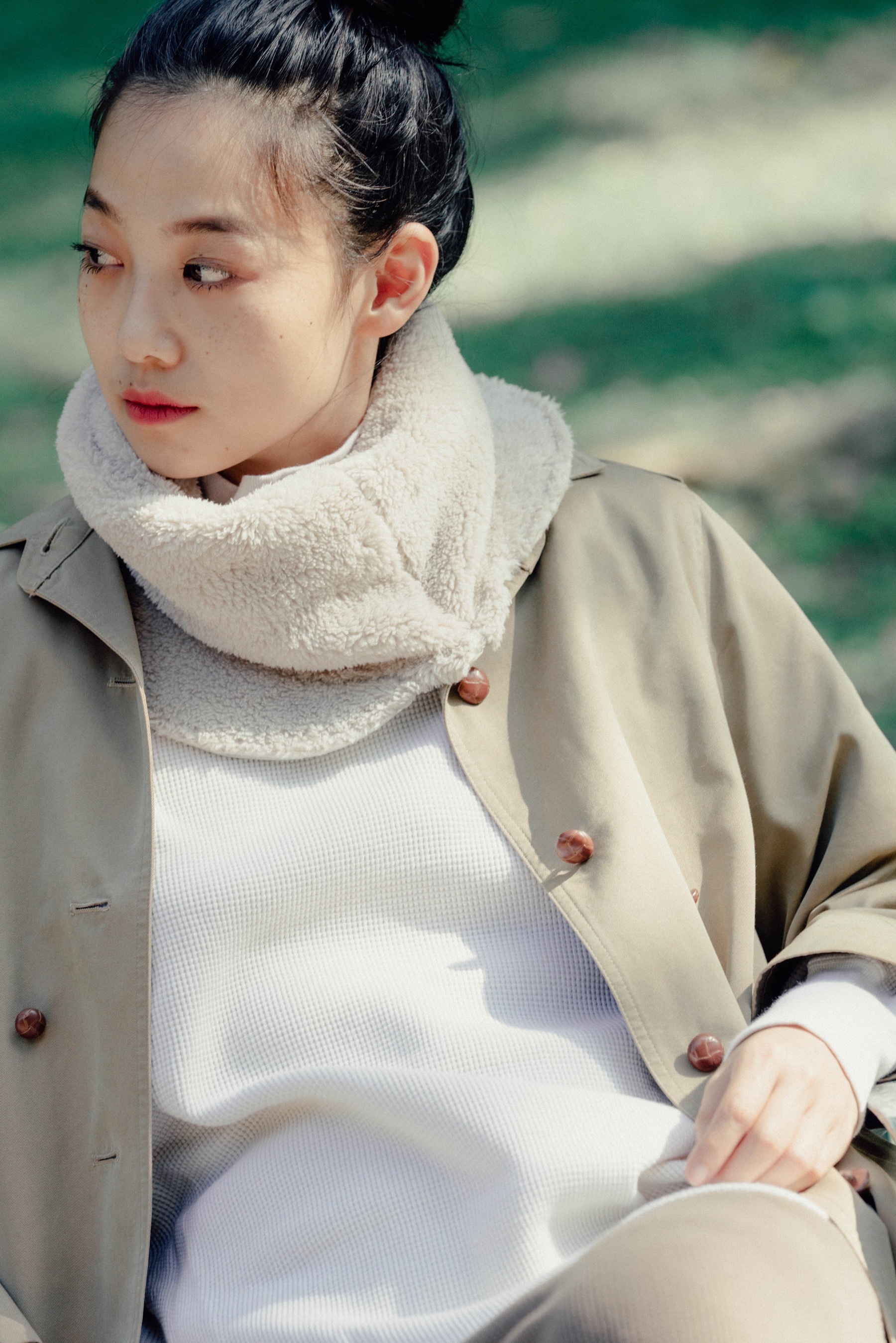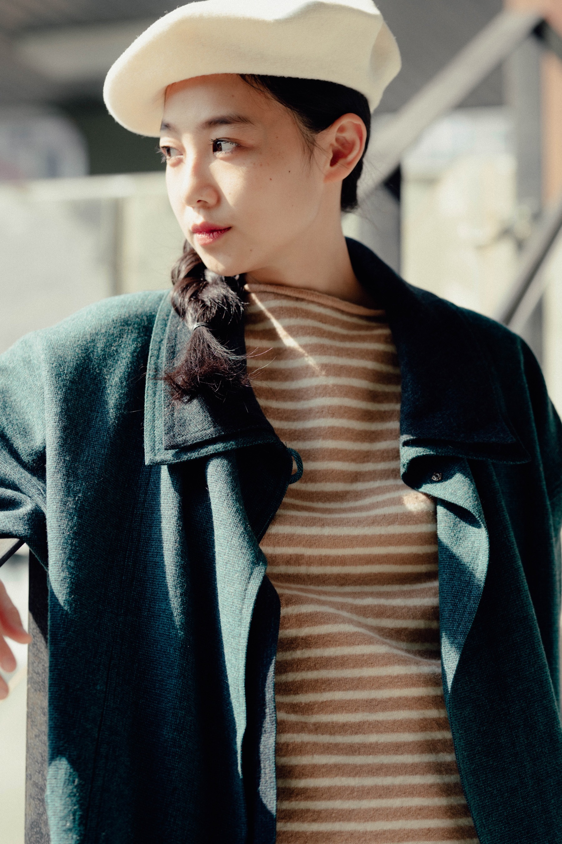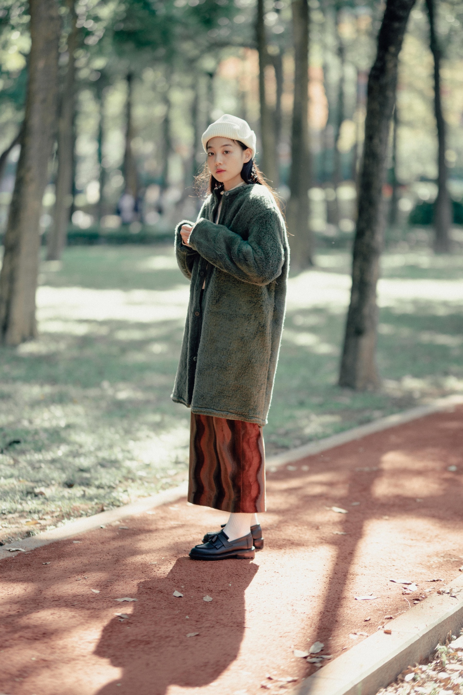 綠色的軍裝內裏毛呢,加上深咖啡色的天鵝絨半身裙,就像是住在森林裡的精靈,白色的毛帽與米色粗織毛衣相互呼應,陽光流洩,是剛曬完的被子暖呼呼的那種感覺,好摸的毛呢、透出微微光澤的天鵝絨,是低調但絕不平凡的模樣。
