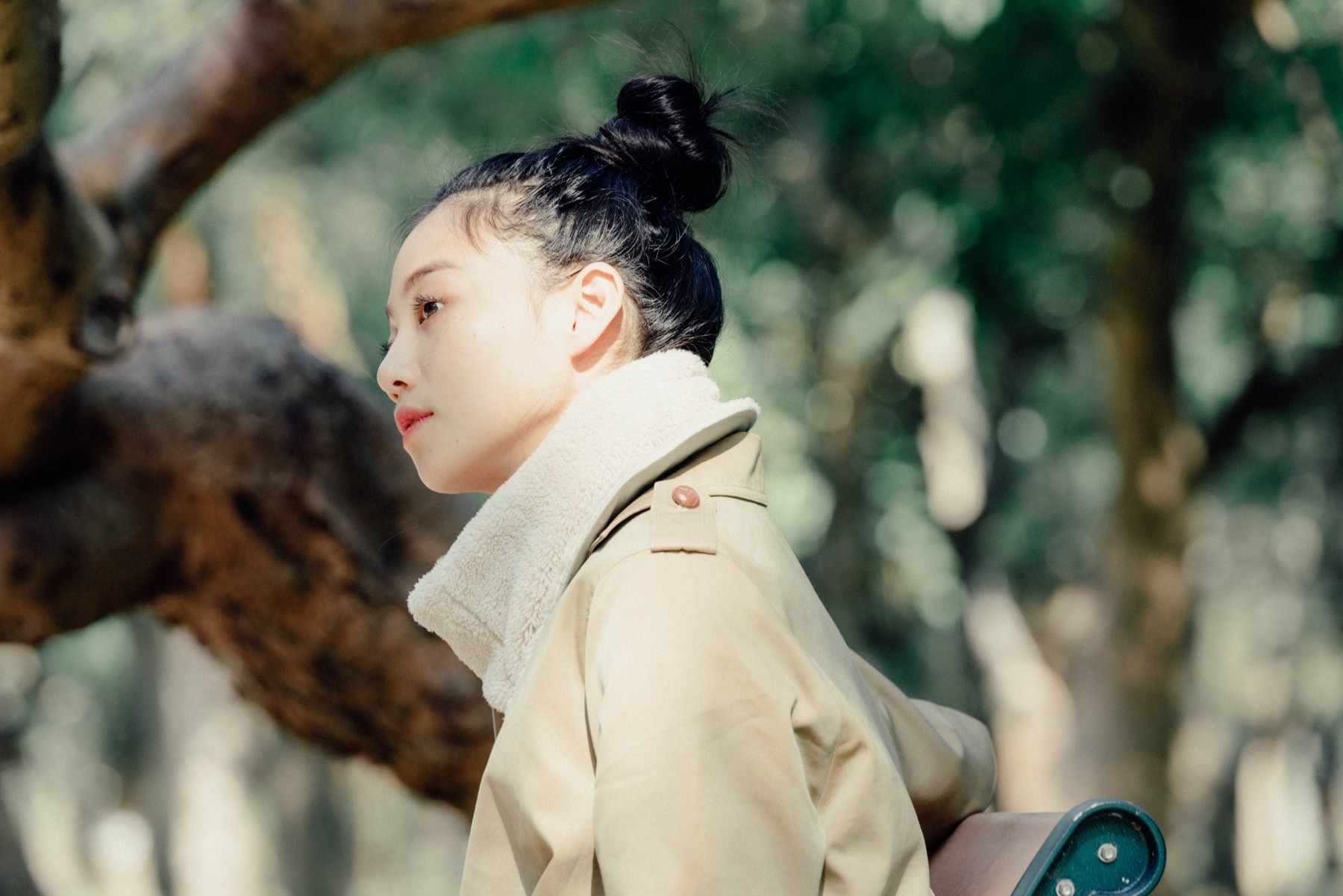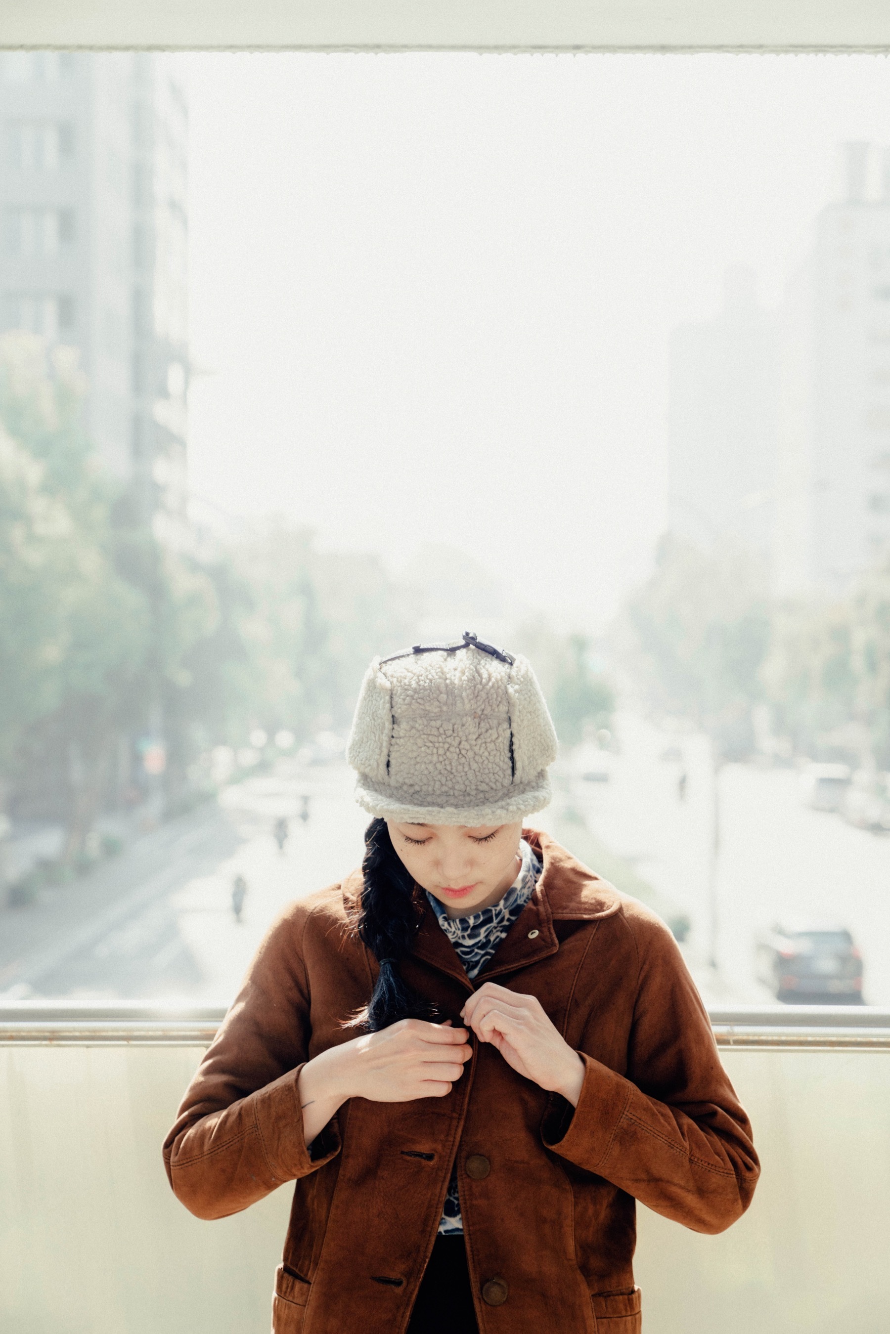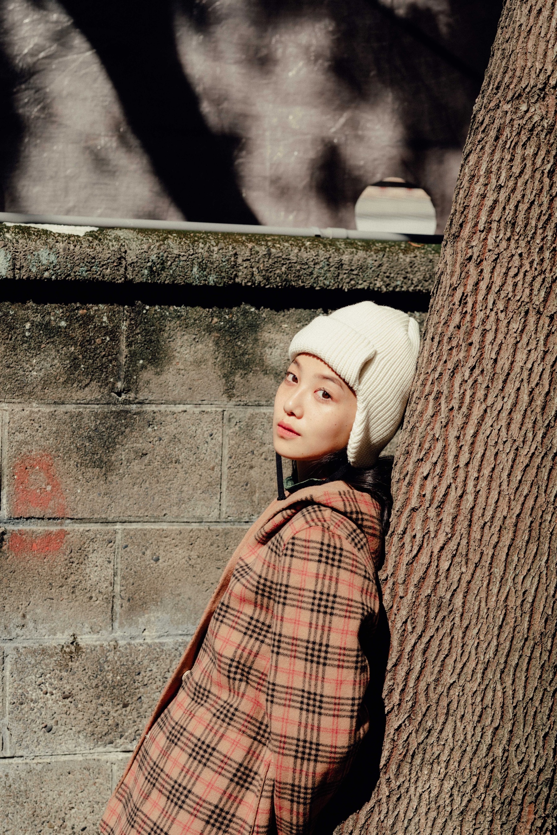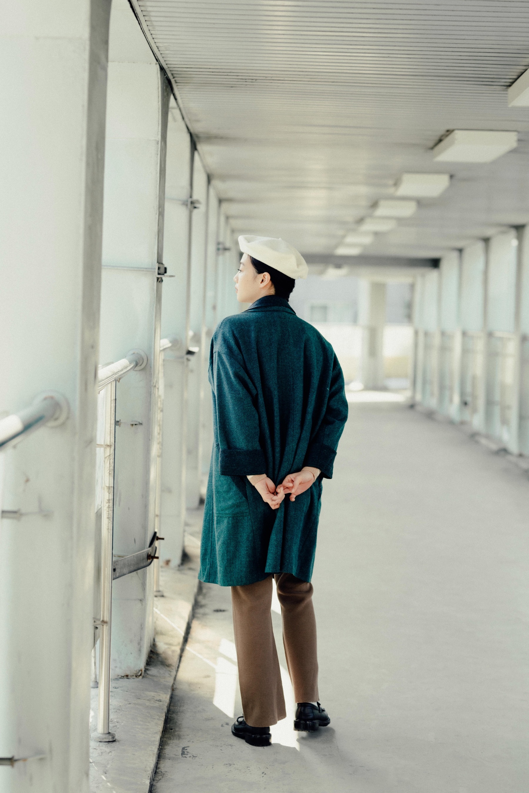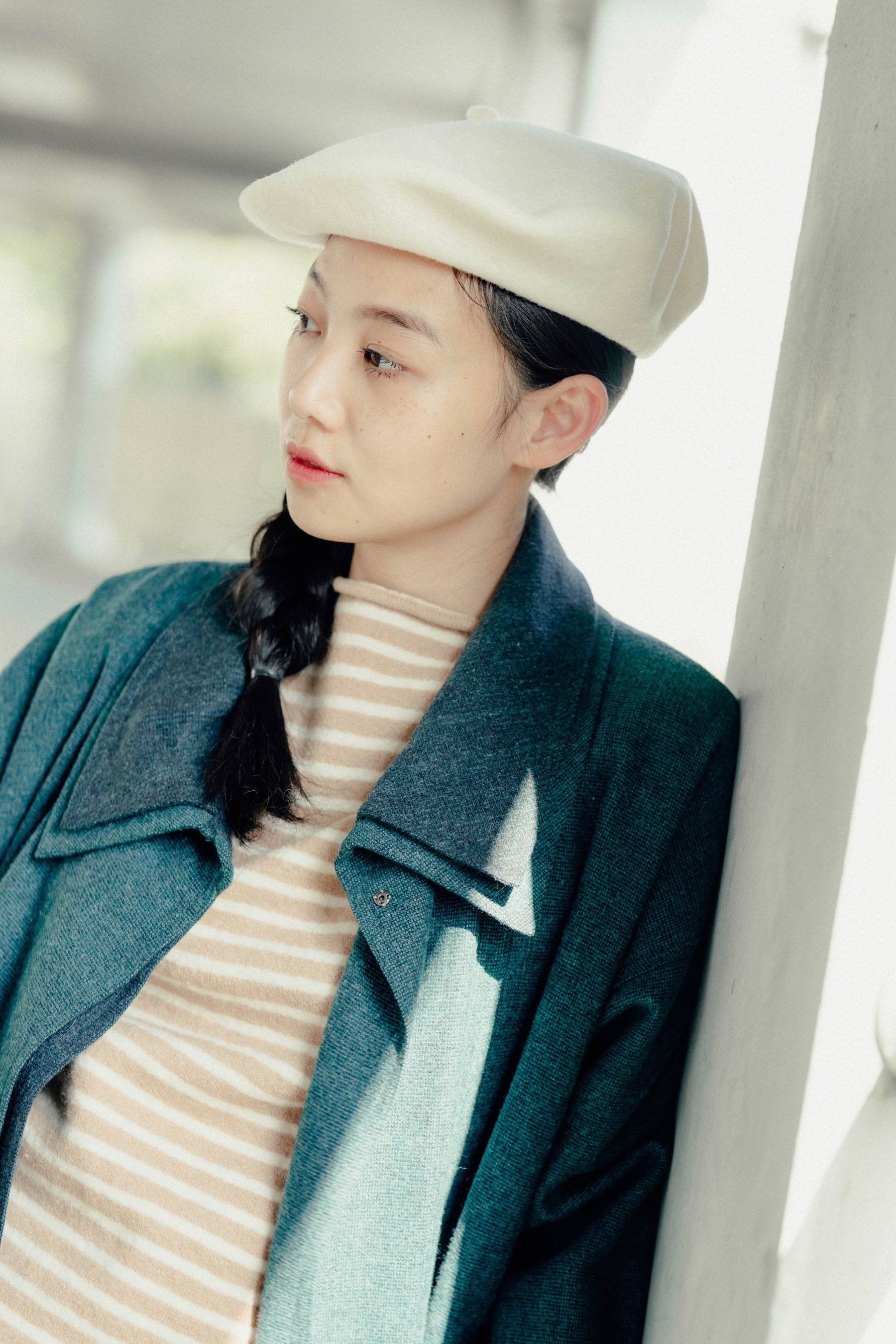 綠色的軍裝內裏毛呢,加上深咖啡色的天鵝絨半身裙,就像是住在森林裡的精靈,白色的毛帽與米色粗織毛衣相互呼應,陽光流洩,是剛曬完的被子暖呼呼的那種感覺,好摸的毛呢、透出微微光澤的天鵝絨,是低調但絕不平凡的模樣。