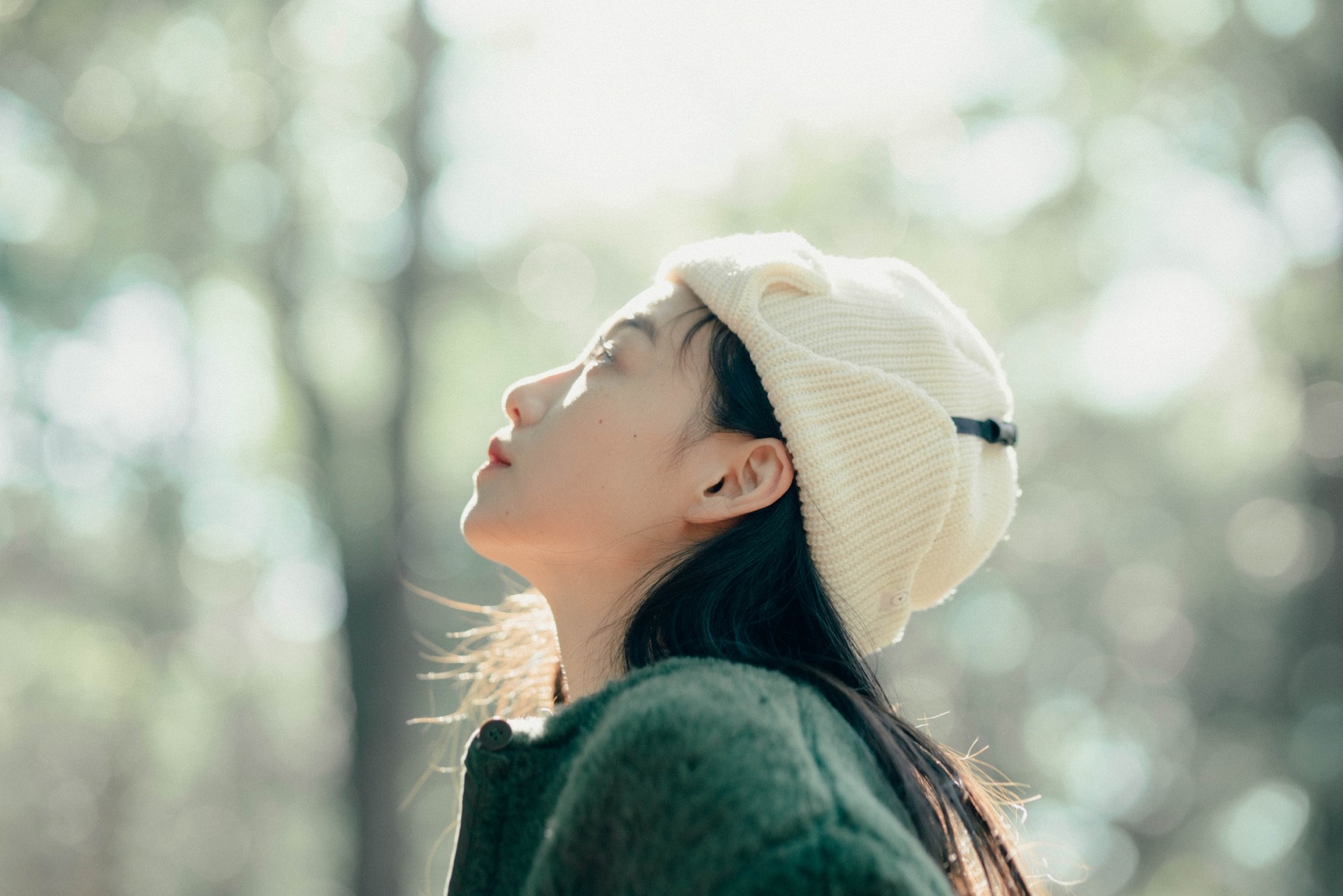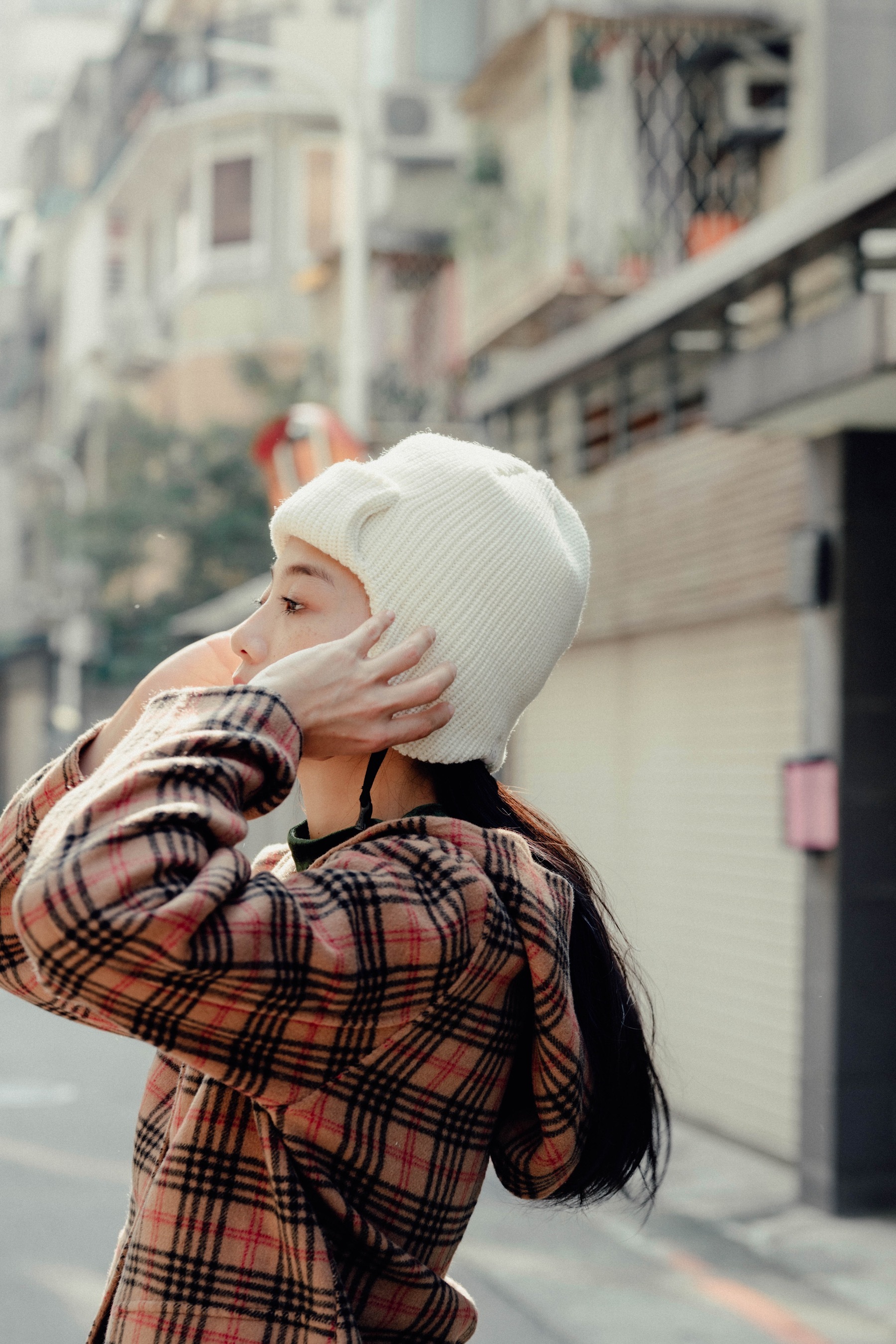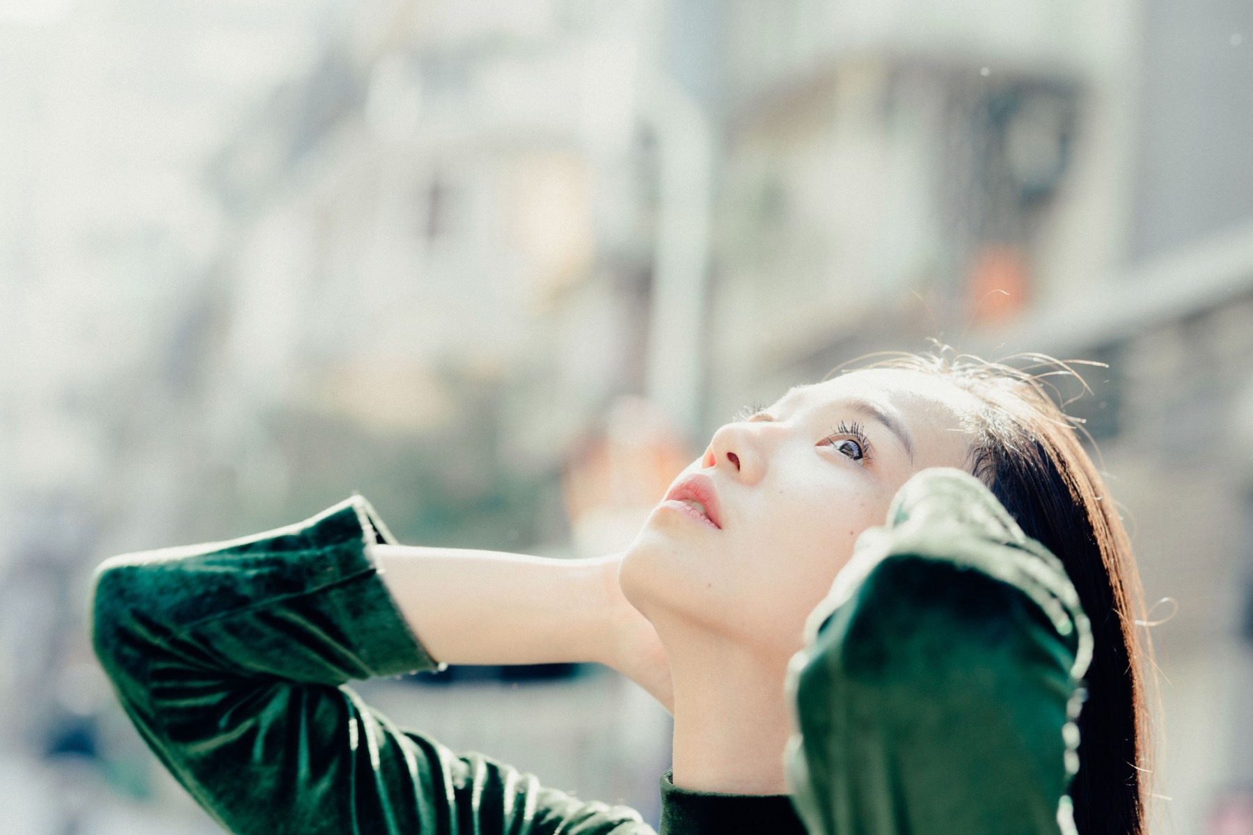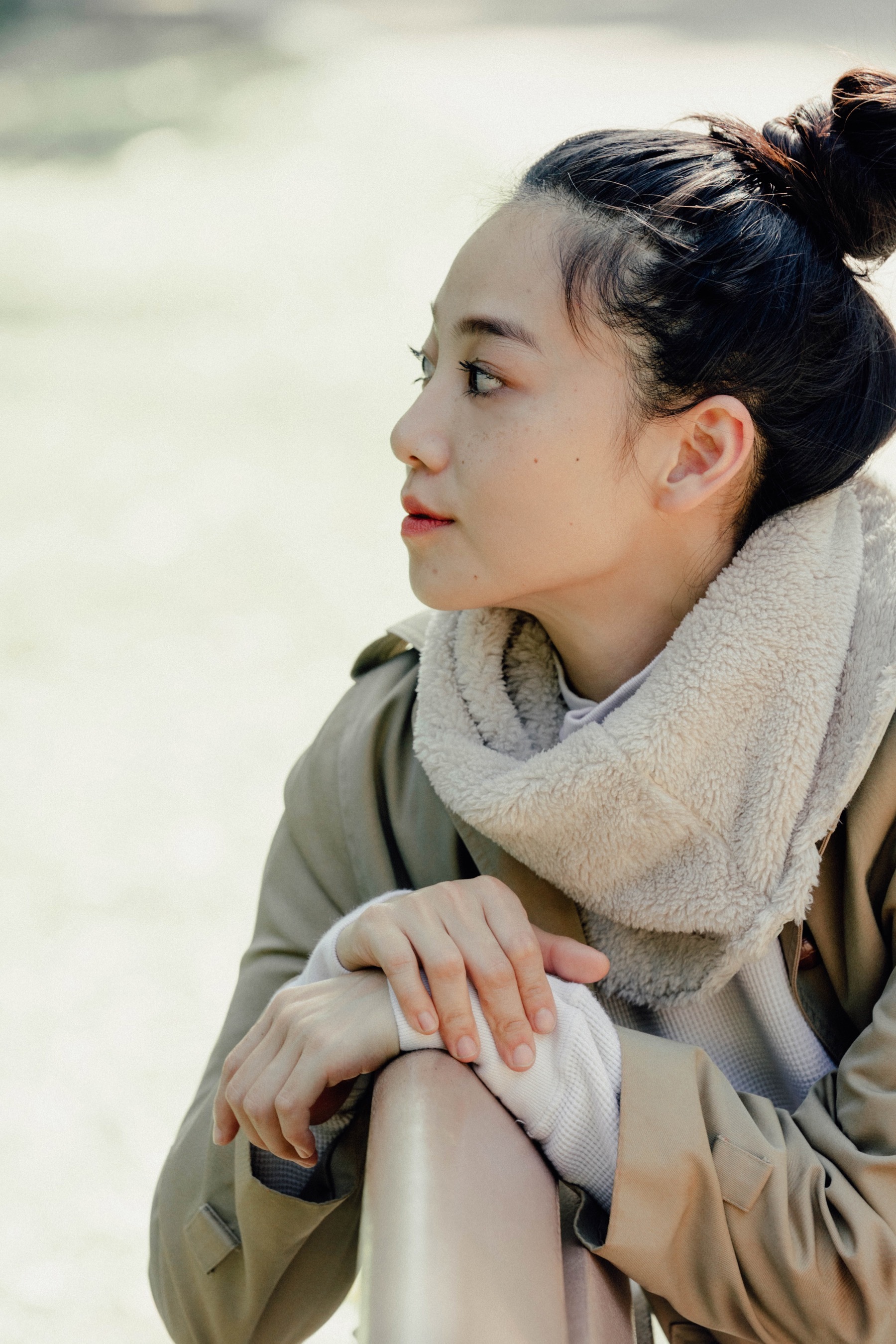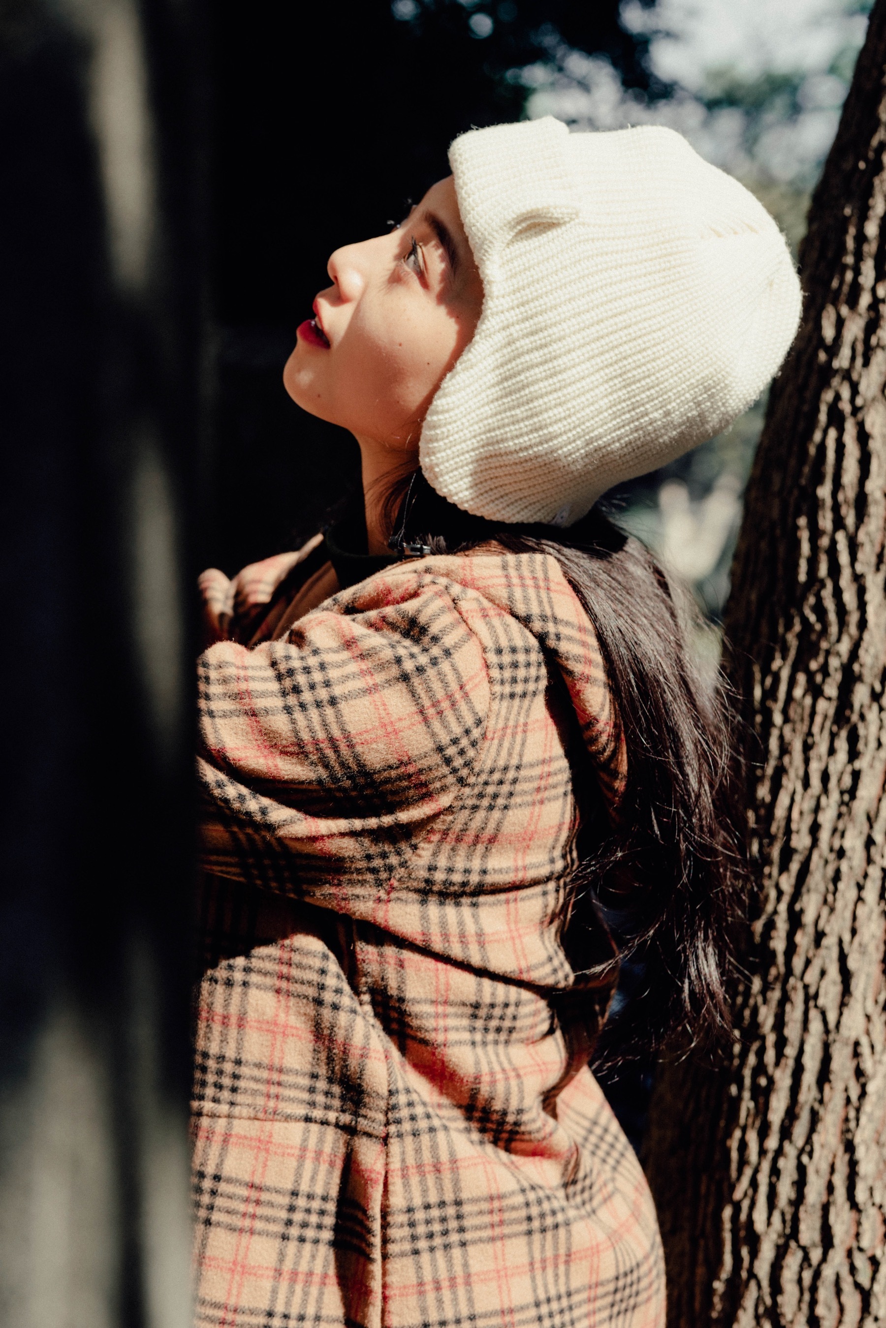 綠色的軍裝內裏毛呢,加上深咖啡色的天鵝絨半身裙,就像是住在森林裡的精靈,白色的毛帽與米色粗織毛衣相互呼應,陽光流洩,是剛曬完的被子暖呼呼的那種感覺,好摸的毛呢、透出微微光澤的天鵝絨,是低調但絕不平凡的模樣。