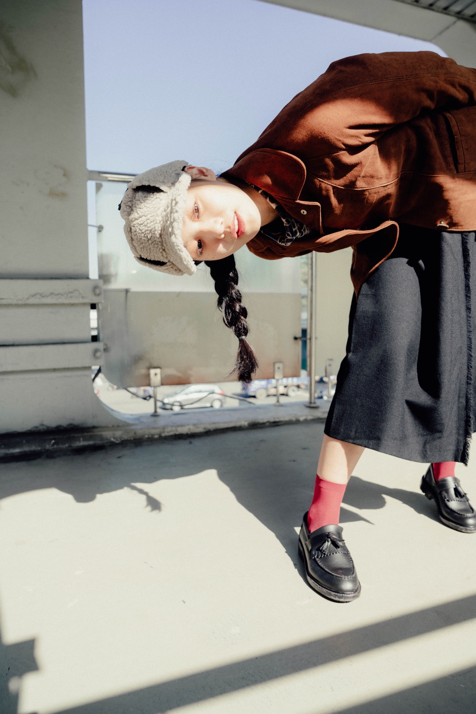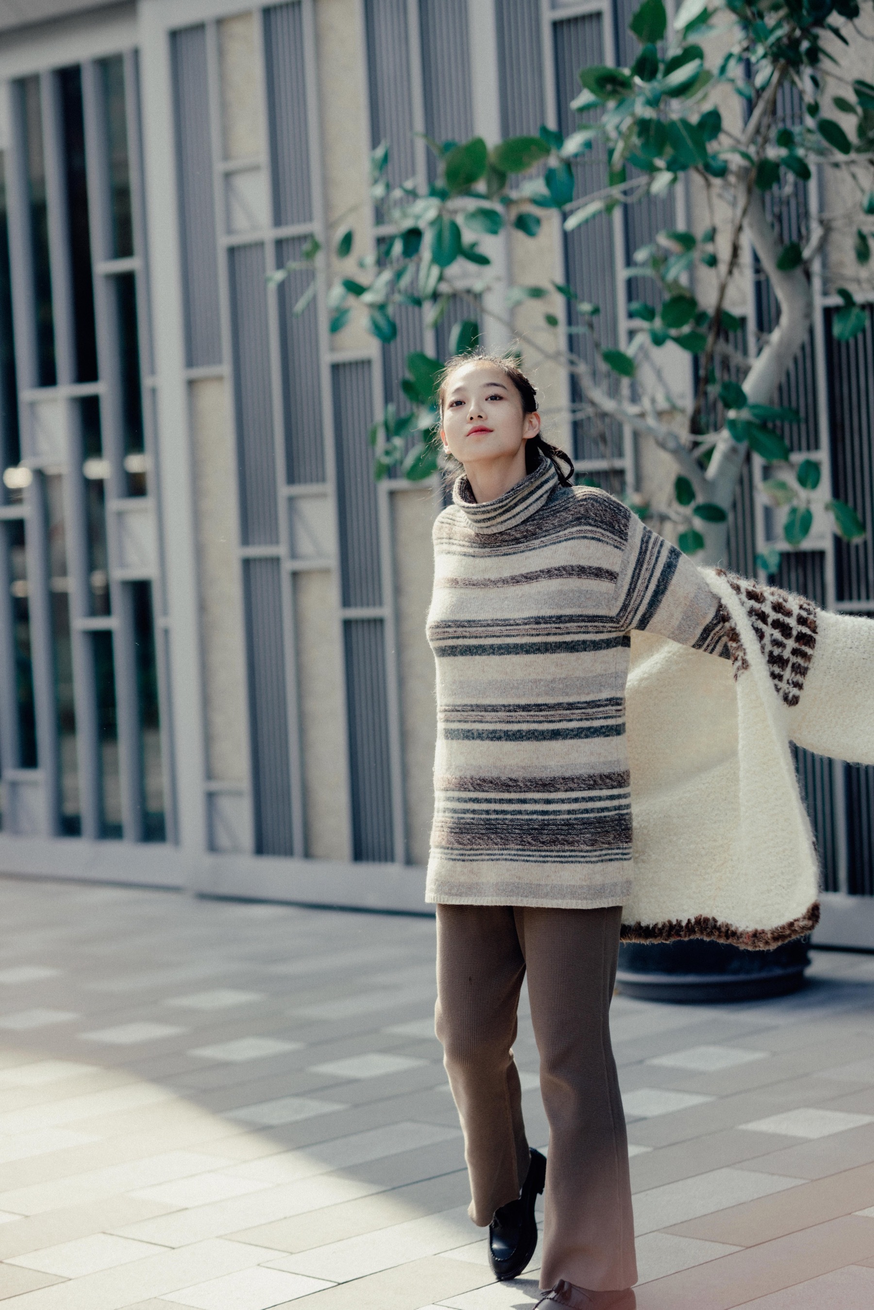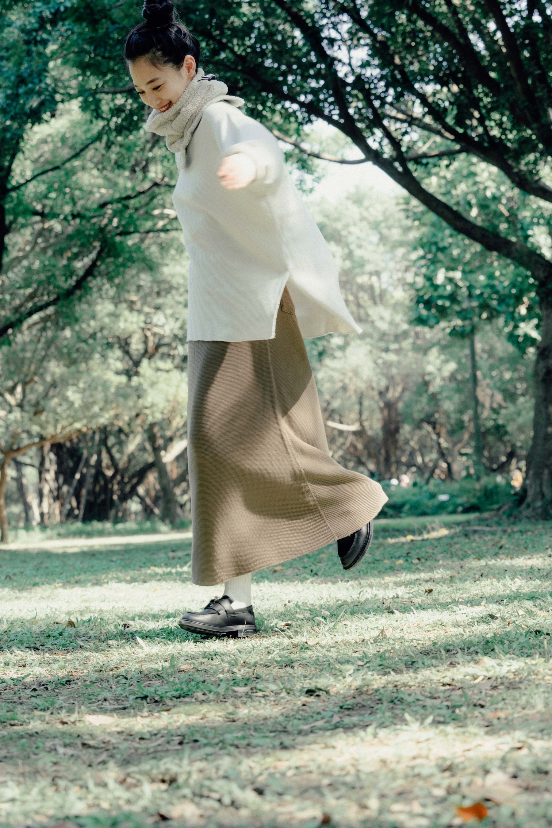 它像一襲被秋冬暈染過後的溫柔裝束,舒適的大地色系領頭,並以色塊完成整體,從頭到腳散發出無盡的優雅,內著為 WALLA WALLA 的針織上衣以及半身裙,溫柔的調色,堅韌的布料,柔和卻倔將。