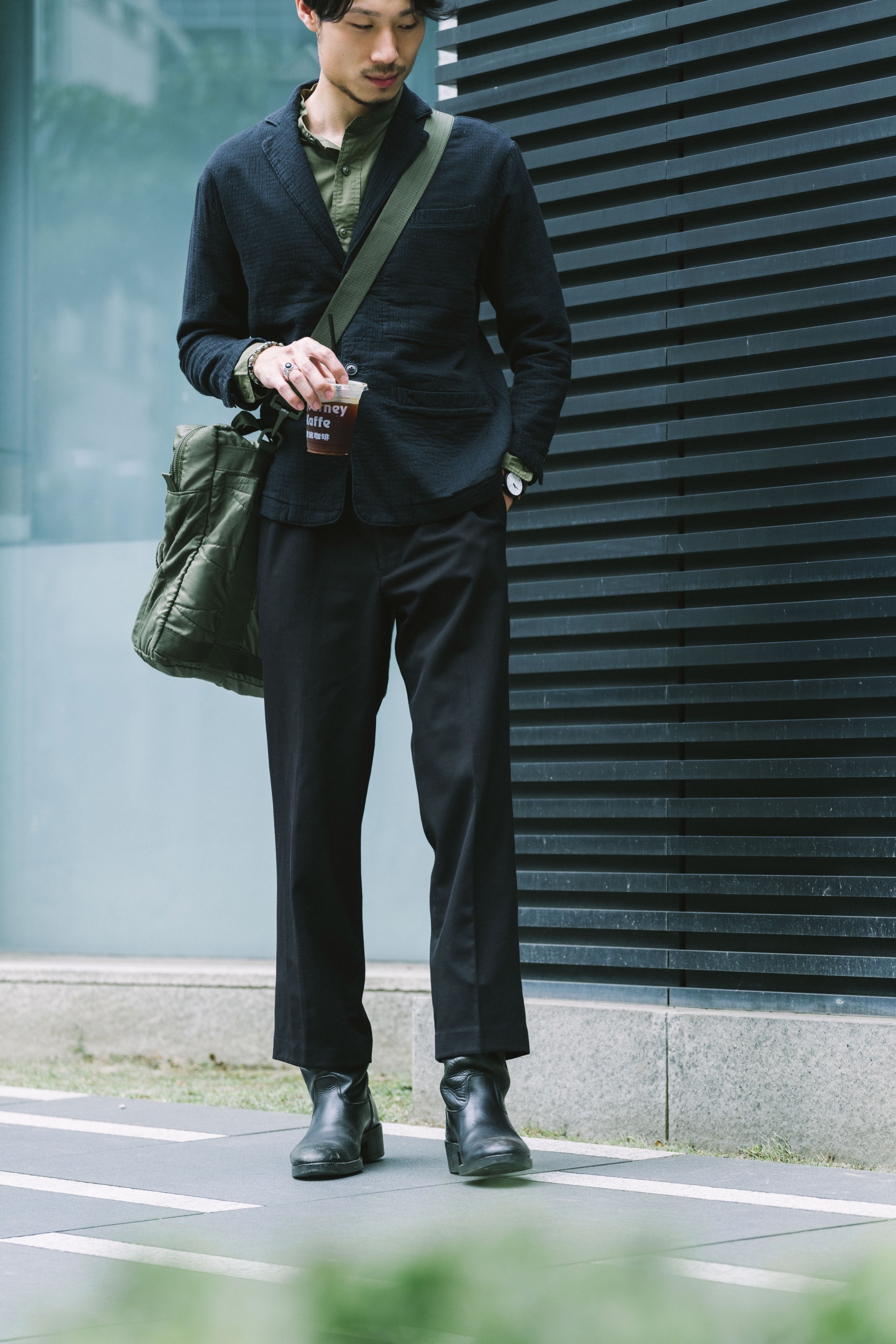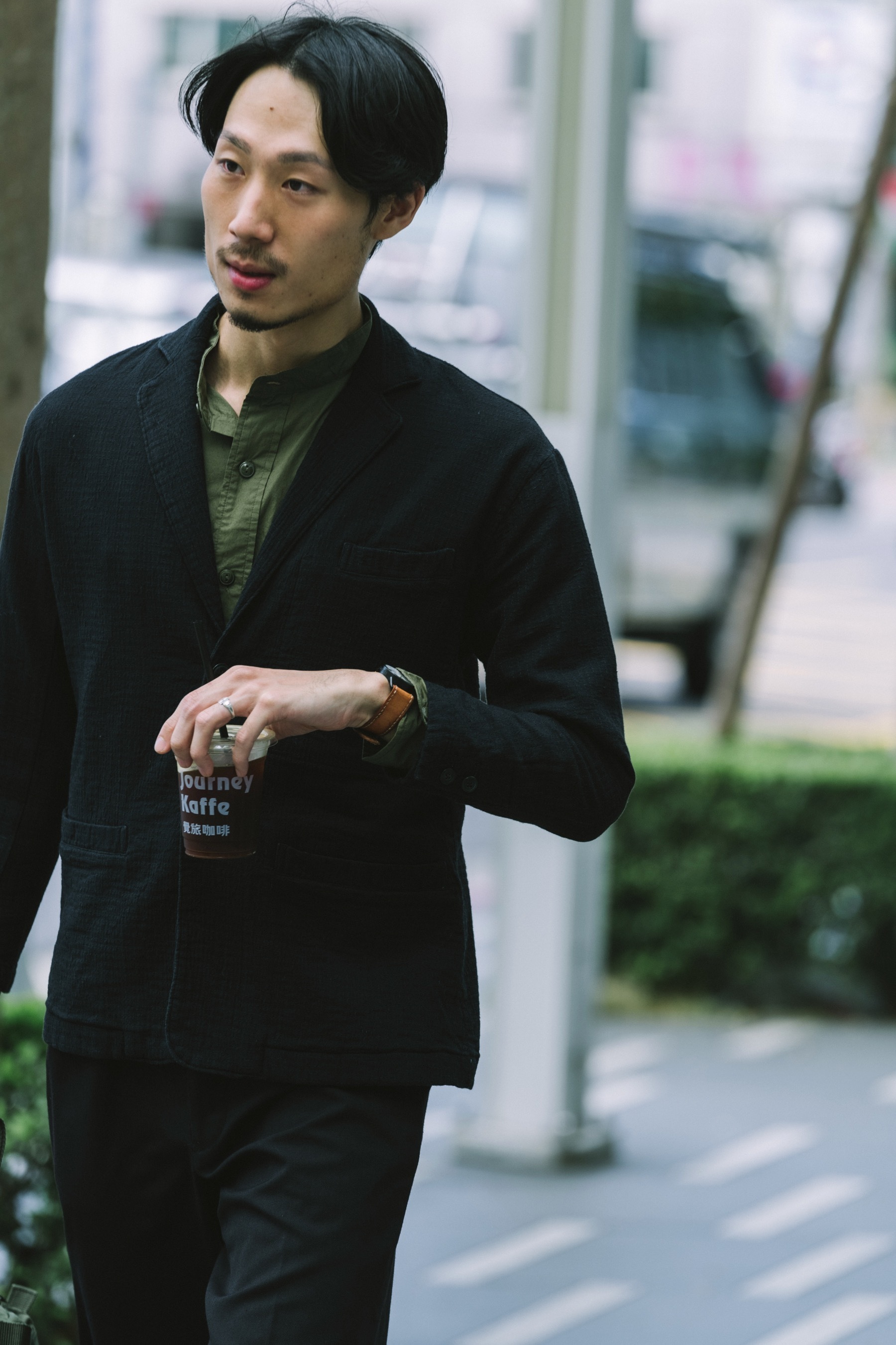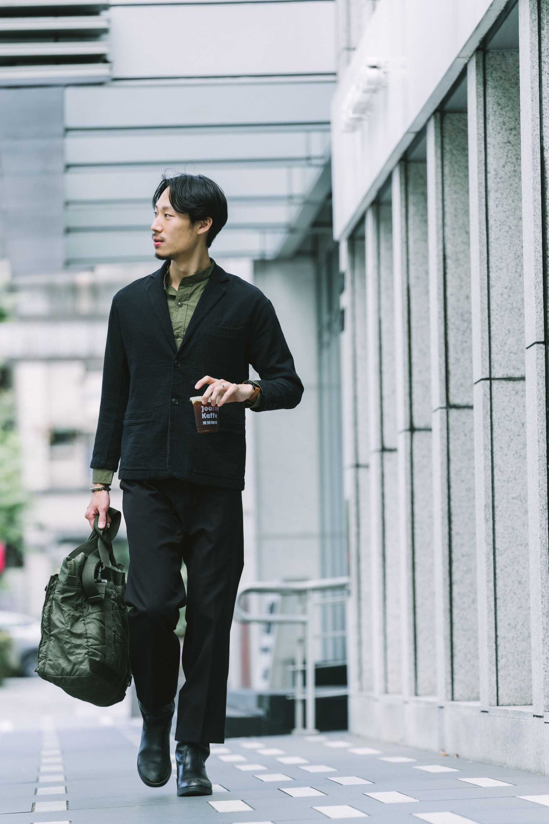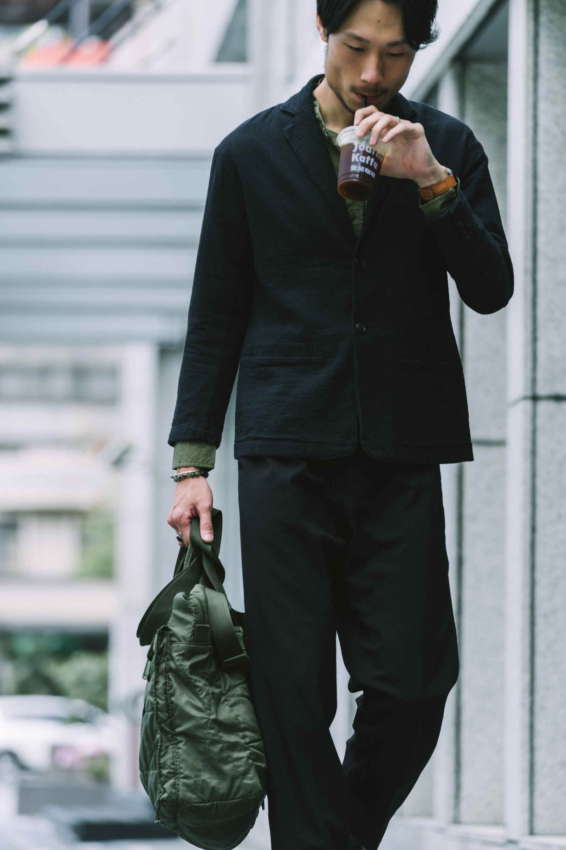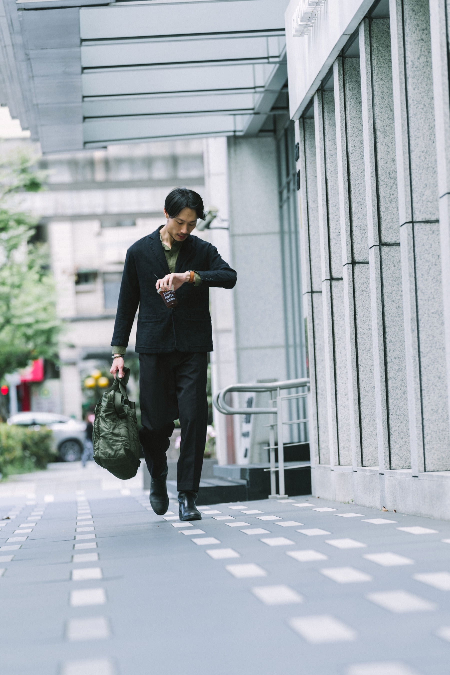 省去了西裝「成套」的拘束,上身選擇舒適的襯衫,配上同為以嚴謹的傳統服飾為傲的Porter Classic,在展現正裝的嚴謹之外,襯托出品味與工作能力上的細膩。以日本工藝的刺子織 (刺し子) 在面料上多一道交錯的運線,強化布料的韌性,同時增添織物上細緻的紋理。清爽的翻領與俐落的版型和基本卻充滿心機的紋理,證明你對於品味的敏感及充滿理想的用心。