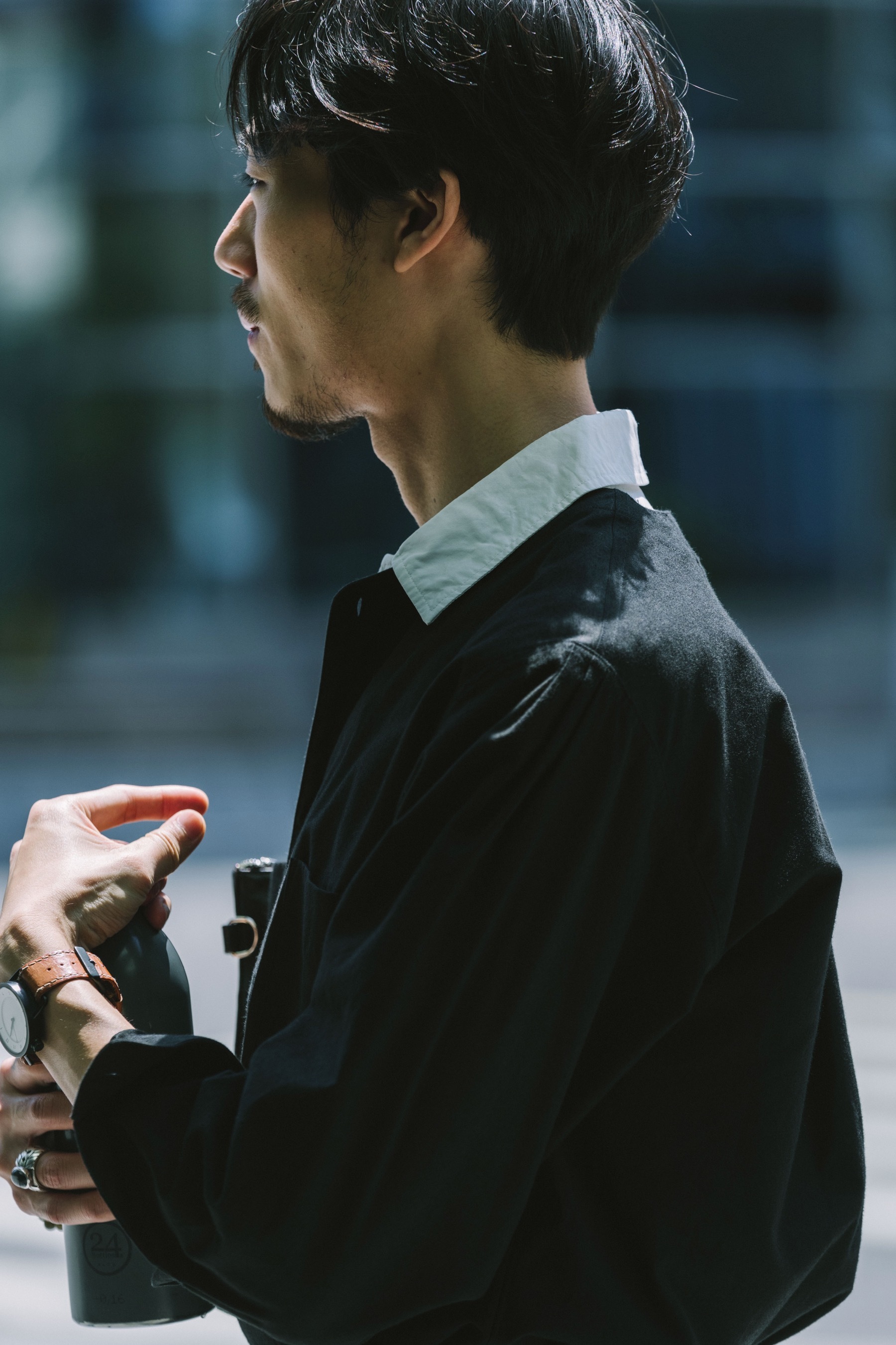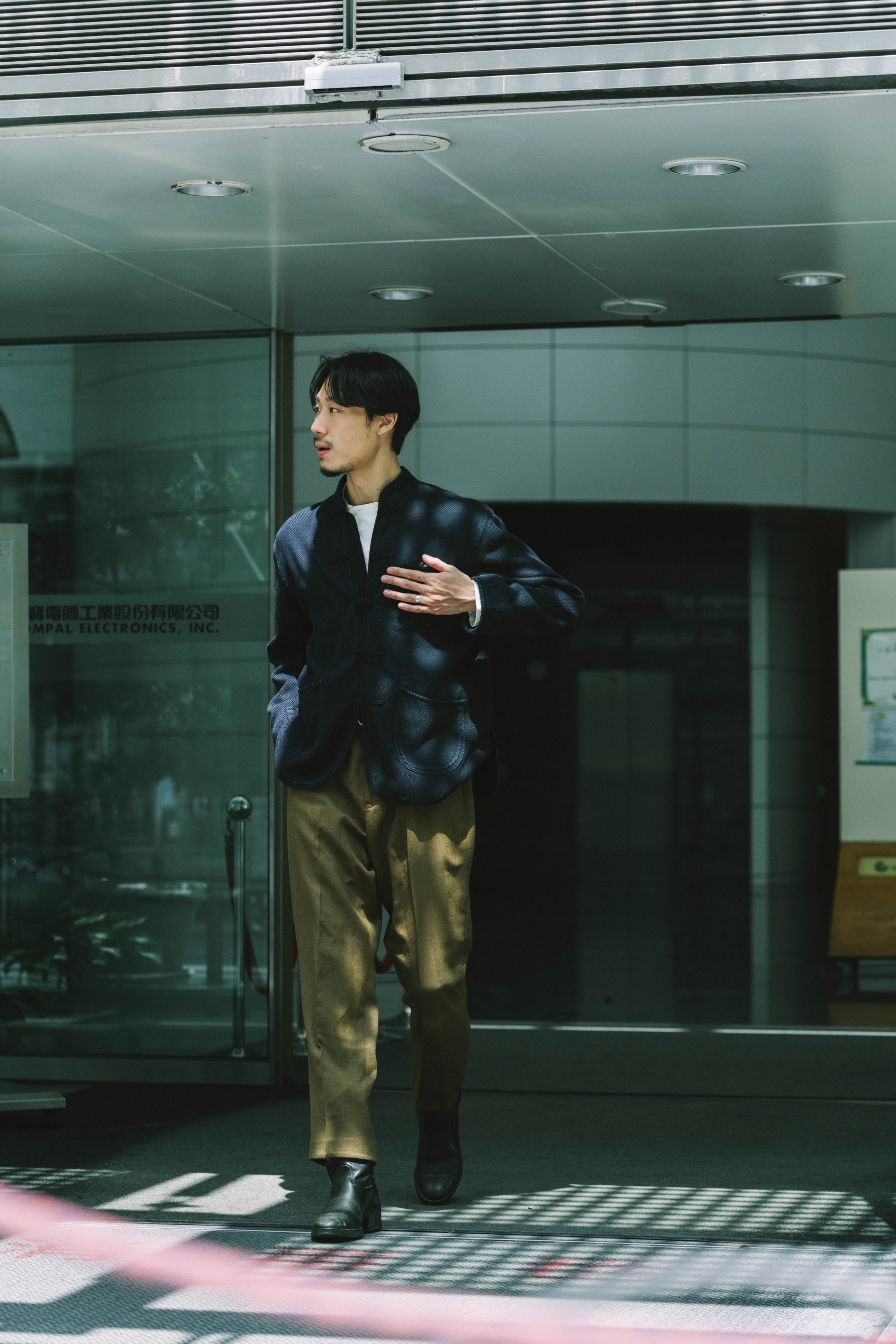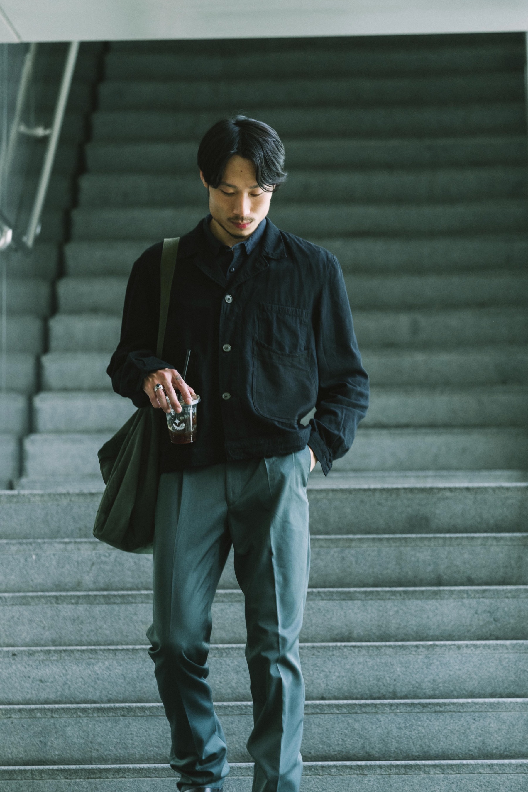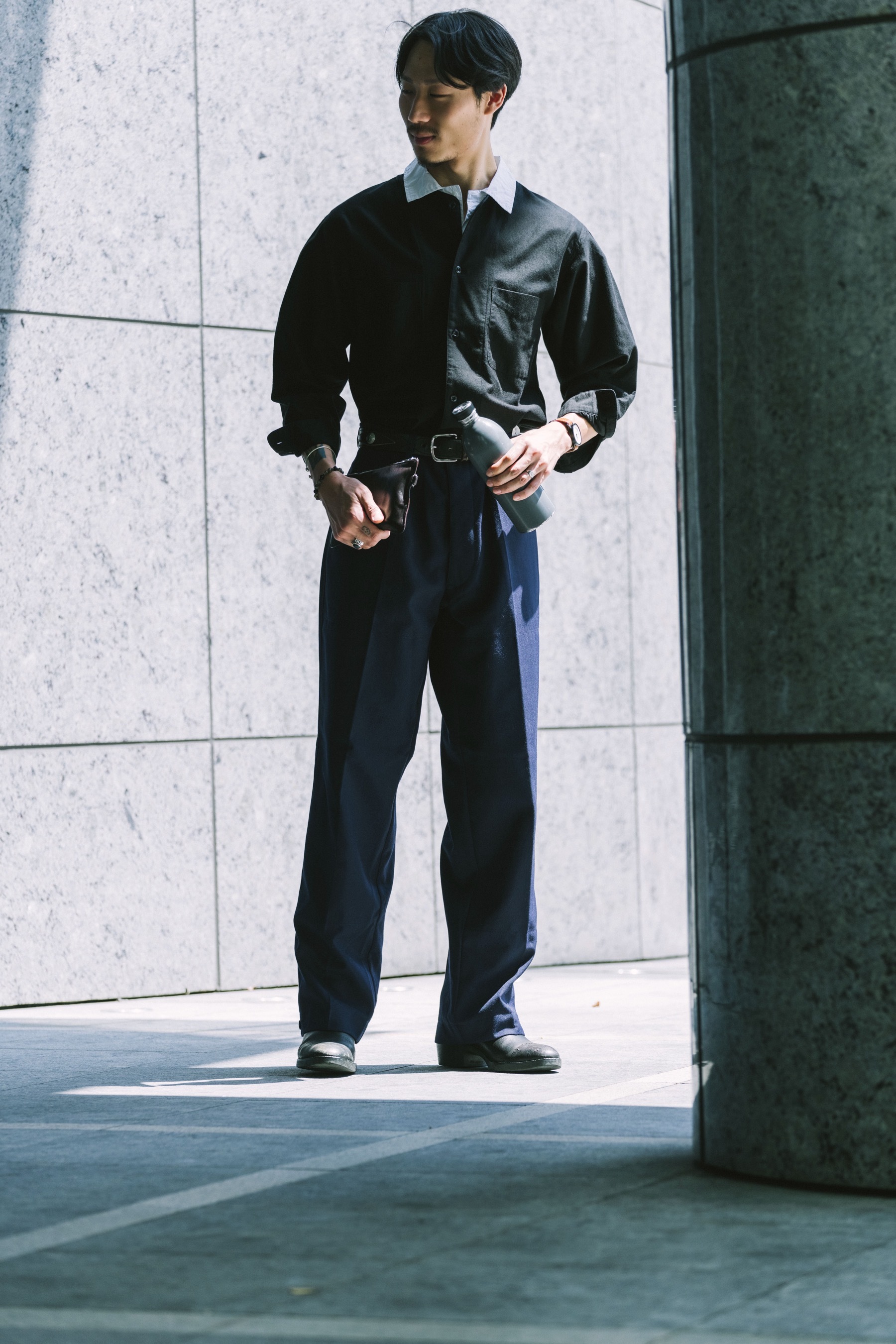 省去了西裝「成套」的拘束,上身選擇舒適的襯衫,配上同為以嚴謹的傳統服飾為傲的Porter Classic,在展現正裝的嚴謹之外,襯托出品味與工作能力上的細膩。以日本工藝的刺子織 (刺し子) 在面料上多一道交錯的運線,強化布料的韌性,同時增添織物上細緻的紋理。清爽的翻領與俐落的版型和基本卻充滿心機的紋理,證明你對於品味的敏感及充滿理想的用心。