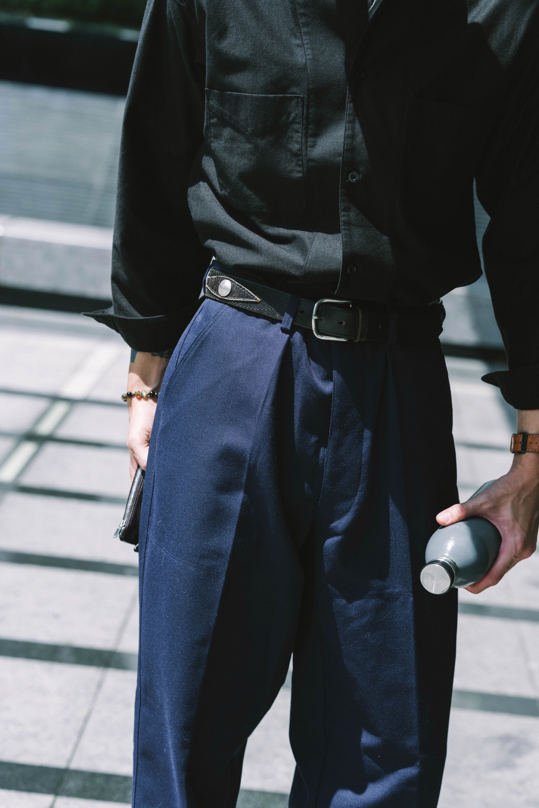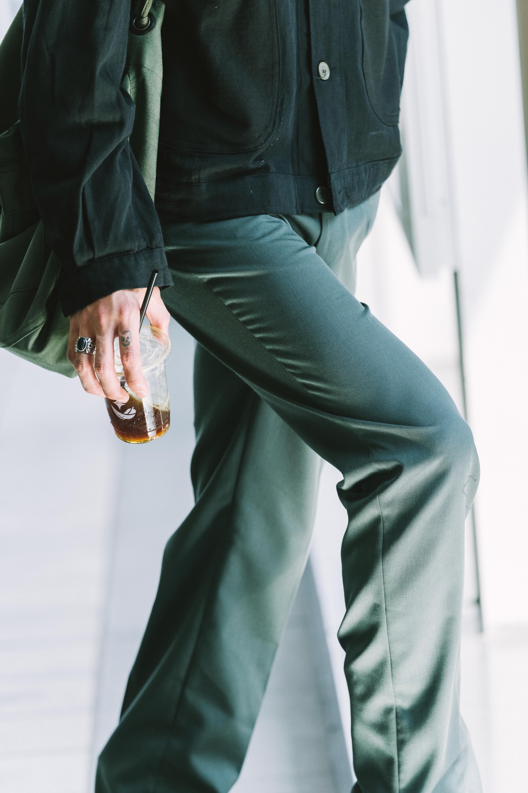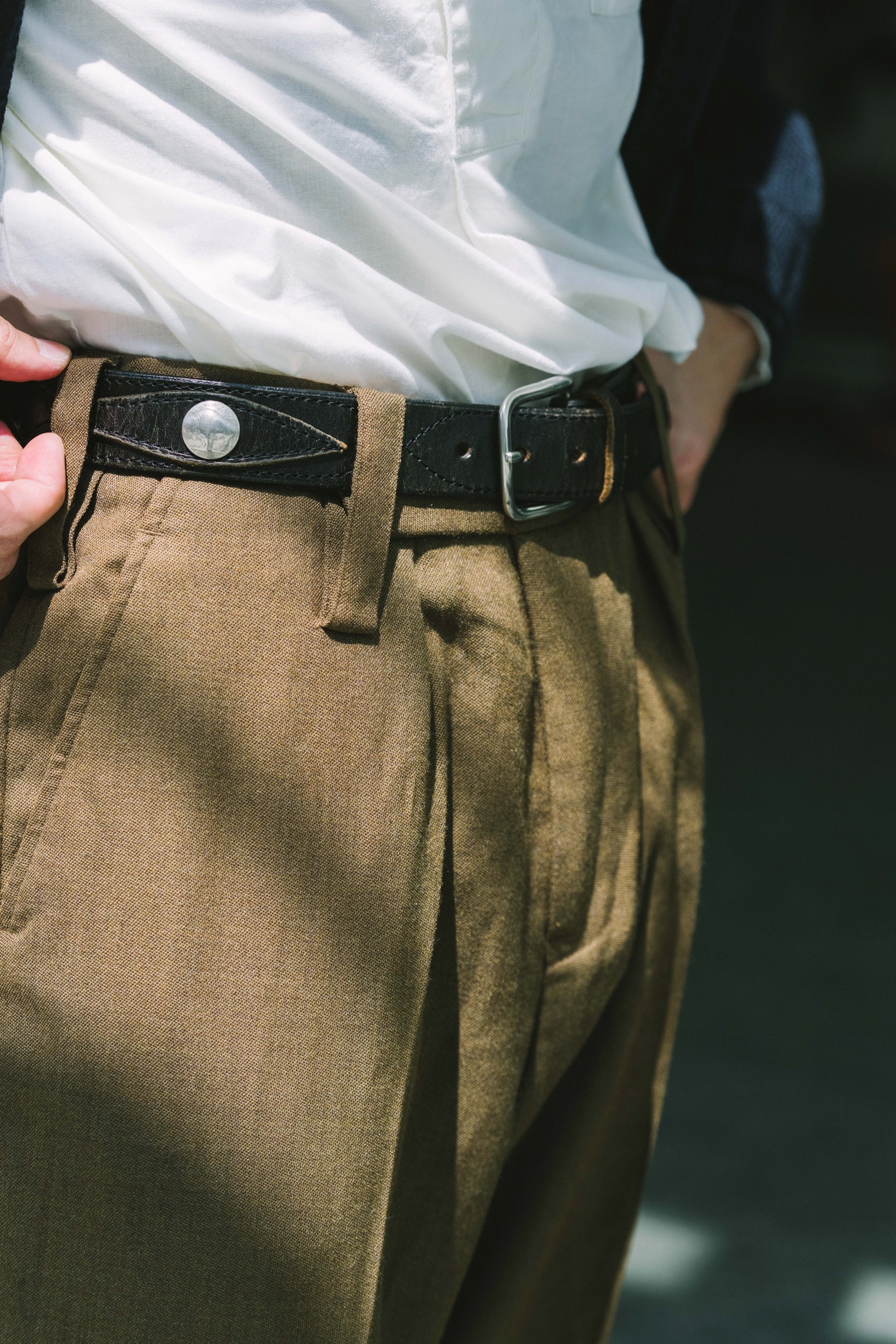 除了海軍,以中性俐落著稱的比利時歐陸軍的風格也能輕易迎合職場正裝的風格。溫和卻不失光澤的灰綠色,呈現安定的穩重感。較一般西裝褲寬鬆的褲身不完全緊貼、但仍然合身俐落,口袋旁特別縫製的皺褶凸顯正身的簡練線條感。