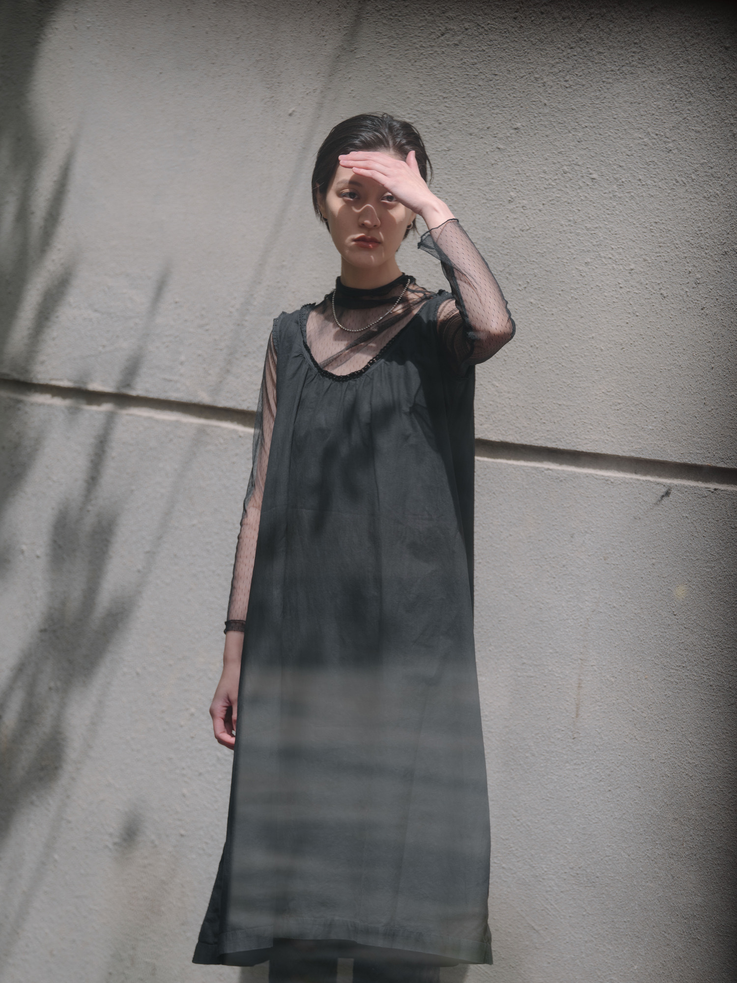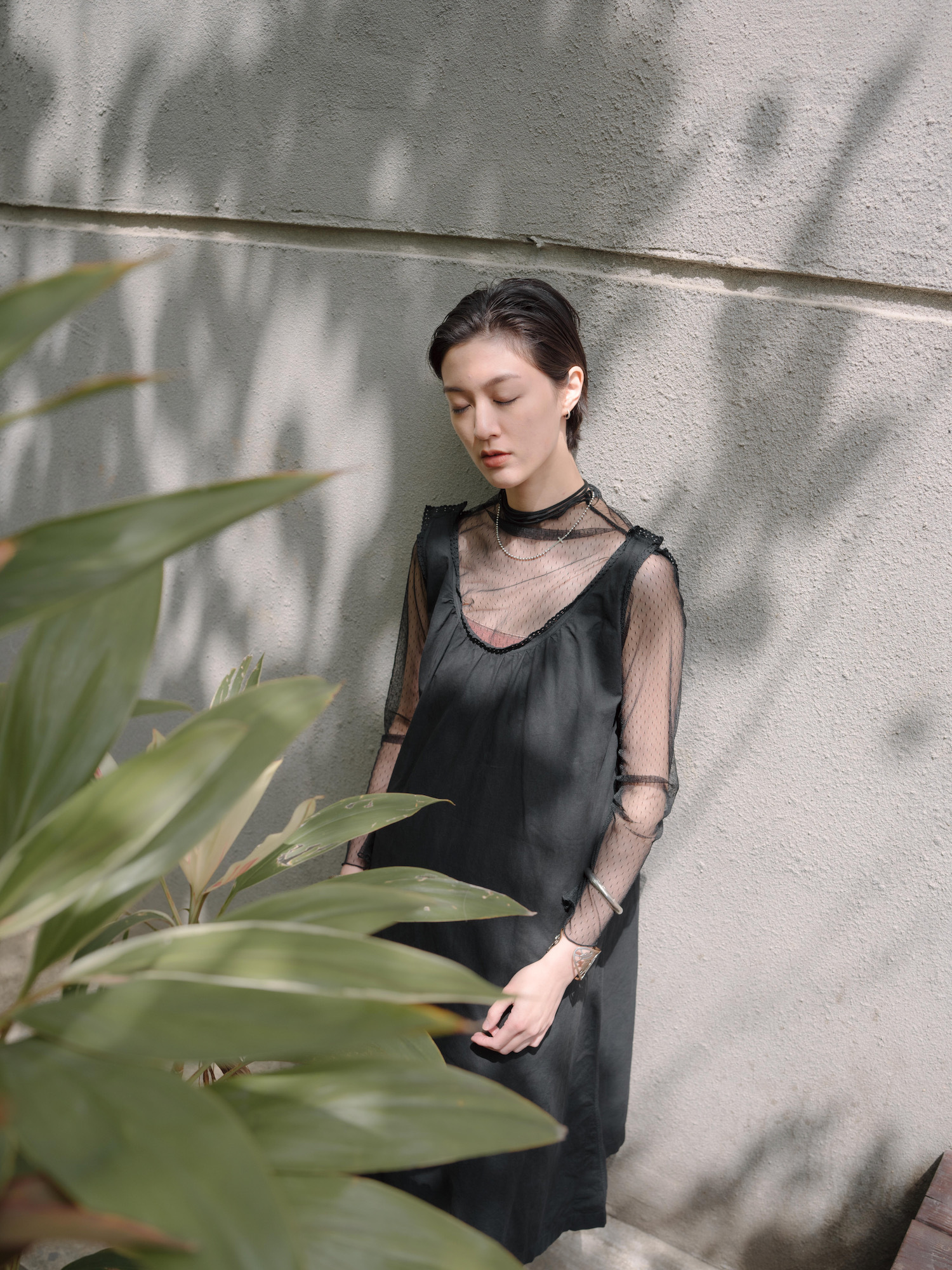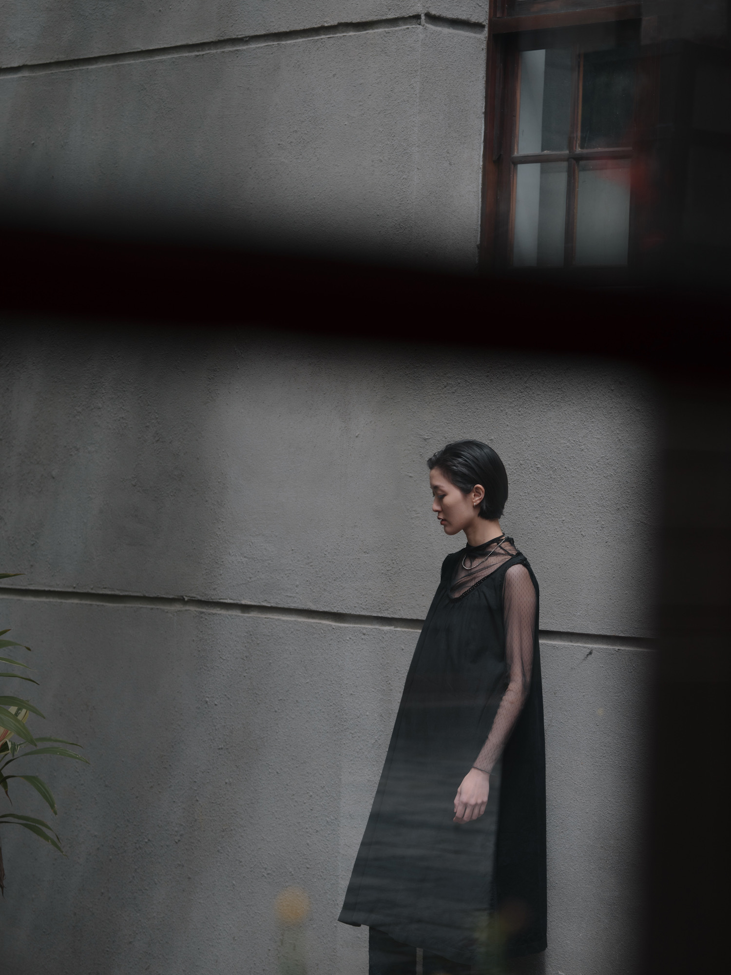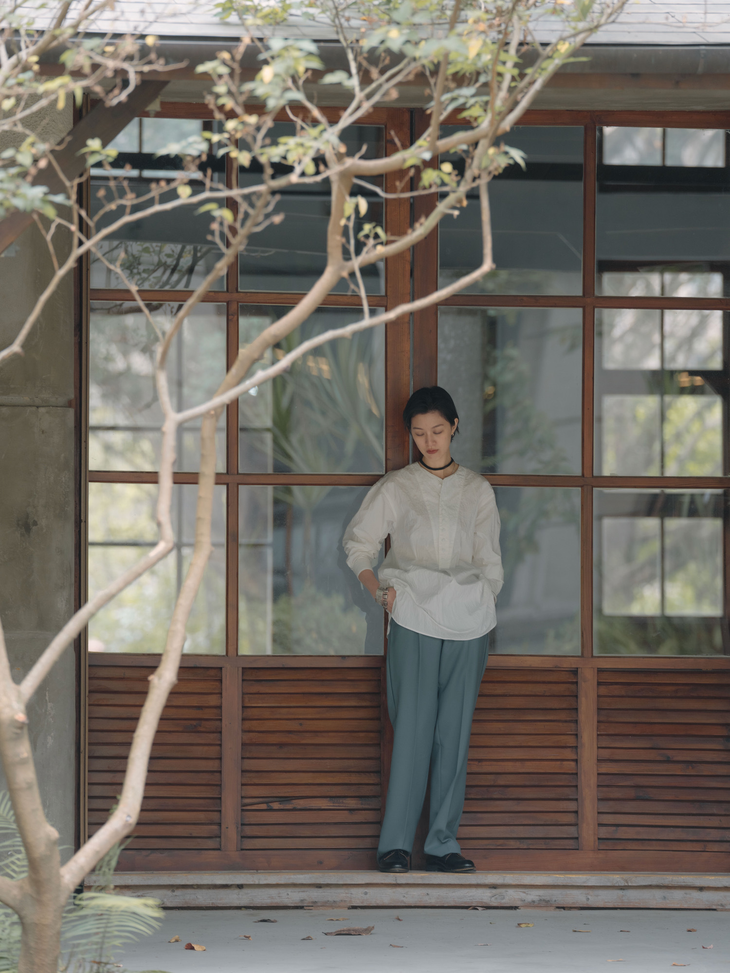 亞麻織的領口調和了蕾絲甜膩的形象,質樸恢弘的設計,能夠坦率也能夠甜美,細緻的亞麻編織,自然的紋理隨著行動而累積,形成歲月的足跡也是自身的印痕。