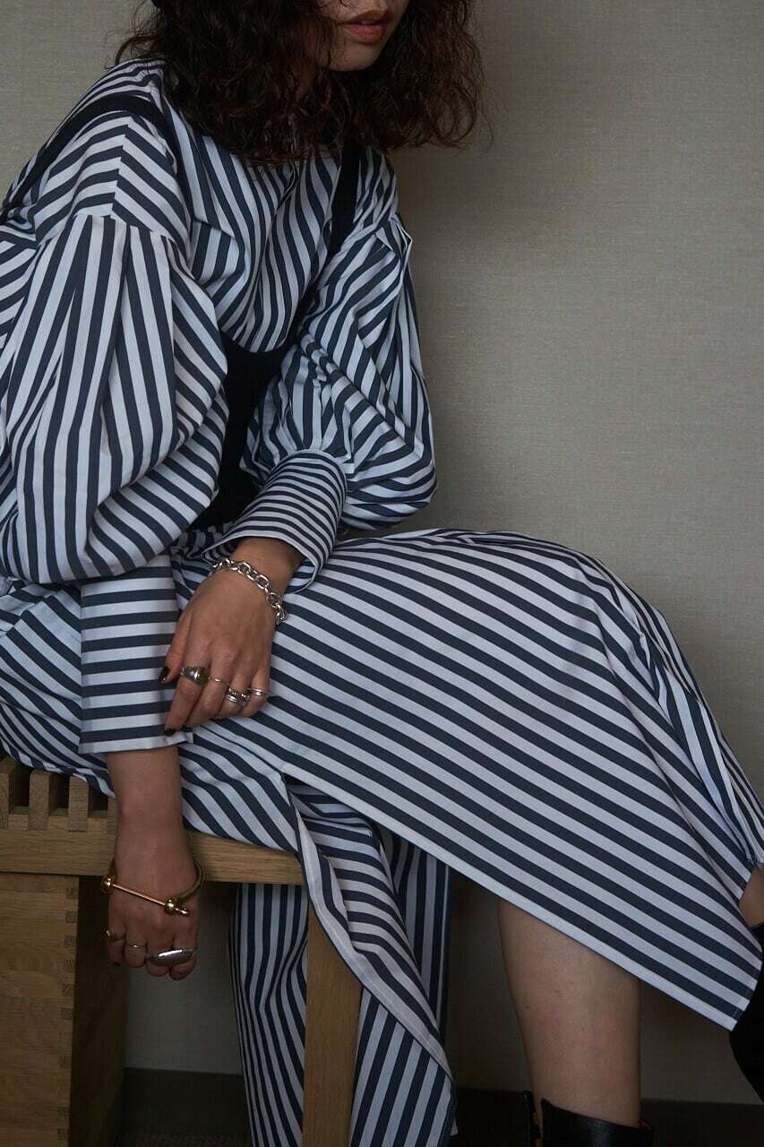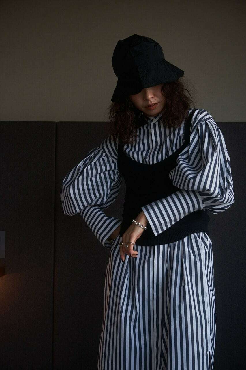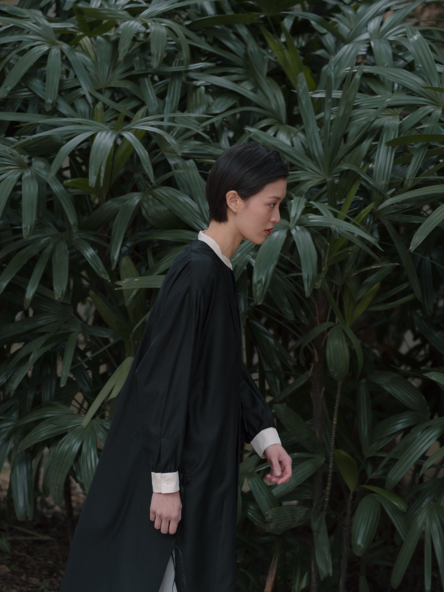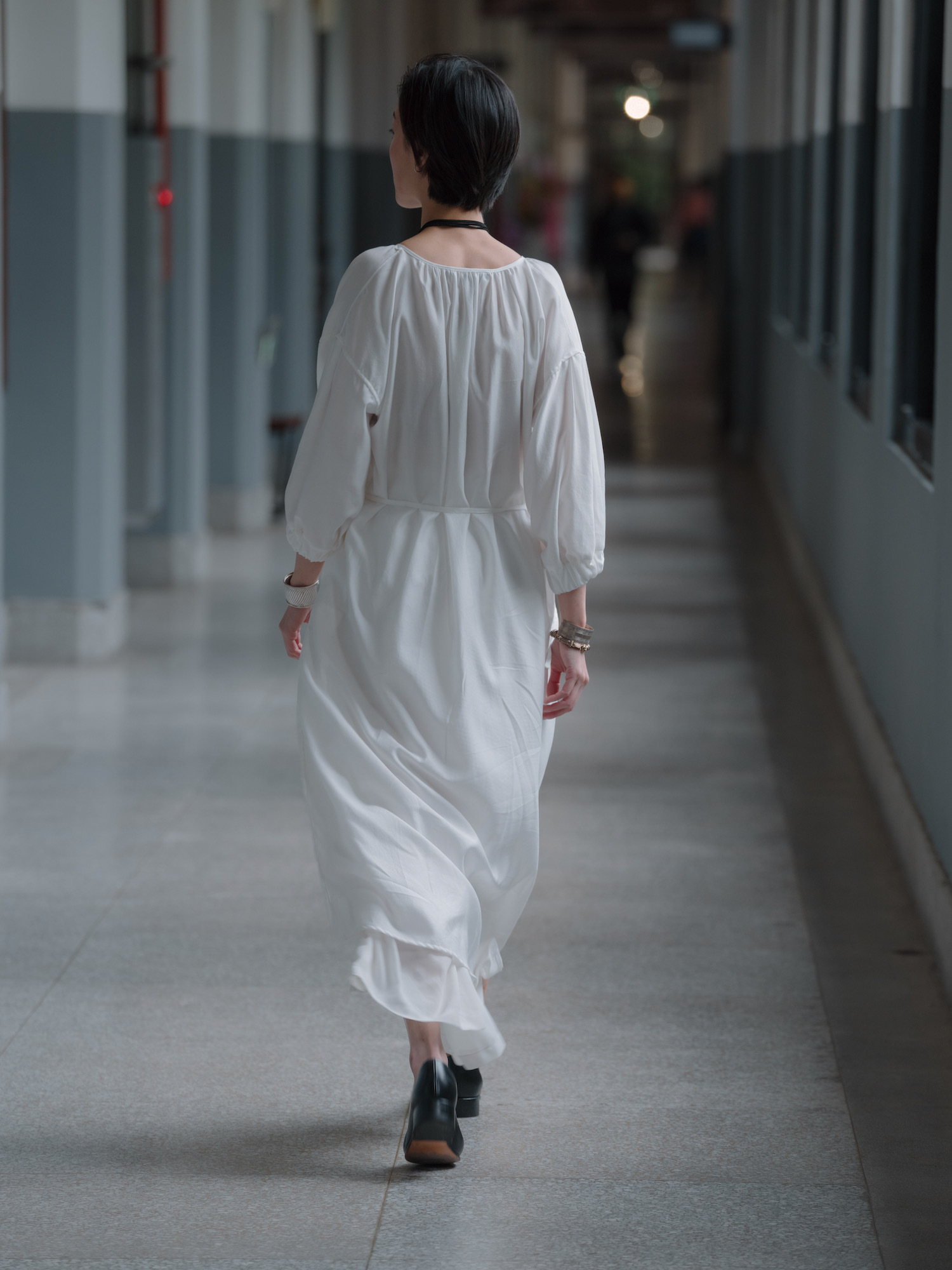 採用厚實不易起皺的面料,從上臂的蓬袖到袖口的窄縮,走動的時候在光影下畫出可愛的剪影。