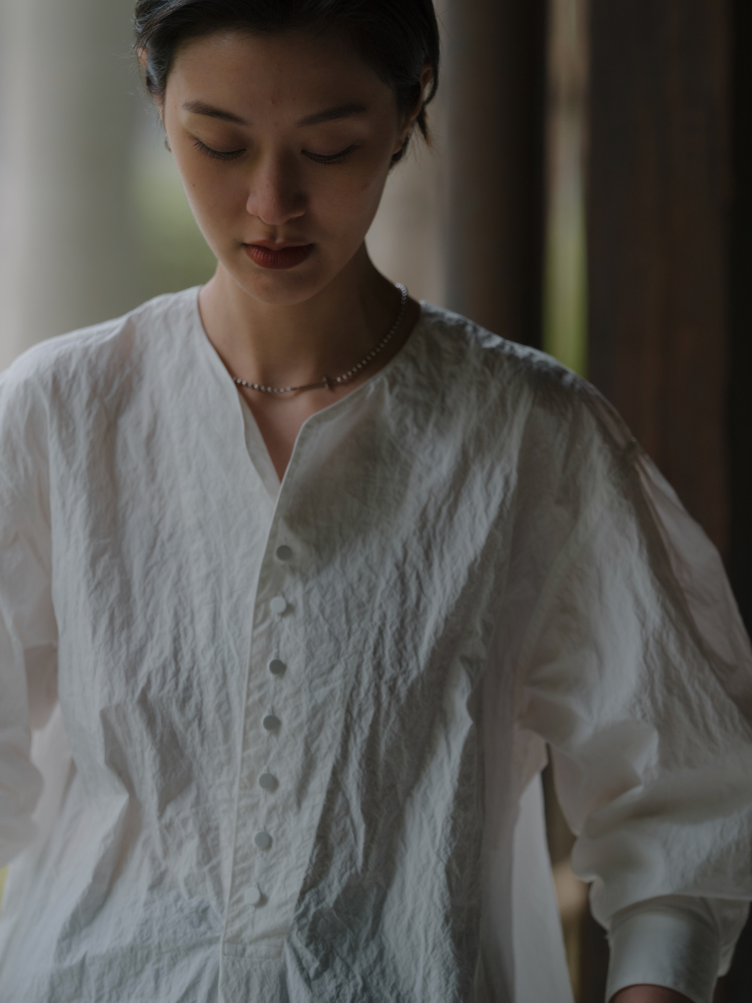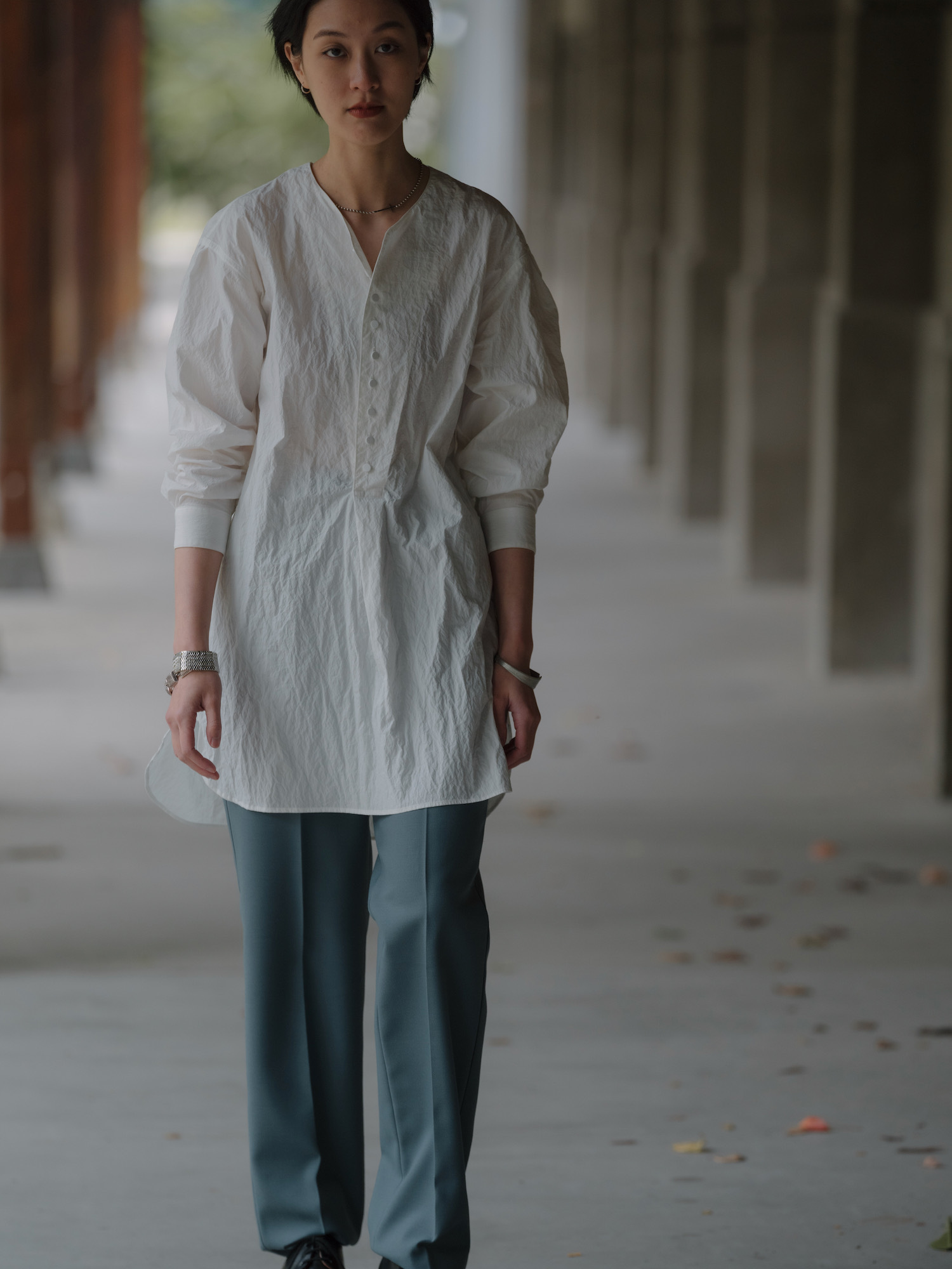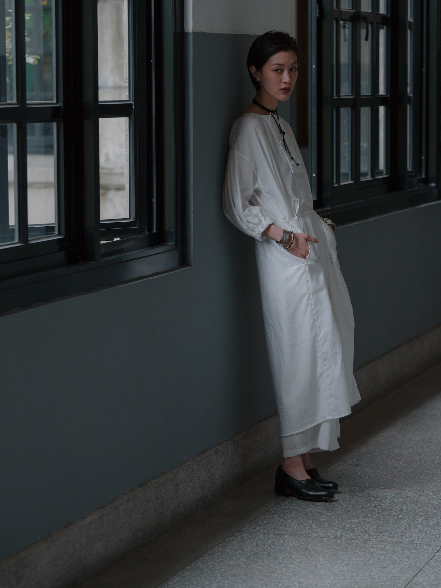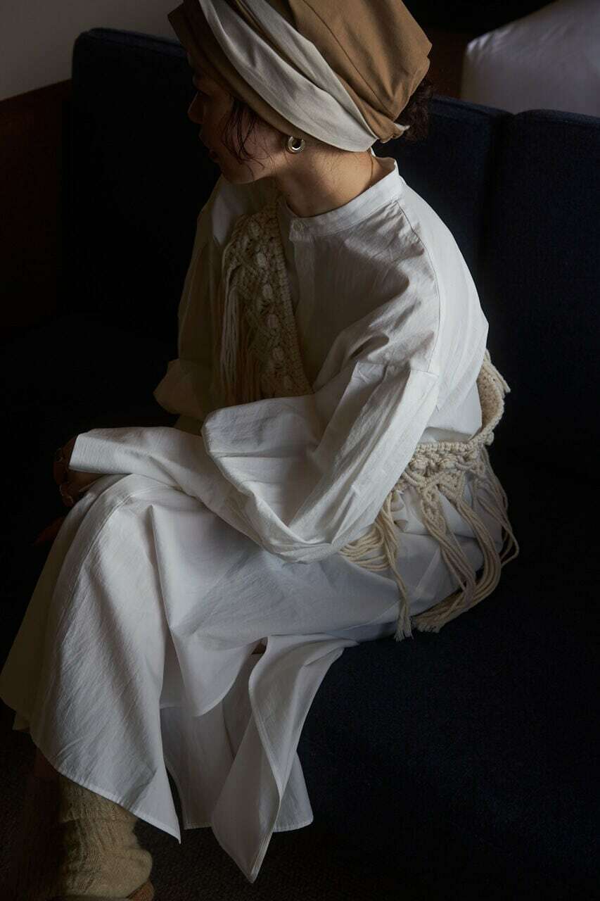 採用埃及最高等級的超長棉 Finks,以緩慢的梭織技術避免破壞沙線的張力,保留了棉花的層層疊合的蓬鬆與立體感。接近天然的 Off White 棉色在陽光下閃著光澤,側邊開衩的版型知性而別緻,下擺隨著空氣擺動而搖曳著。正在感受著這個畫面與想像的你,就從中體現了美的學問。