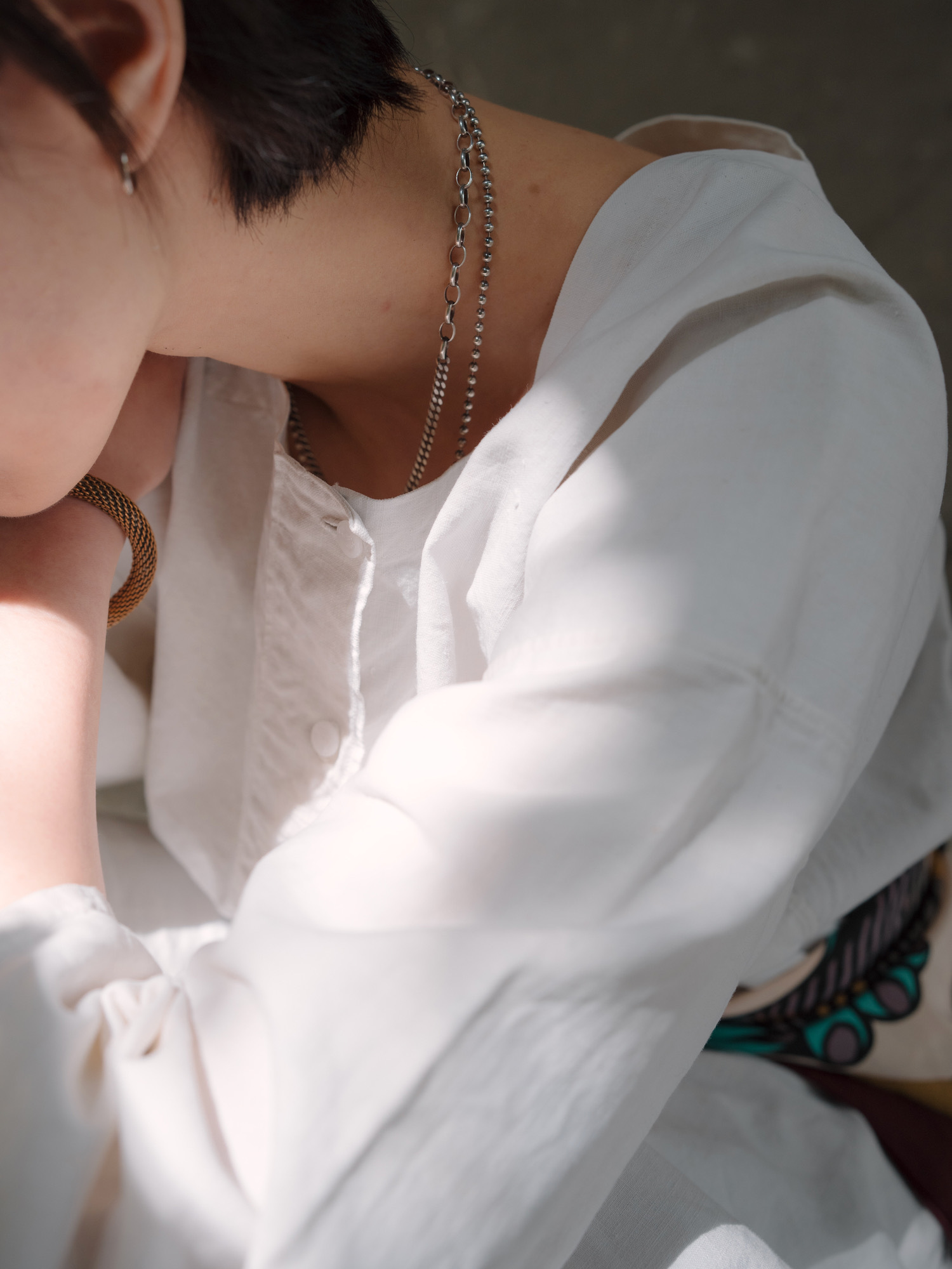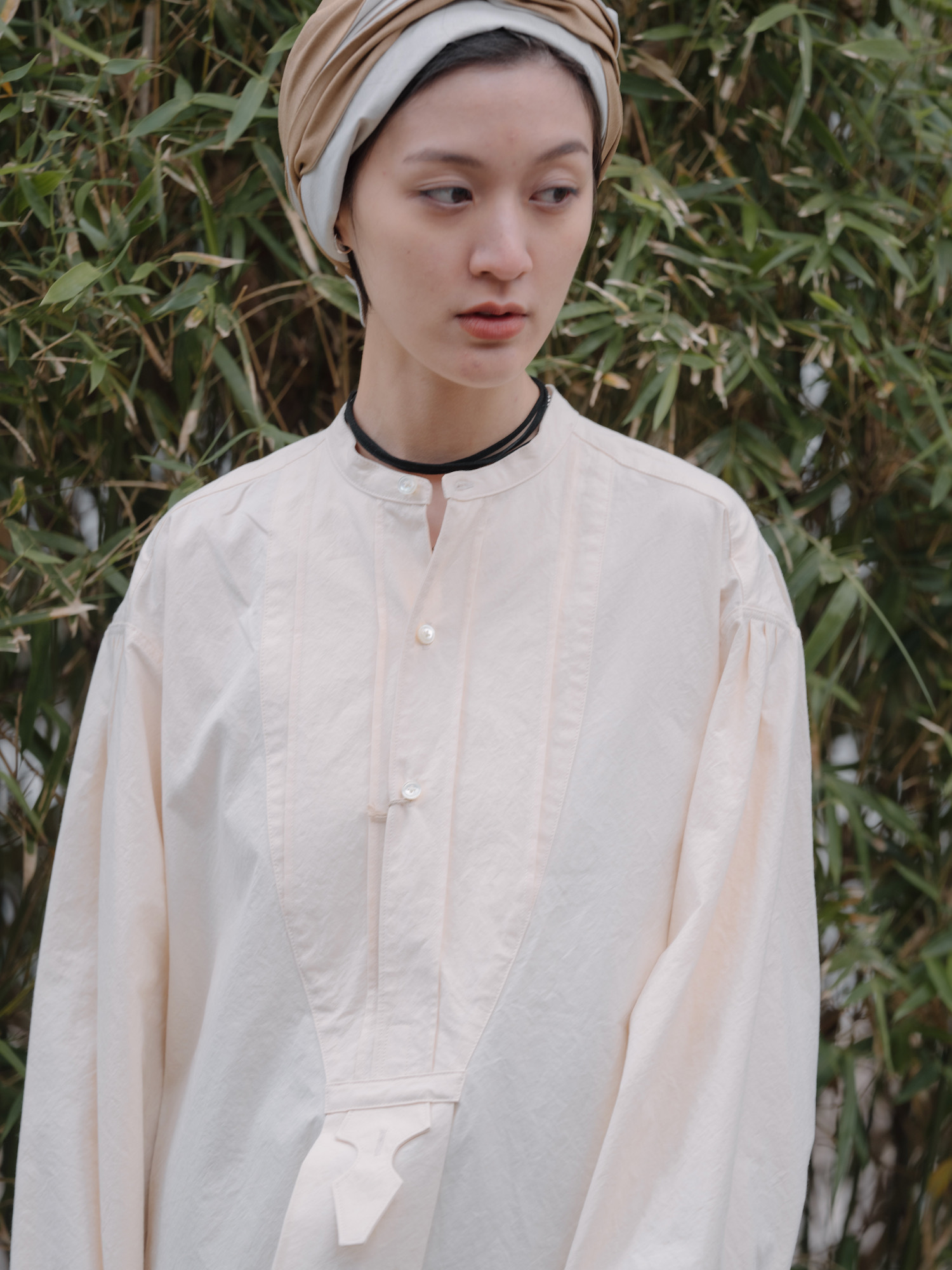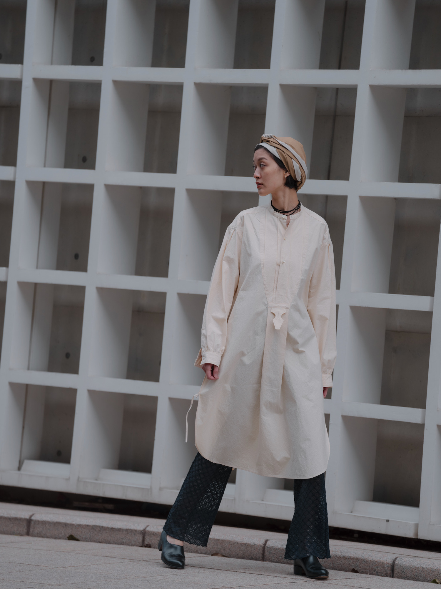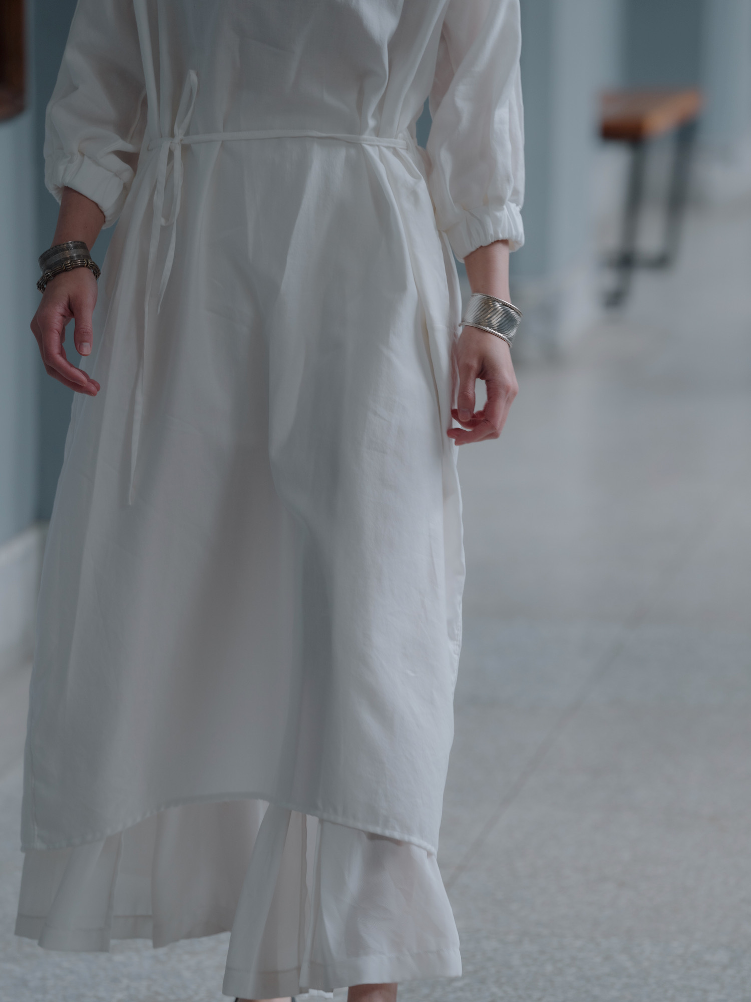 採用埃及最高等級的超長棉 Finks,以緩慢的梭織技術避免破壞沙線的張力,保留了棉花的層層疊合的蓬鬆與立體感。接近天然的 Off White 棉色在陽光下閃著光澤,側邊開衩的版型知性而別緻,下擺隨著空氣擺動而搖曳著。正在感受著這個畫面與想像的你,就從中體現了美的學問。