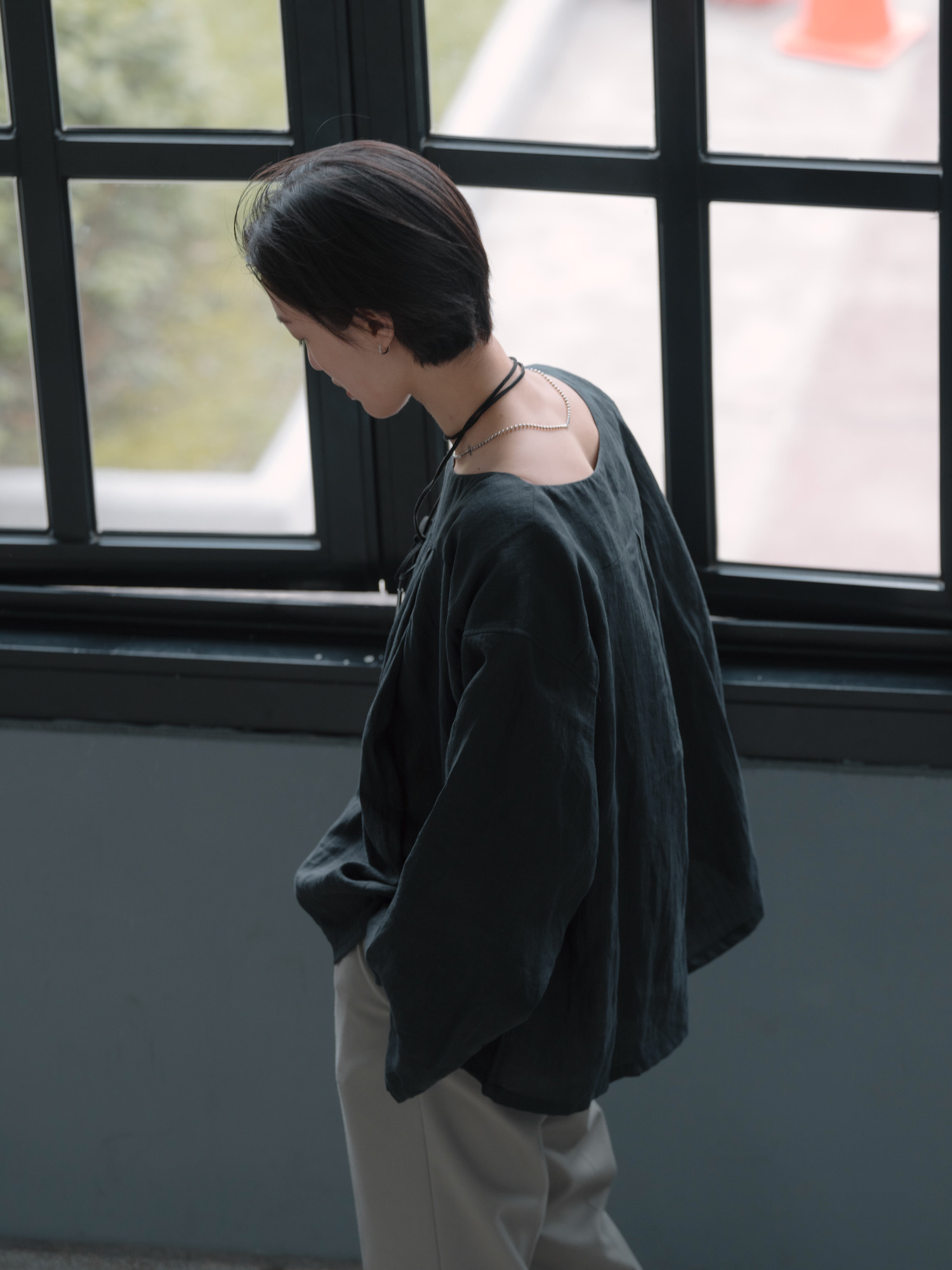 以天然的苧麻編織而成,麻織布料在暑氣之間輕盈、在微涼的天氣下乾爽。清麗的船領開襟與俐落的直袖擷取了頸部到肩膀的流線,細緻的打褶與背面的褶線拉伸了身型的立體。