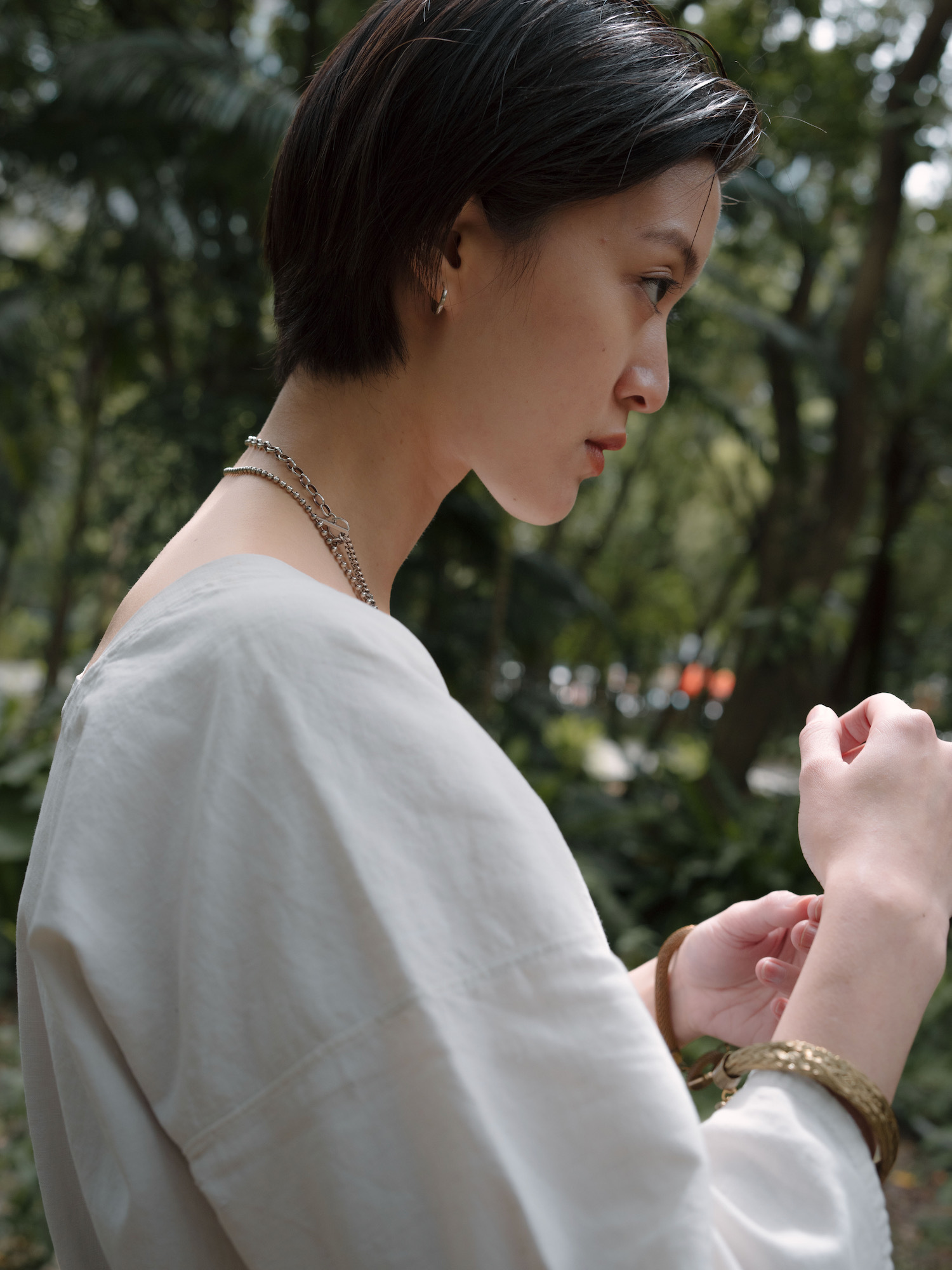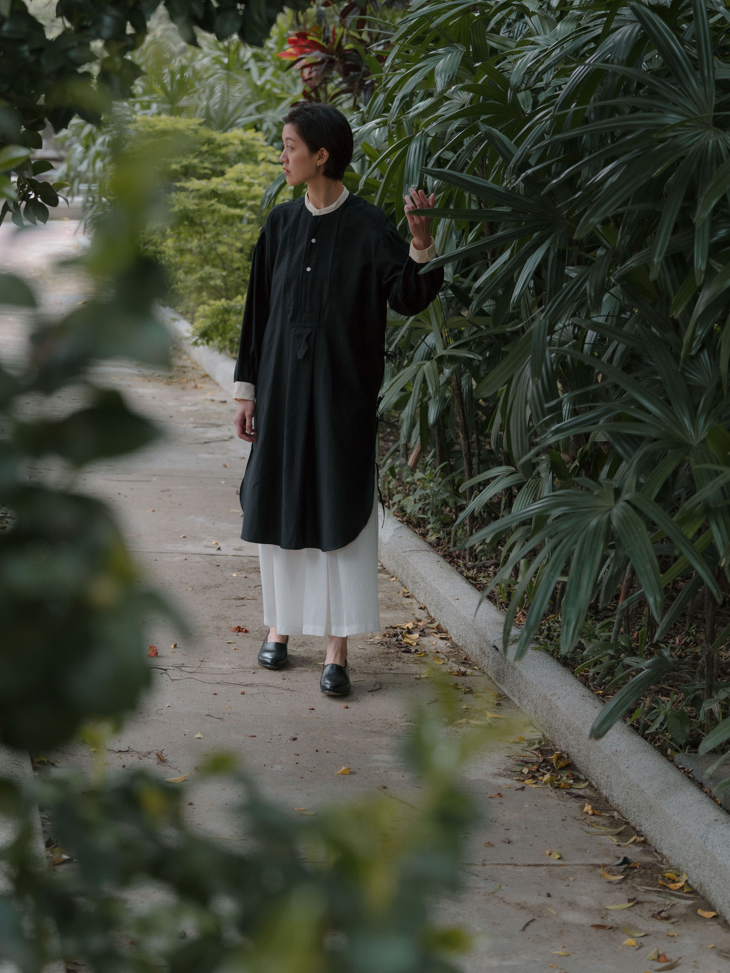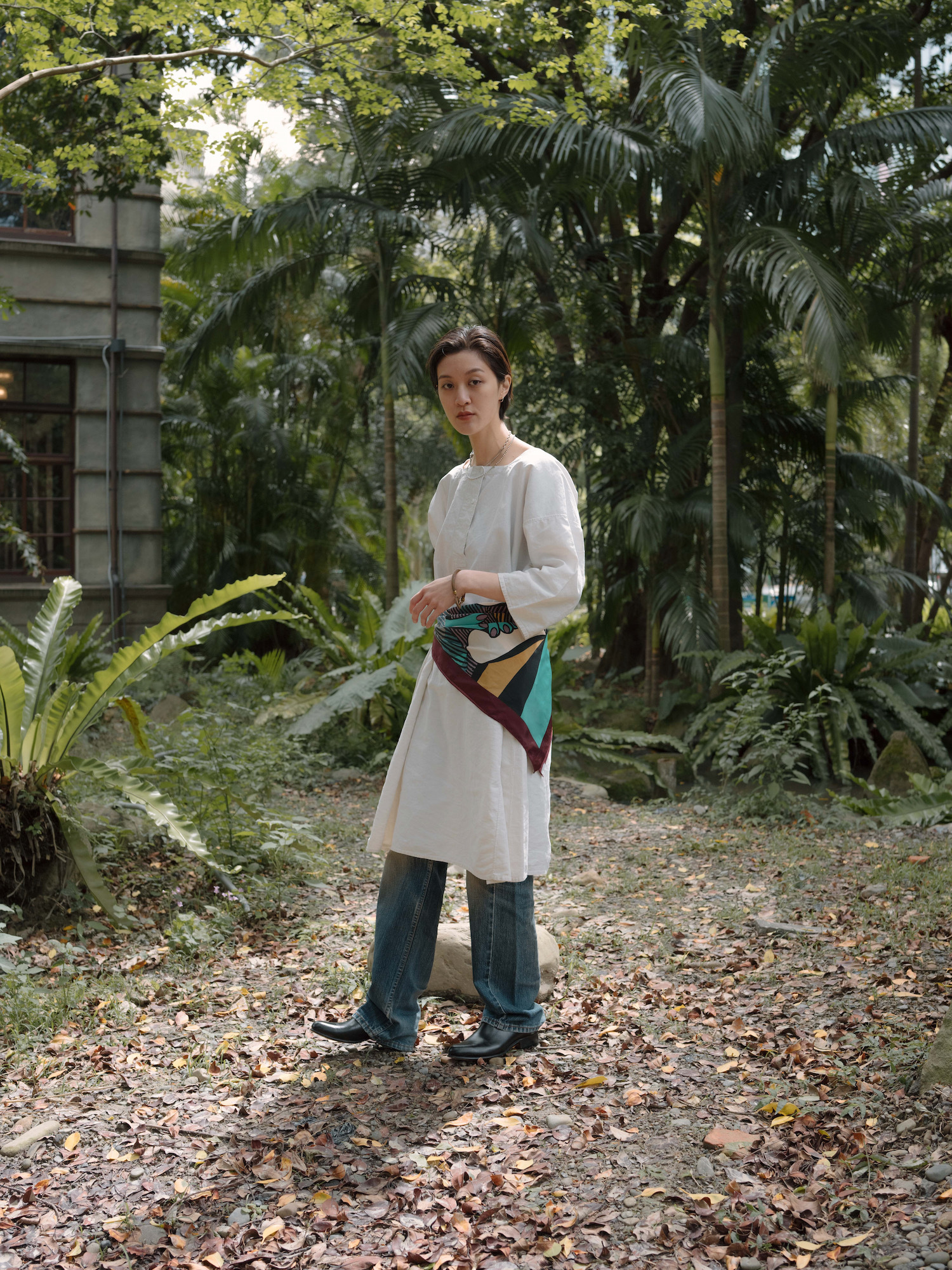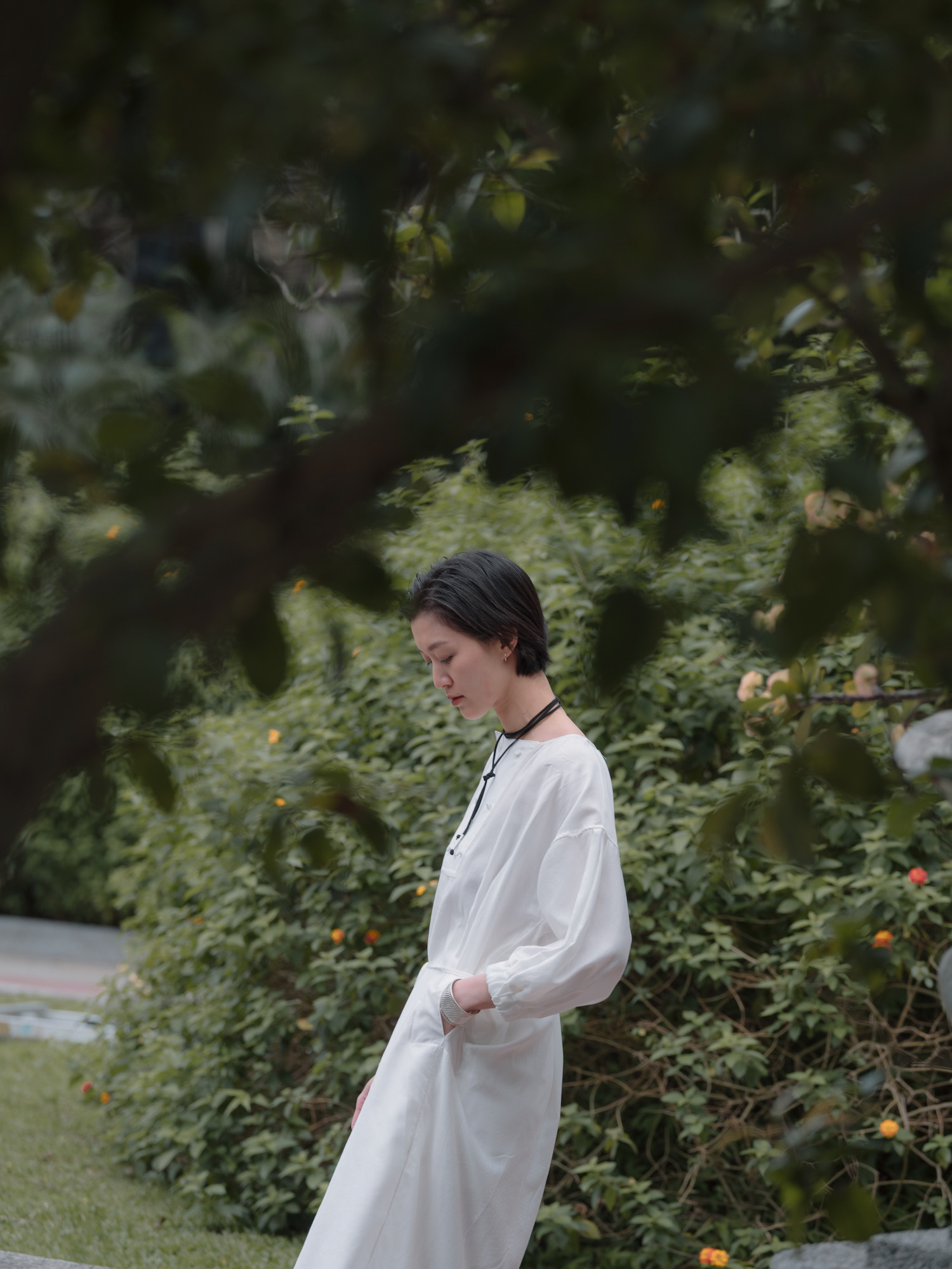 自然色的亞麻反射清麗的白。方形的船領帥氣而迷人,像是摻了蜂蜜的甘草,苦澀中的甜美一解夏日的豔陽。恰到好處的七分袖口簡約,鐘形的寬版長衫俐落而爽朗。