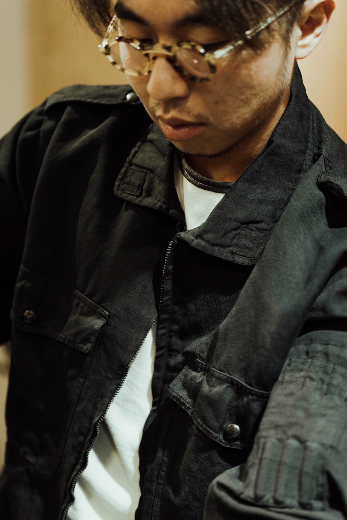 小馬身上的飛行員夾克來自70年代義大利AMI的設計品,短版的剪裁和鬆緊束腰可以凸顯修長的身線,上身較為寬鬆的版型搭配小巧的拉鍊,肩上的肩帶和每一處的細縫線都耐人尋味,胸前的大口袋也充分展現了義大利追求的現代服飾感,經由Rolling On染製好搭配的黑色,著實是一件簡單、卻深藏細節的老品。