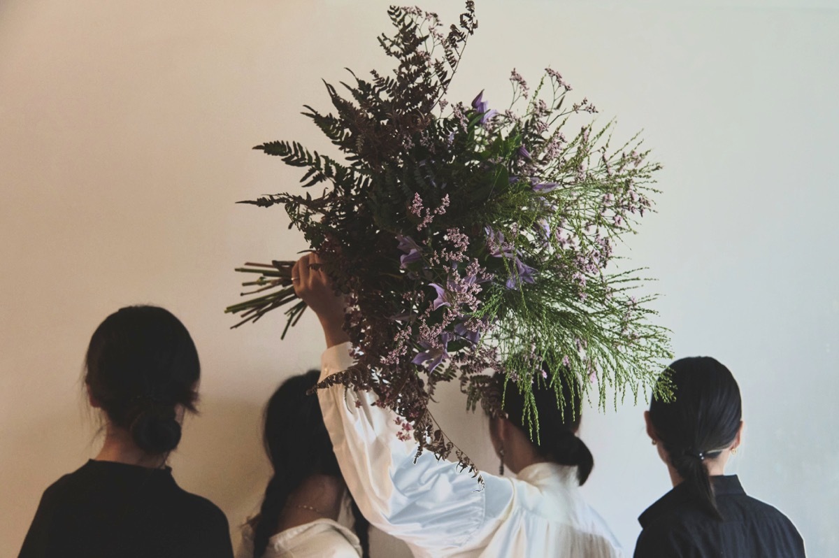 看著穿著HAVERSACK 的陳曦在面對花時的神情與舉手投足之間的氣息,慢節奏的呼吸延伸出從衣袖、指尖到花材上的流動線條,勾勒出這一幅綻放地令人屏息的藝術體驗。