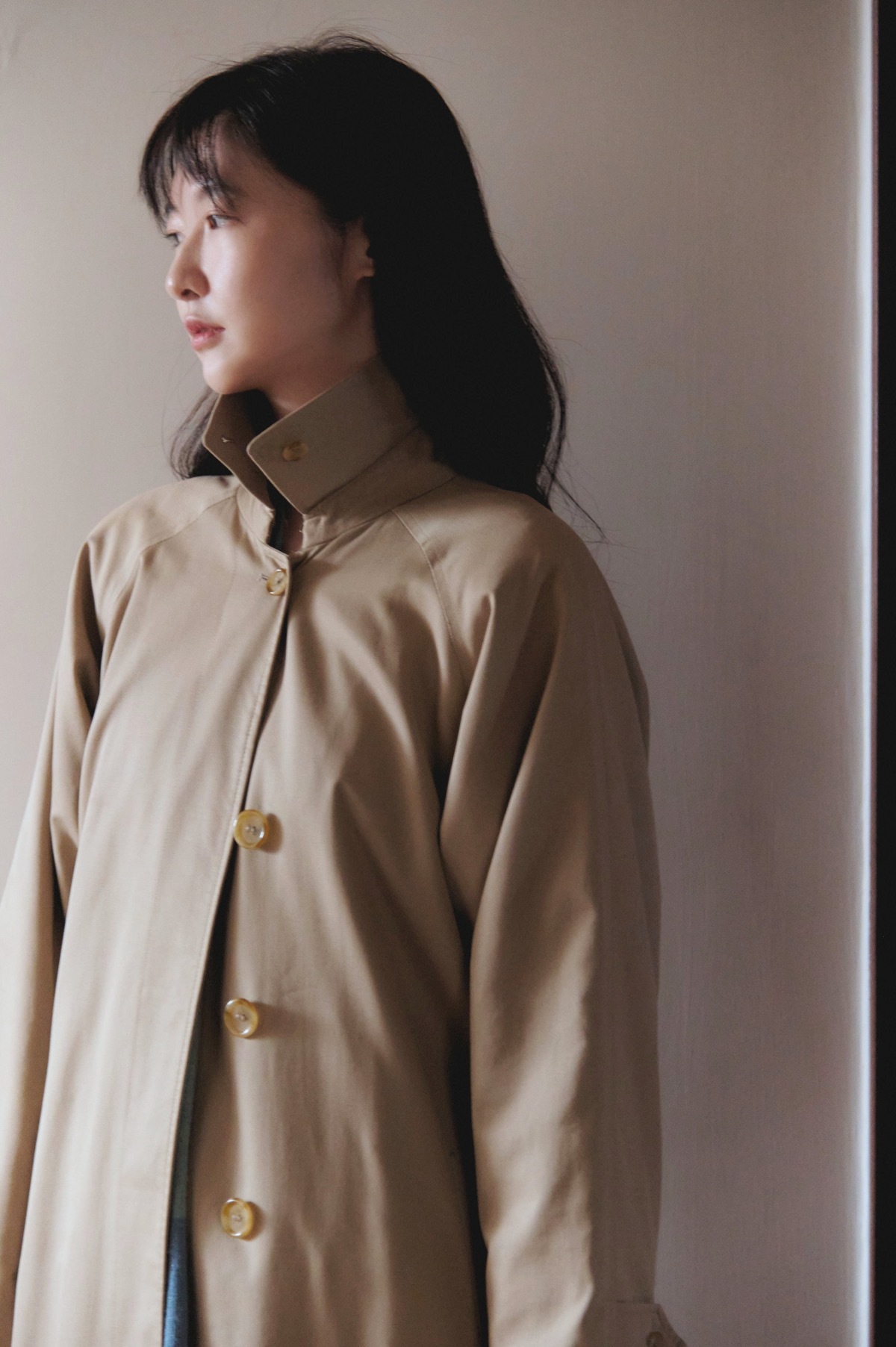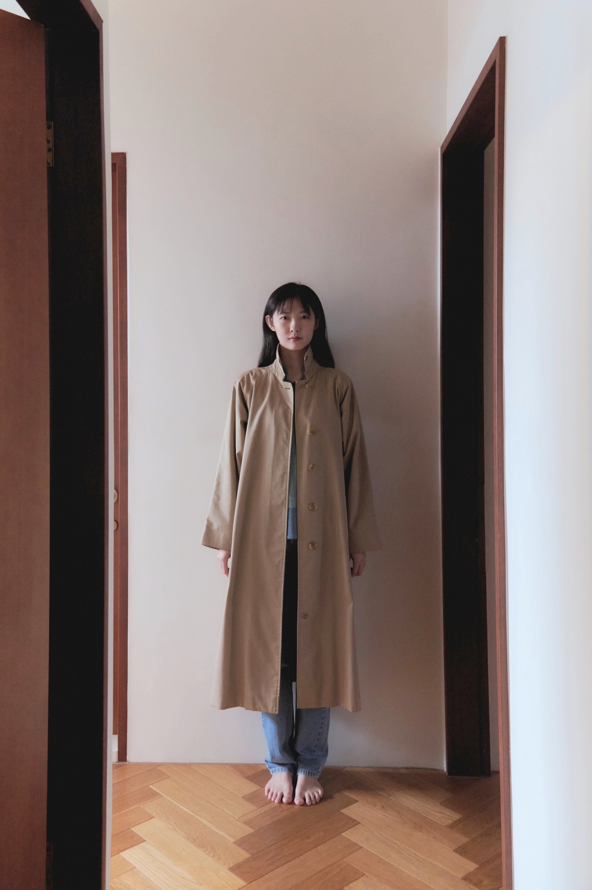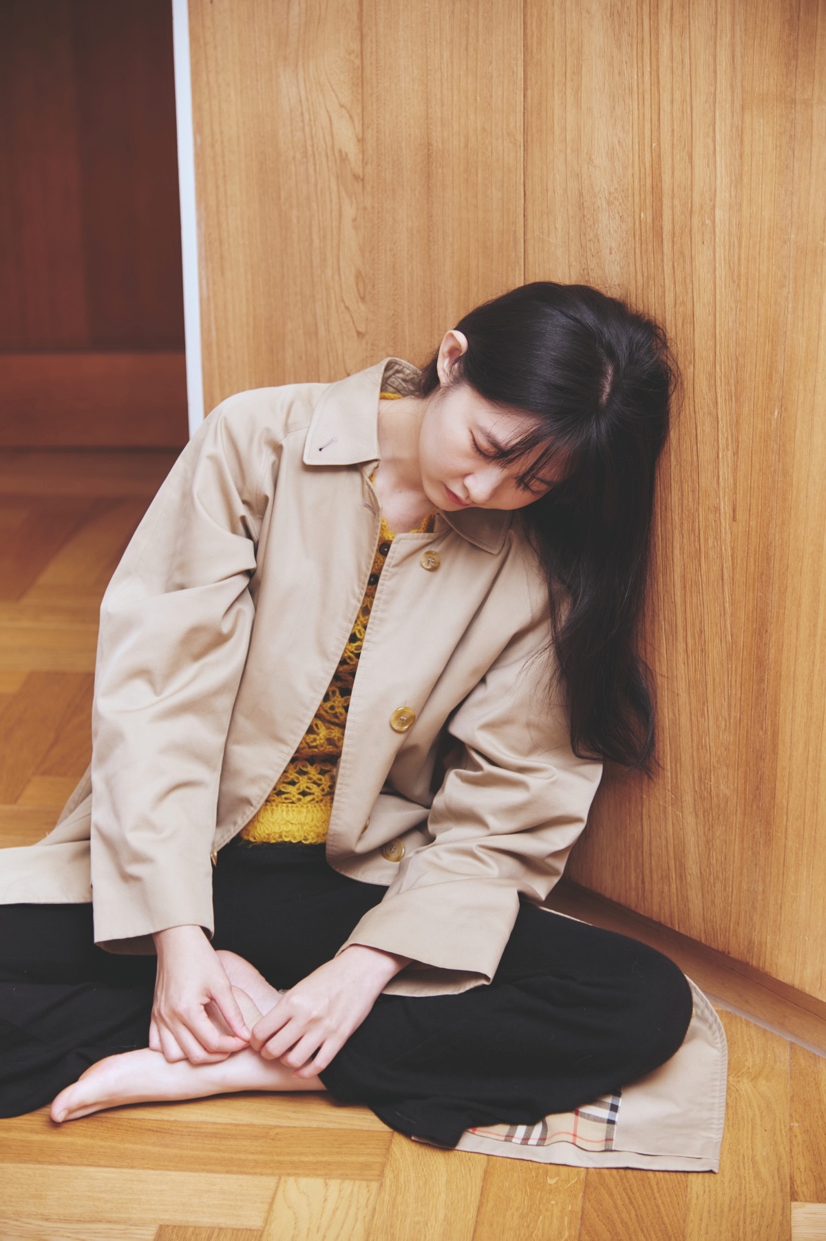 Vintage 毛衣的設計結合彈性合身的 Levi's Jeans 牛仔褲,俐落的版型讓腰臀線感到自在,天氣稍冷時再配上 Burberrys 經典風衣,從穿著的選擇中展現自己的需求,也更能感受自己。