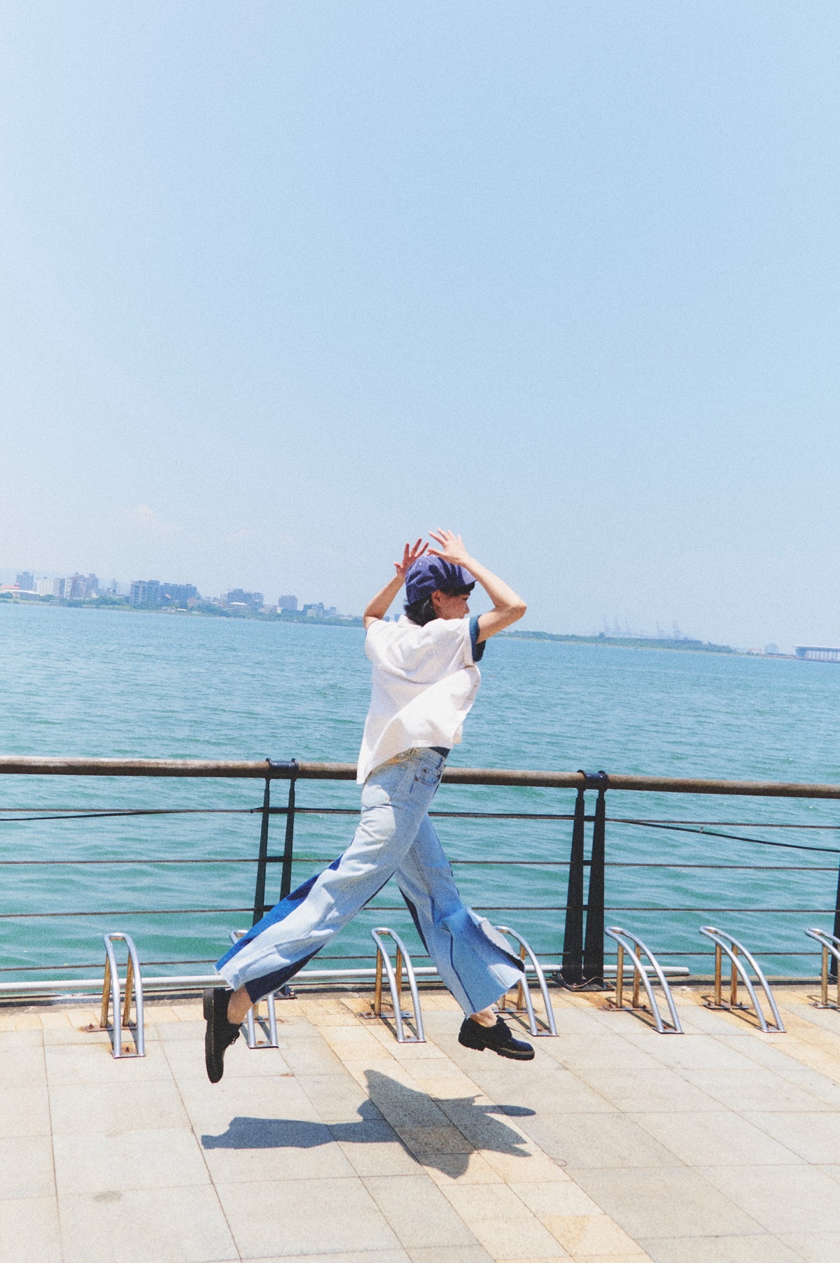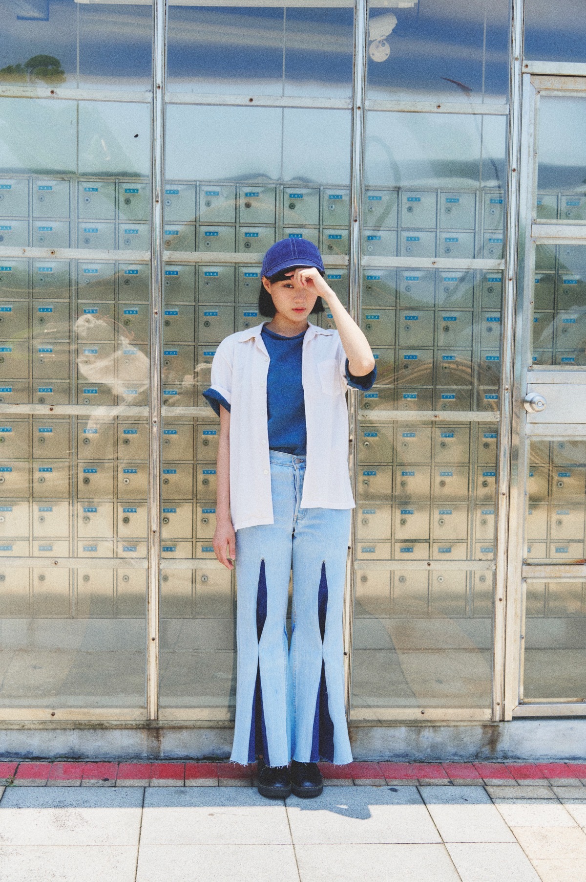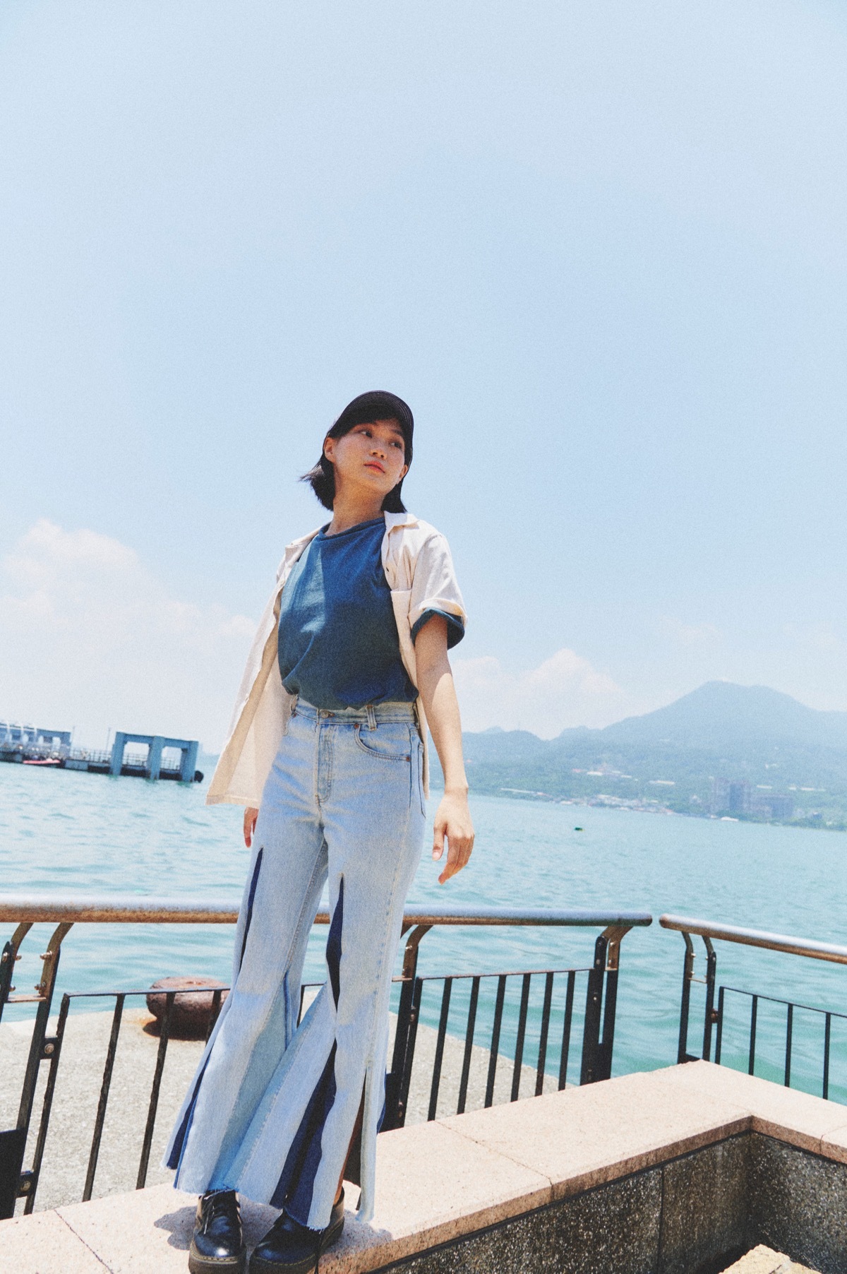 對應的下身,選擇 REMADE F5 系列的牛仔拼接喇叭褲,有型又充滿巧思,在清新的色調中營造出帶點俏皮小男孩感的洗鍊風格。