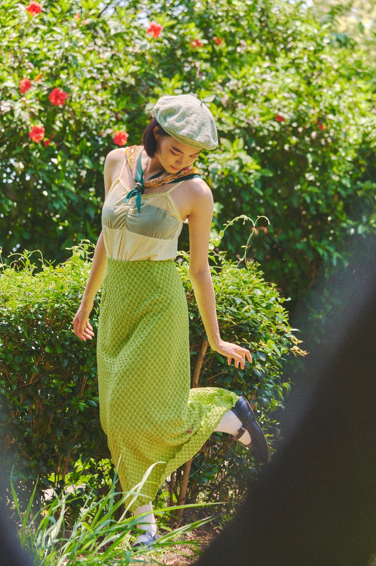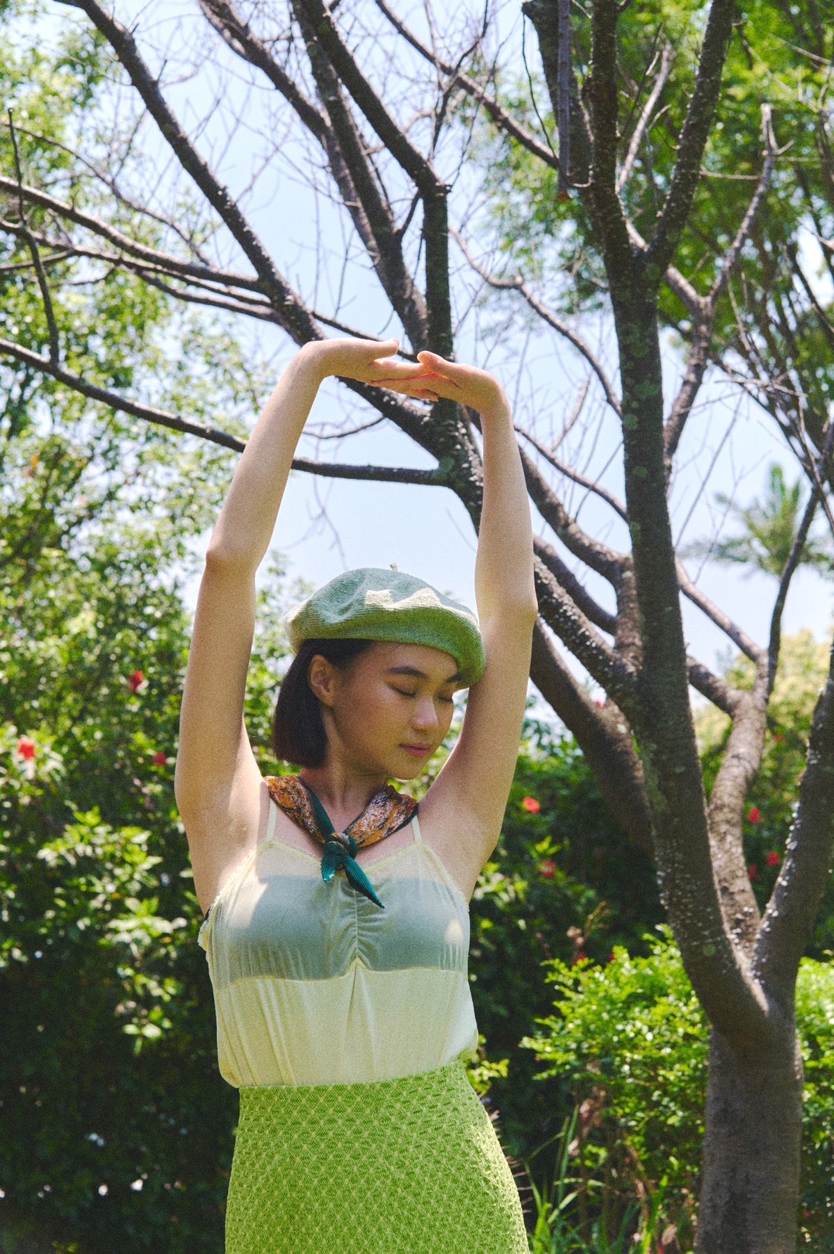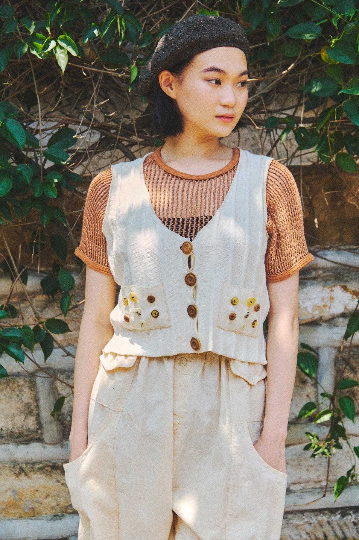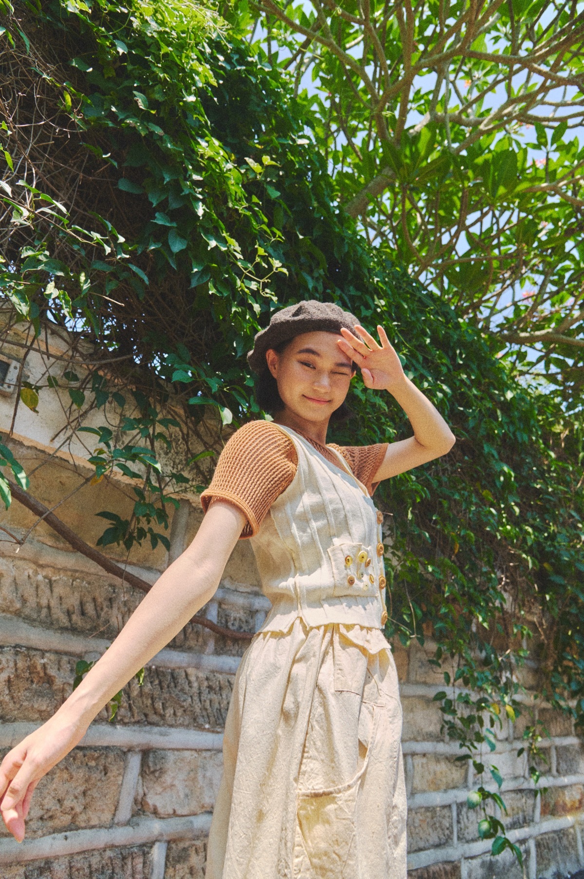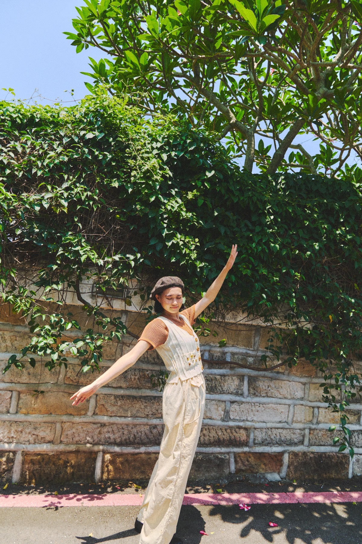 在多色的 F5 Vintage Danish Army Mesh Shirt 裡頭,毫不猶豫選擇了橘色,如柑橘汽水般的奔放,精神也跟著輕盈了起來,下身的米白色 F5 Vintage 50’s Bulgarian Army Ivory Snow Pants,寬鬆的褲型讓一舉一動都無比俏皮,再搭上同色系 Vintage 鈕扣針織背心與 Le Béret Français - Summer Berets,用溫潤的色澤迎接熾熱的氣溫。
