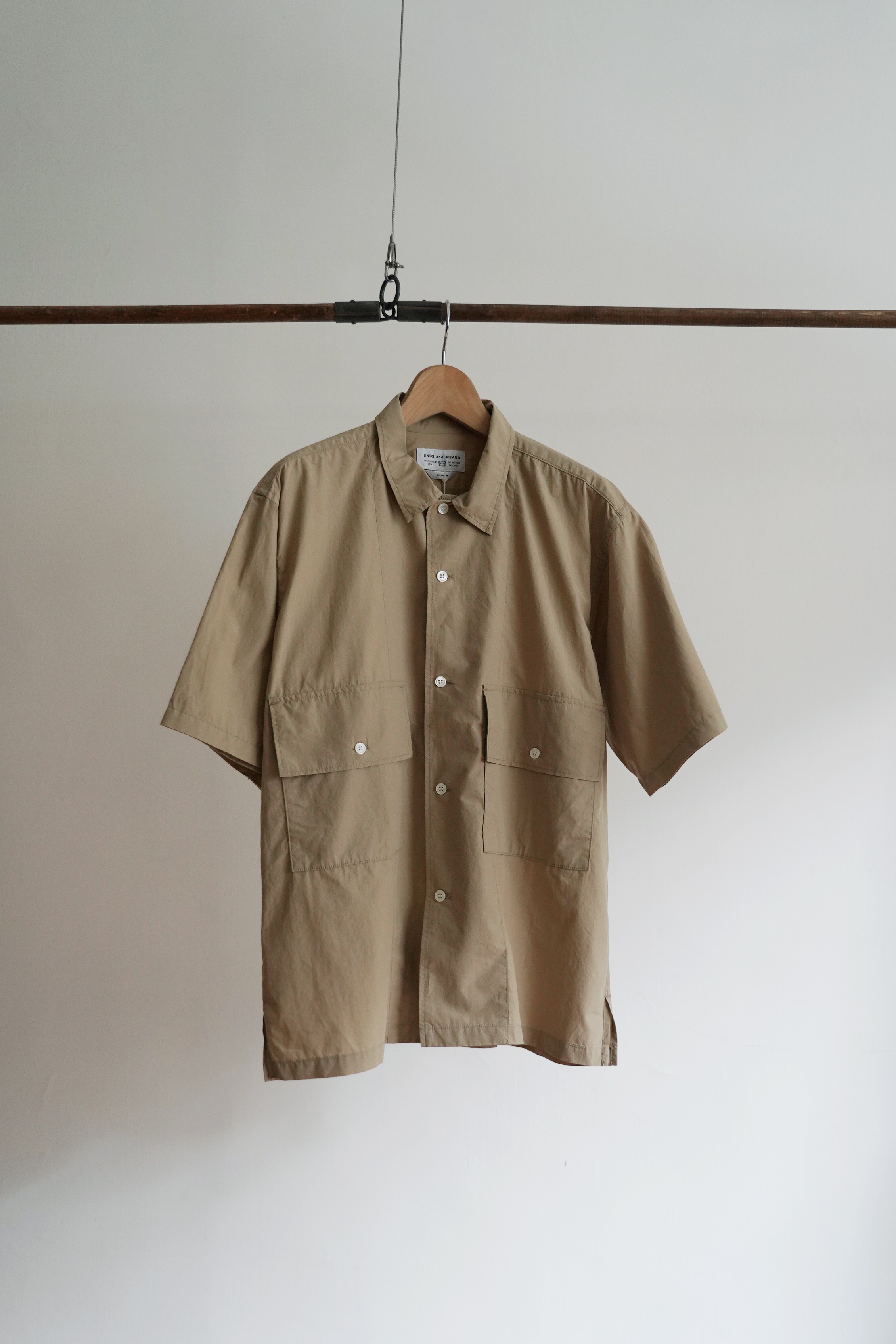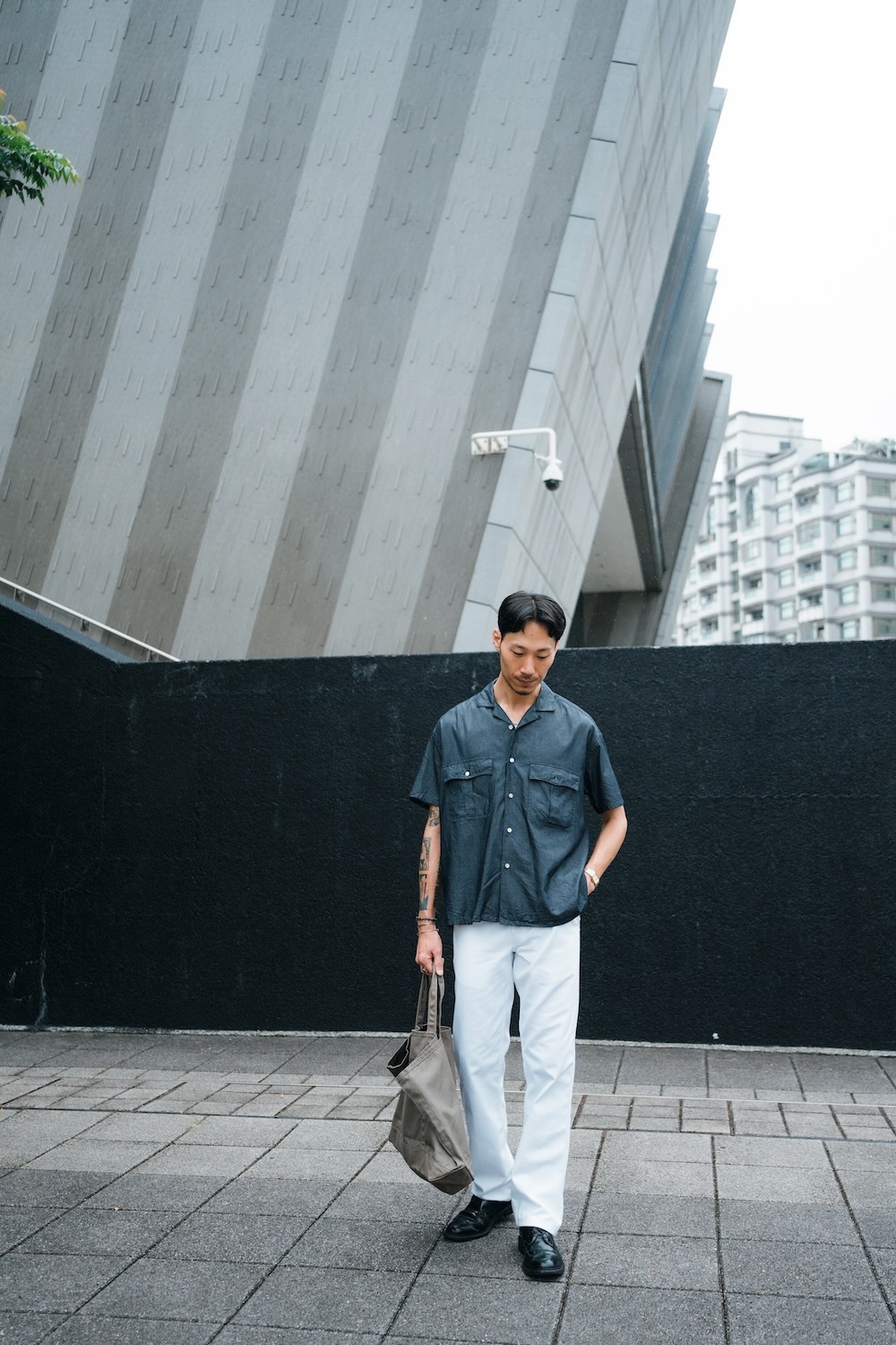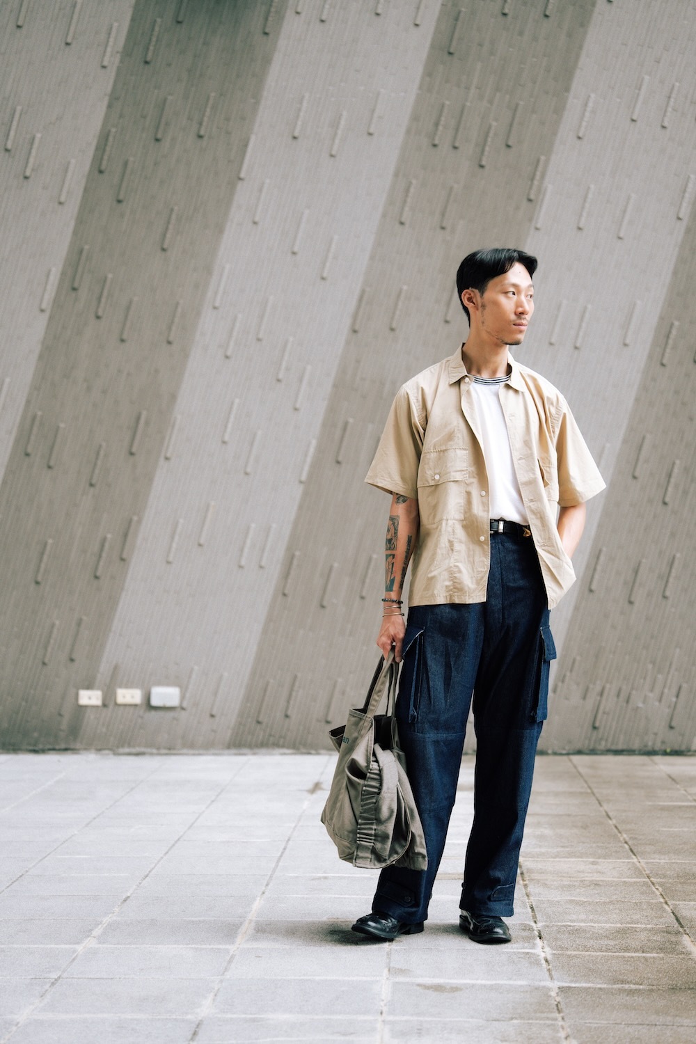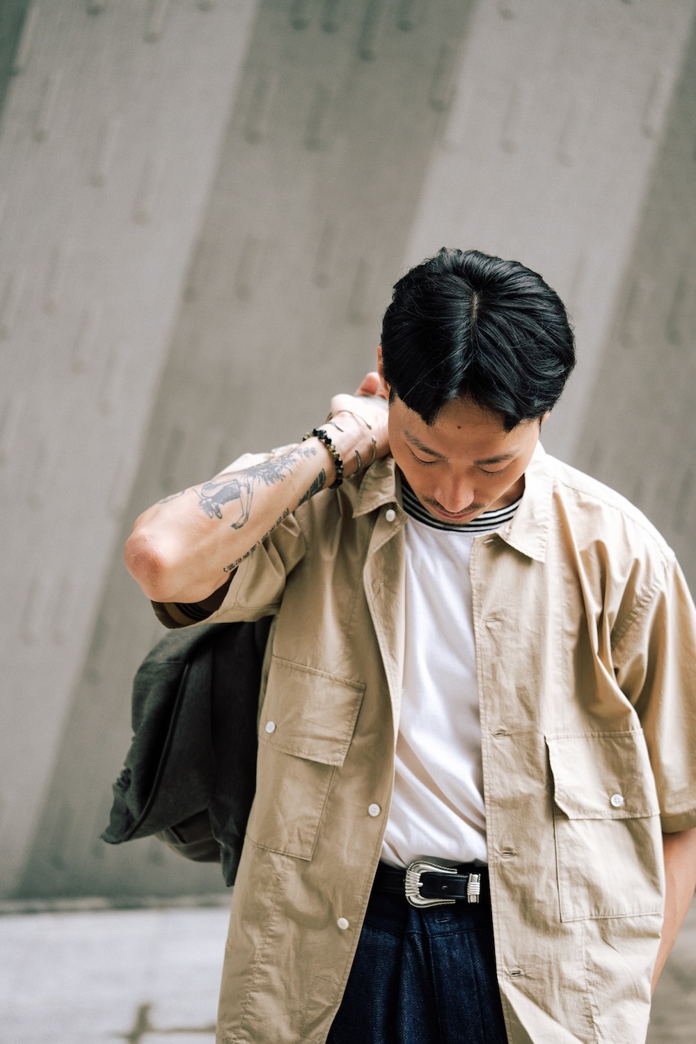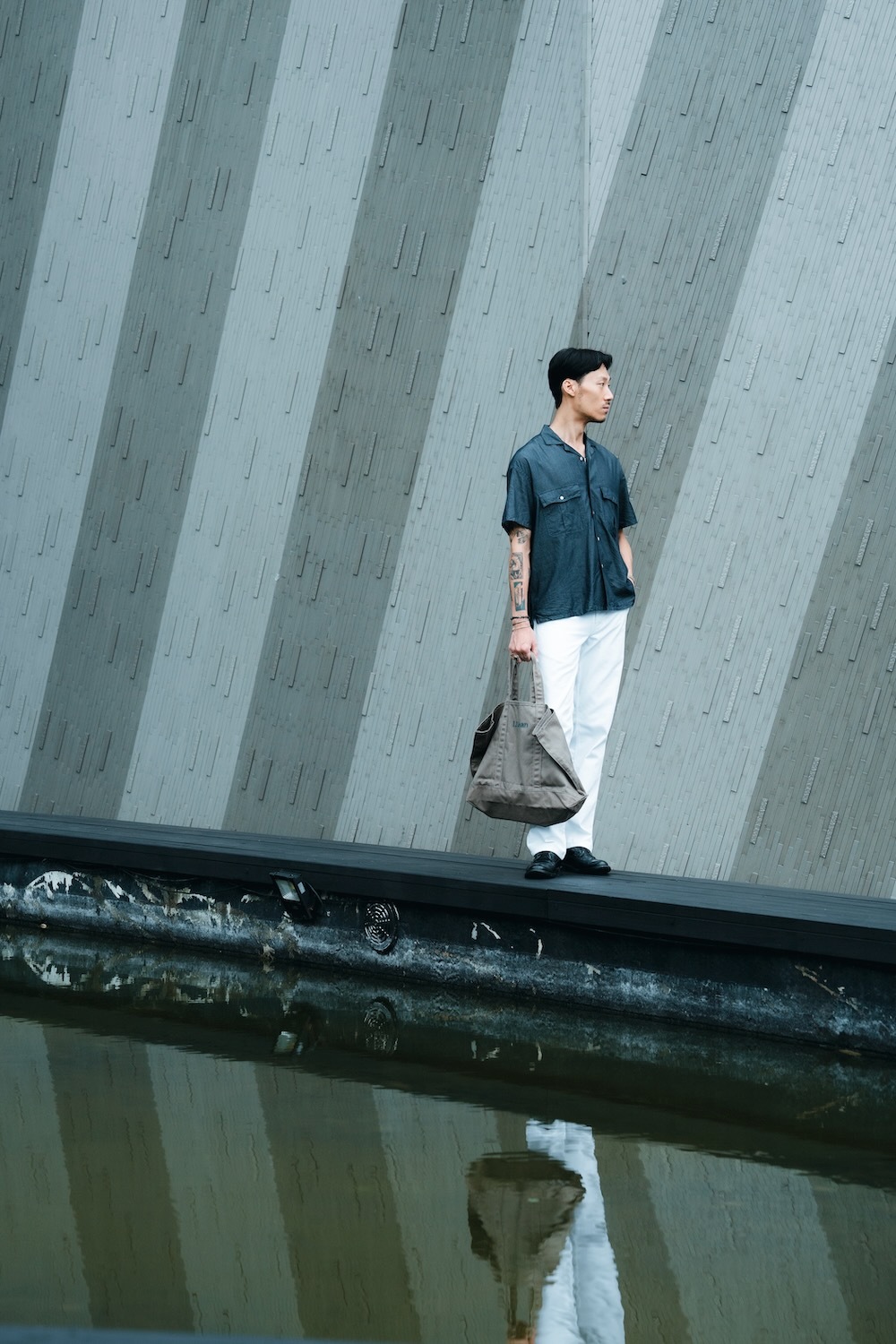 品牌夏季經典定番Corfu Shirts 。布料是採用了線細密度高的打字機布料外,還添加了10%的亞麻,實著後感非常清涼舒適。版型則是的Boxy箱型剪裁,搭配寬鬆直筒的HOUSTON - Denim M-47 Pants,讓整體造型簡單大方。