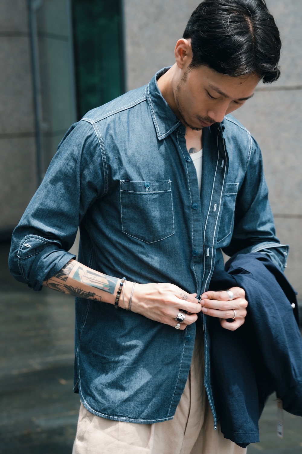 美國棉製。這款襯衫與HOUSTON其他丹寧襯衫不同之處,在於他非常美麗的Chambray布料,Chambray布料與丹寧布很相似,與斜紋的丹寧布比起,Chambray以經紗與緯紗的ㄧ編ㄧ織規律交織而成,起源於法國。曾經歷過軍服、工作服的歷史歷程,時至今日,輕薄且有著淡淡織紋的它,已成了許多氣質單品的愛用布料。