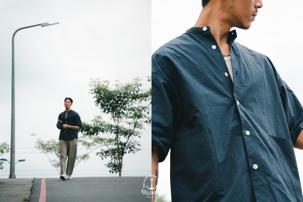 以棉麻混紡的打字機布料製成的亨利領襯衫,袖長五分袖的寬鬆剪裁,搭配腰間的雙層口袋實用卻不搶眼,相當低調且層次感十足。面料經過自然晾曬的加工,細看表面紋理會發現有獨特的皺摺感,同時還展現了獨特的色彩斑斕感,氣質出眾。