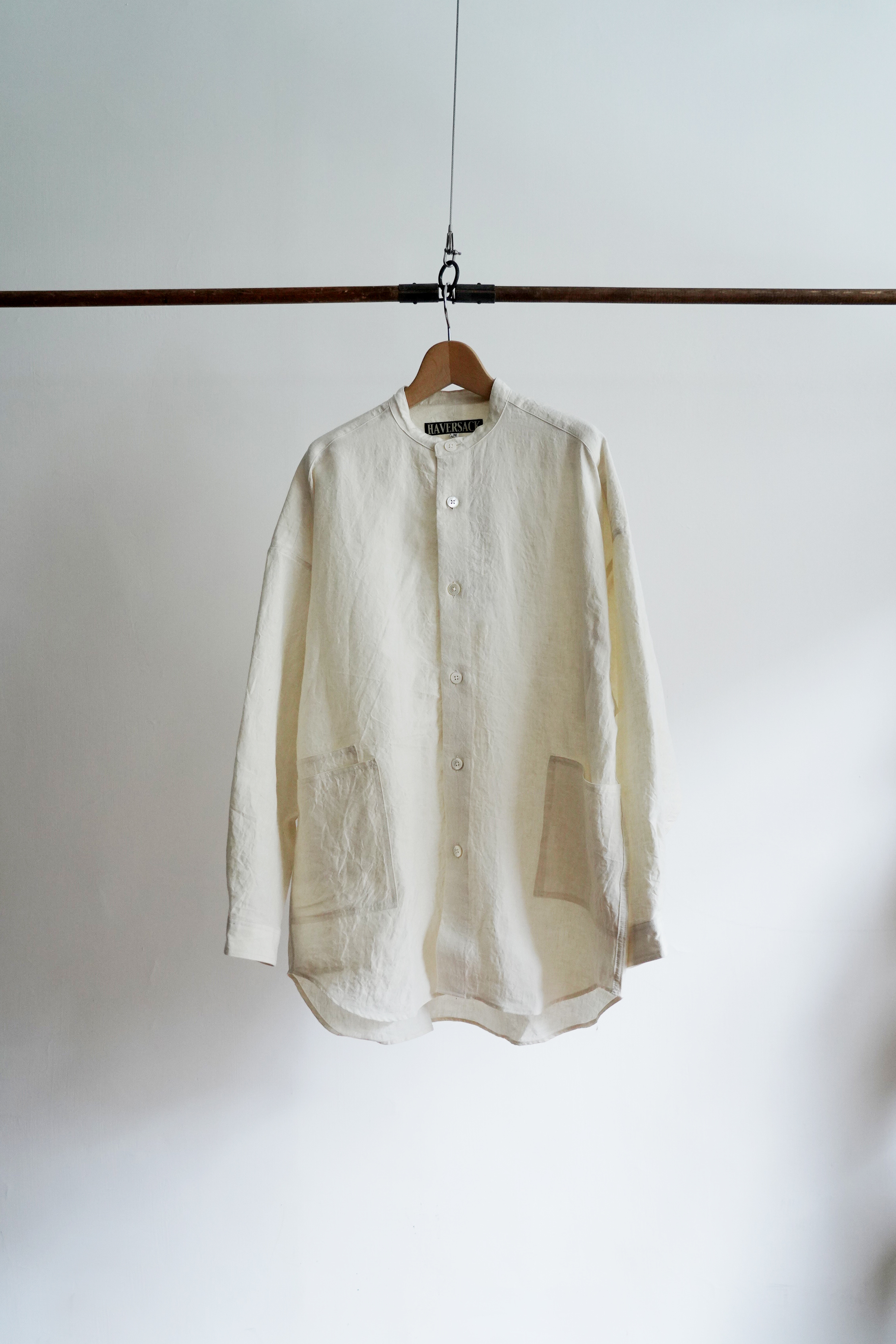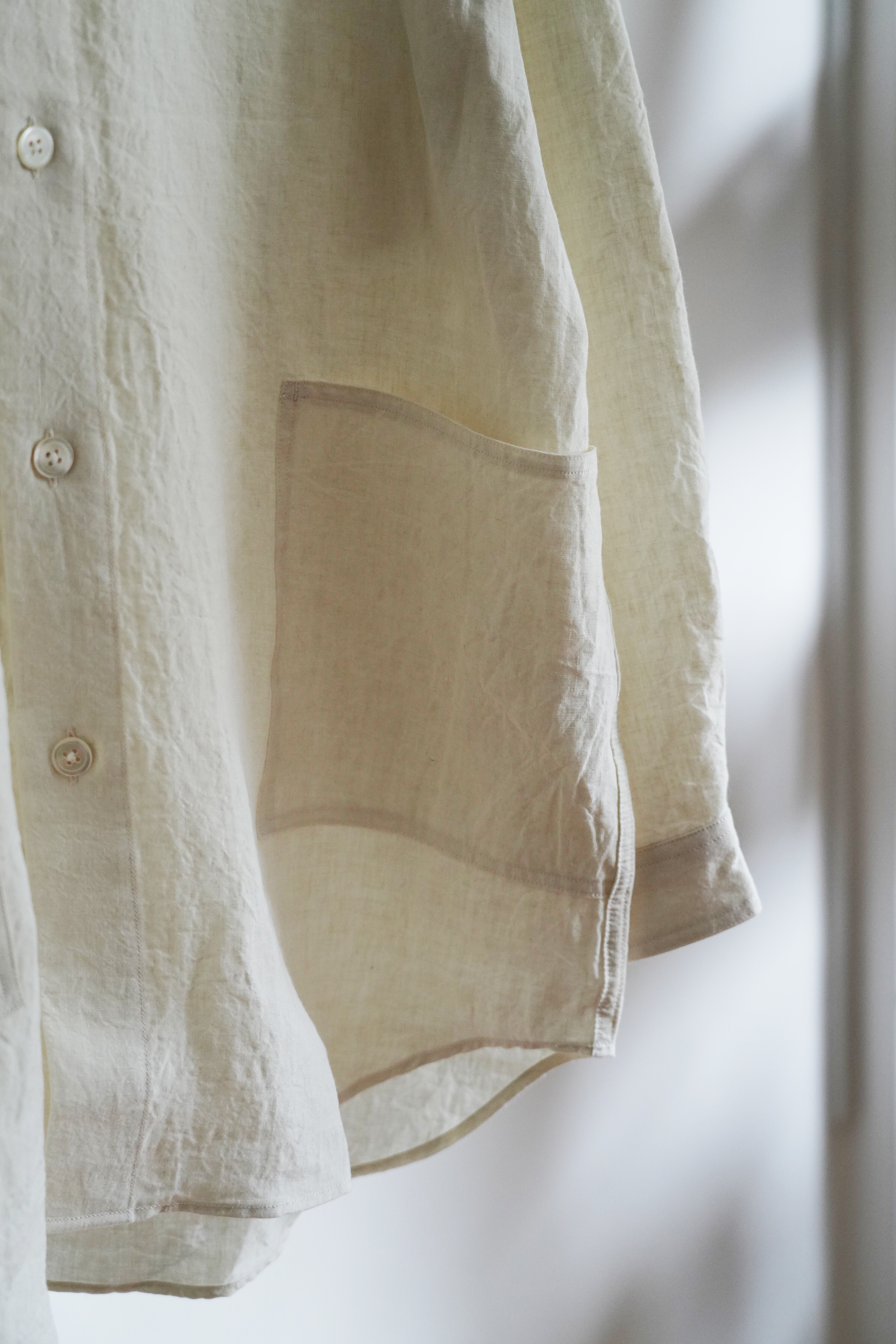 襯衫採用密度最高的60支紗歐洲亞麻,因此不但具有亞麻的紋理,同時帶有絲綢獨有的光澤。布料的質感搭配這個濃郁飽滿的米白色是我非常喜歡這件襯衫的原因之一,呈現的氣質非常優雅。