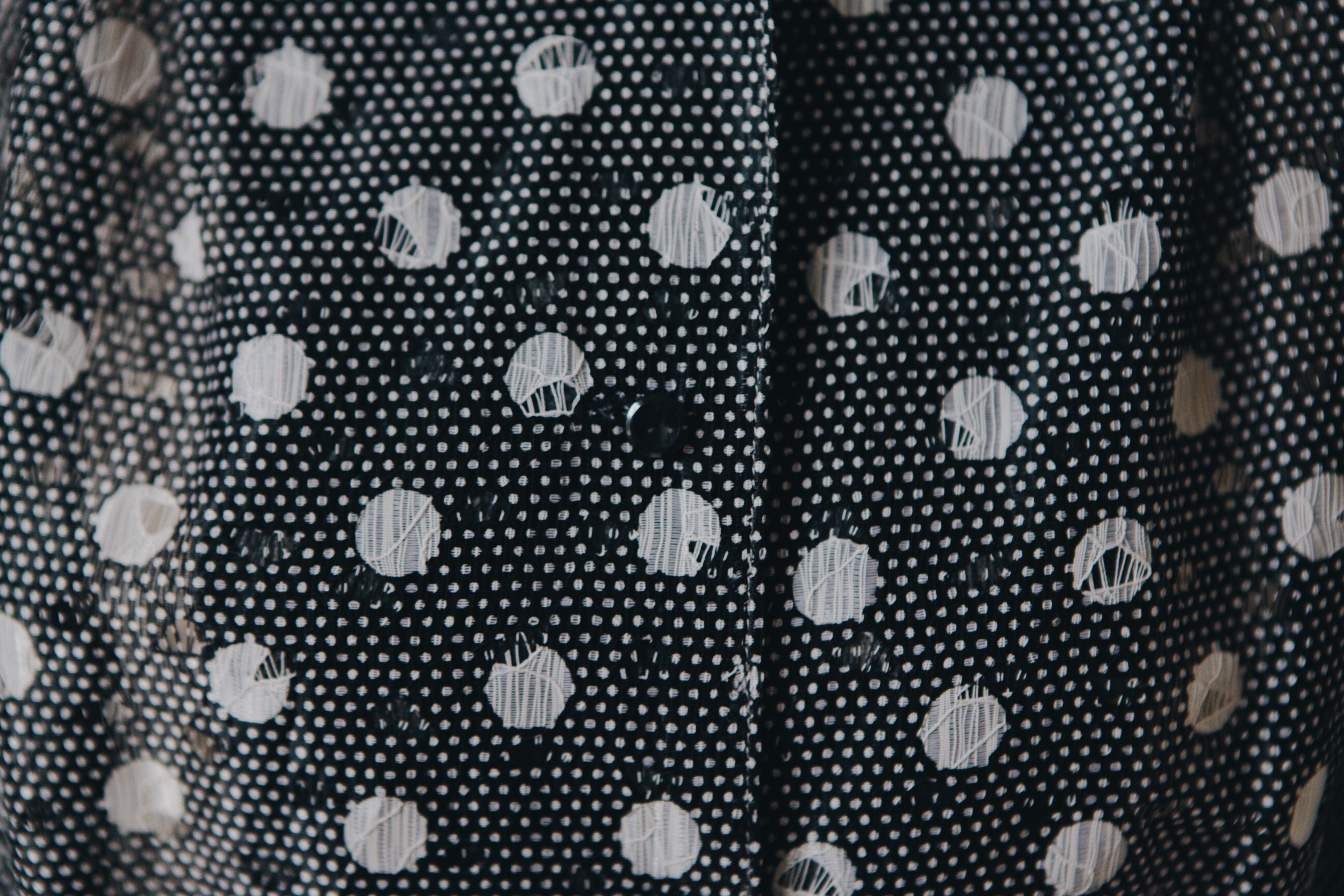 圓點圖案象徵星球、水滴、食物等各式圓潤形體,細碎密集的圓點洋裝適合身材較豐腴或骨架較小的女性;疏鬆醒目的圓點則適合身材纖細、骨架大的人穿著。