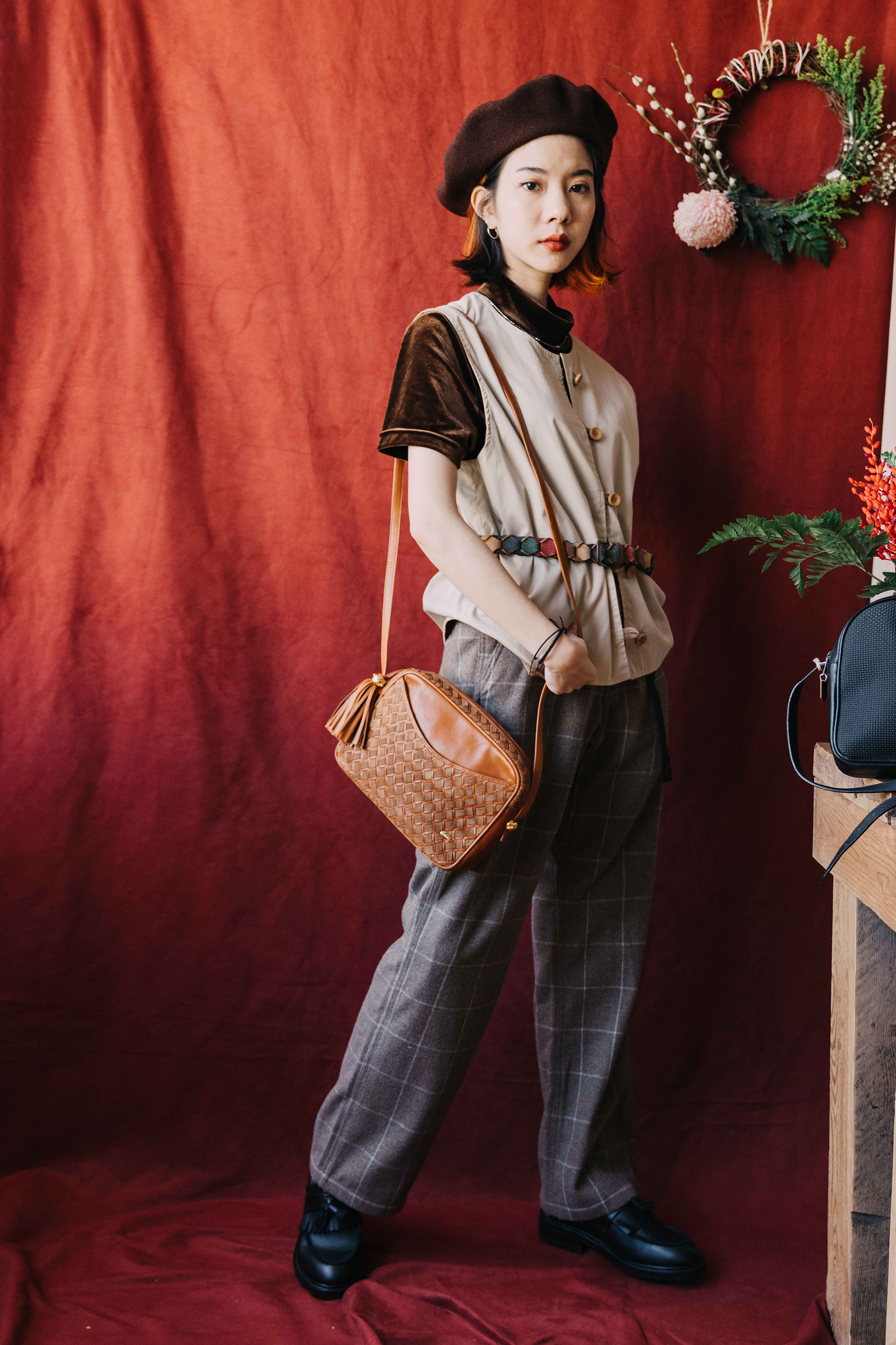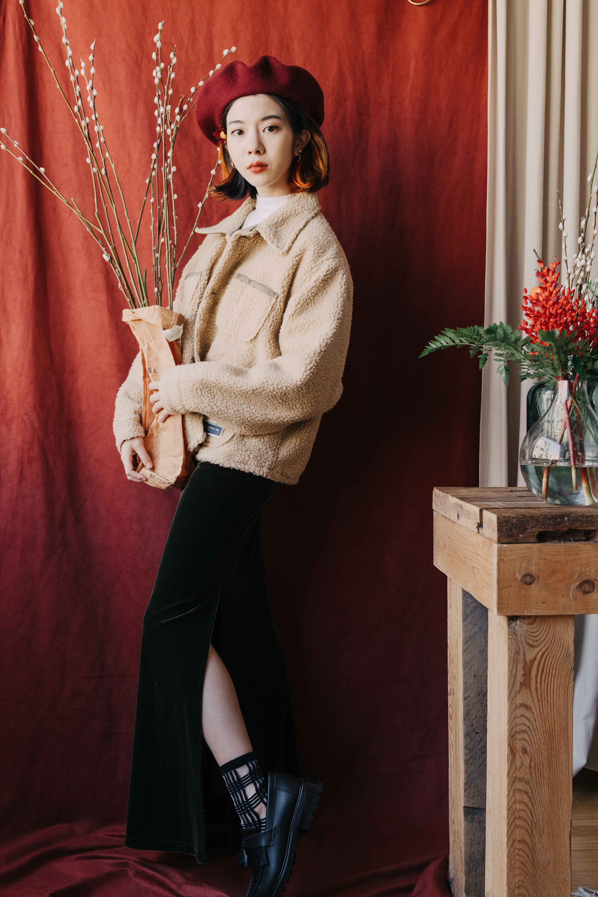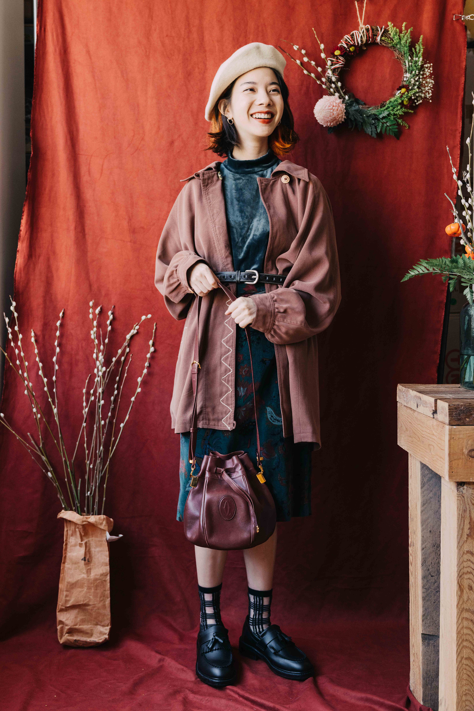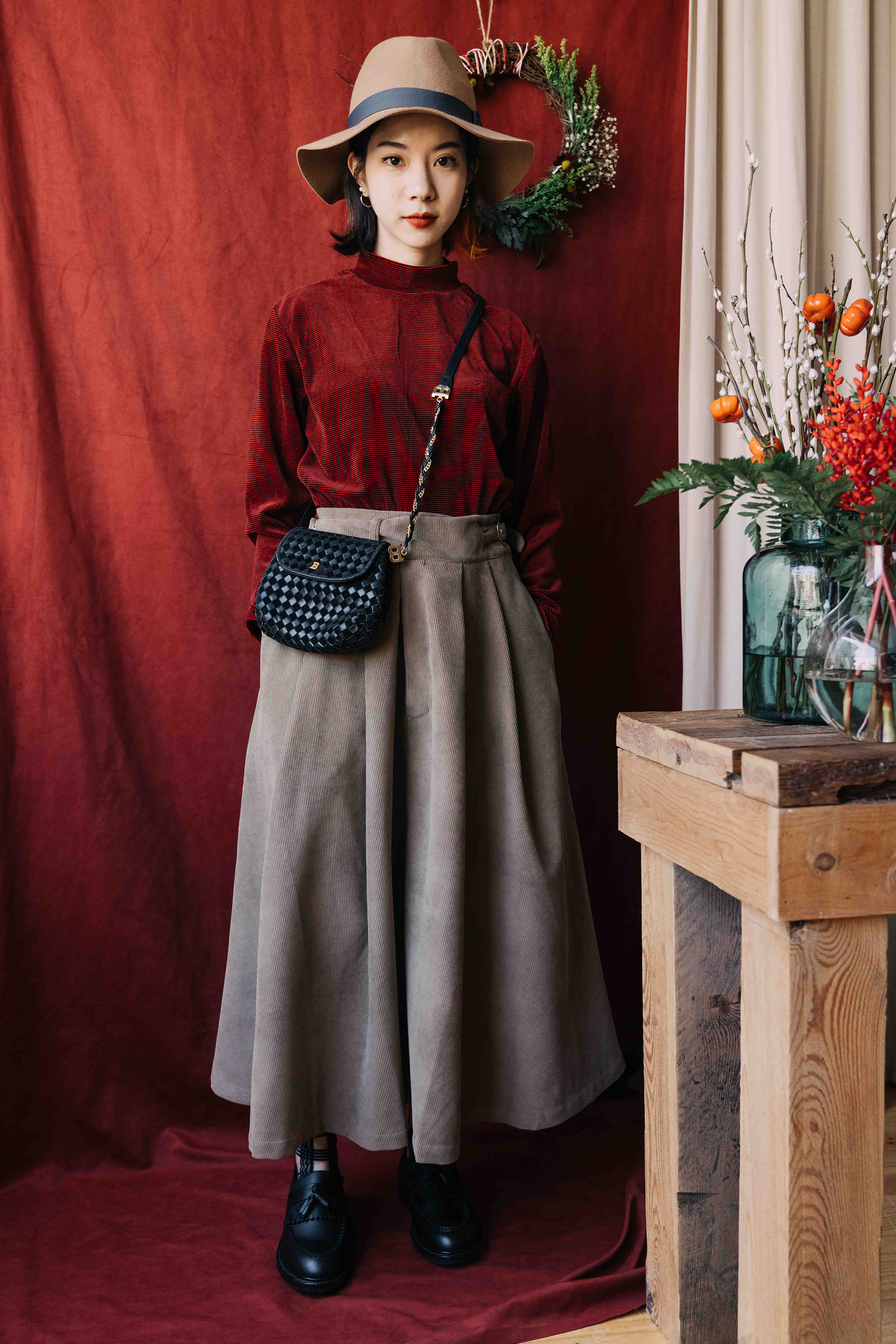 比起鮮紅色與大紅色,酒紅色的單品既不張揚又有品味,再搭載高貴又優雅的天鵝絨面料,又更能襯托出你的內斂氣質。用古著天鵝絨半高領上衣配上 YELLOW 108 棕色紳士帽,大地色的組合展現出你的穩重,配上 A ROOM MODEL 自製裙與黑色古著皮包,正式又體面。天冷時不妨穿上 Universal Overall 毛絨款外套,發揮保暖效用之餘還賦予一點點的可愛。
