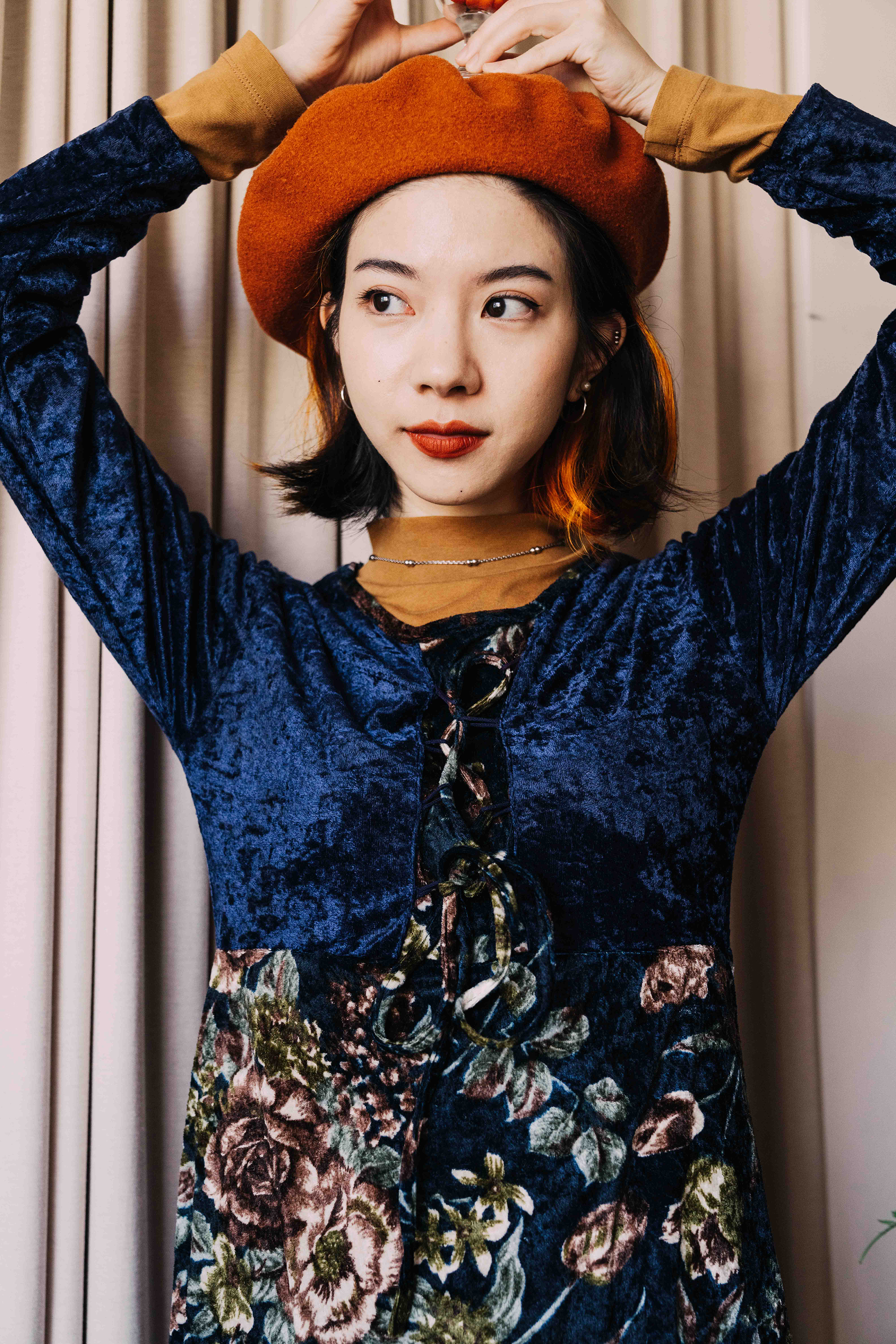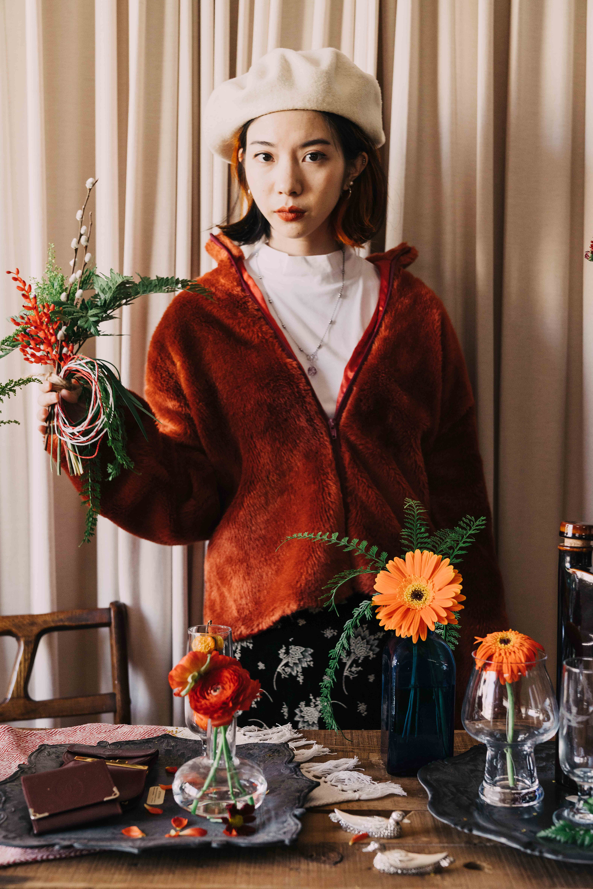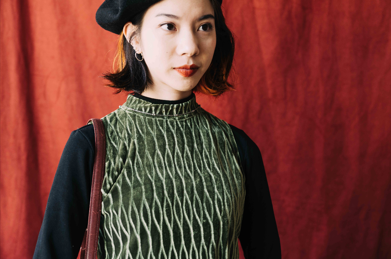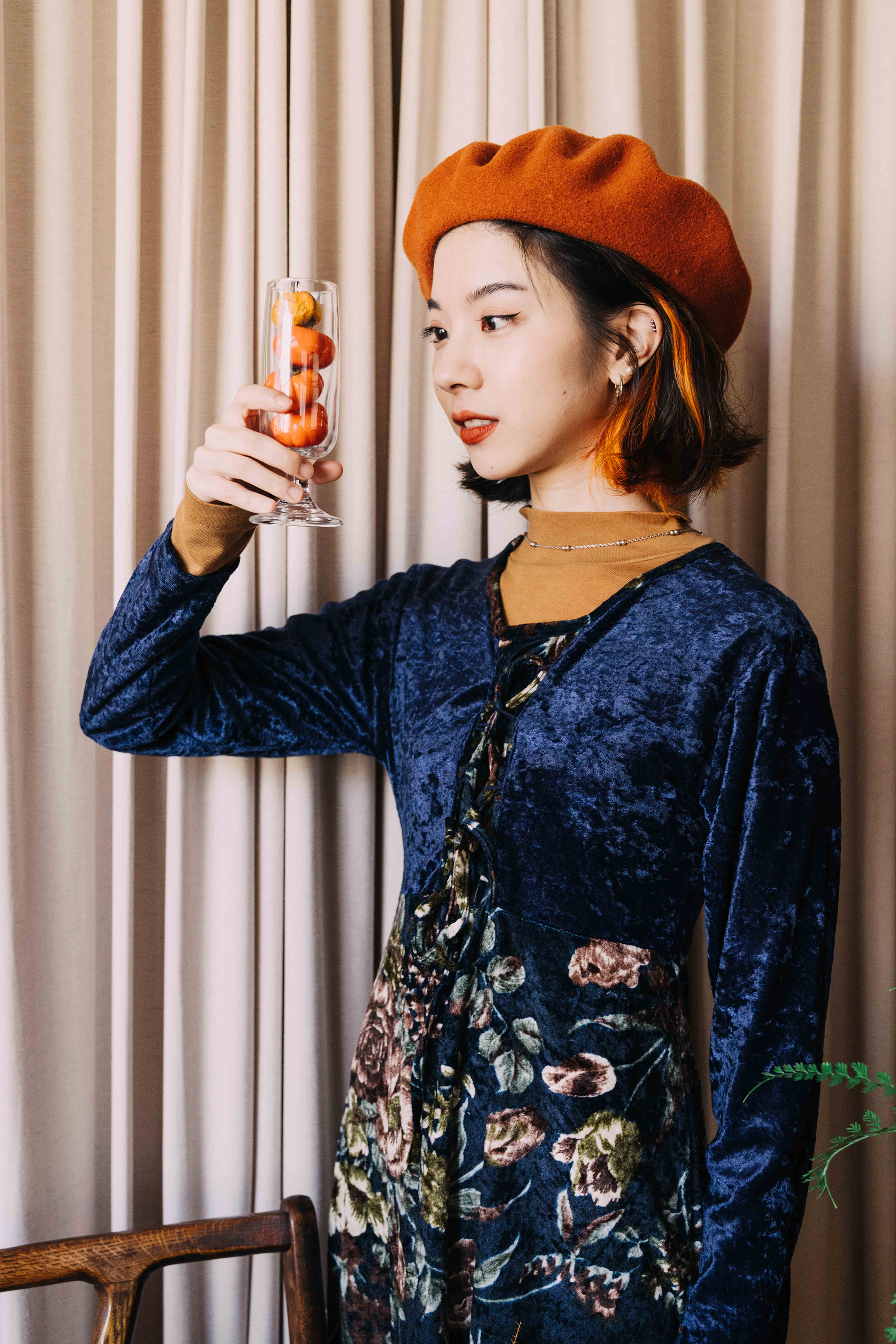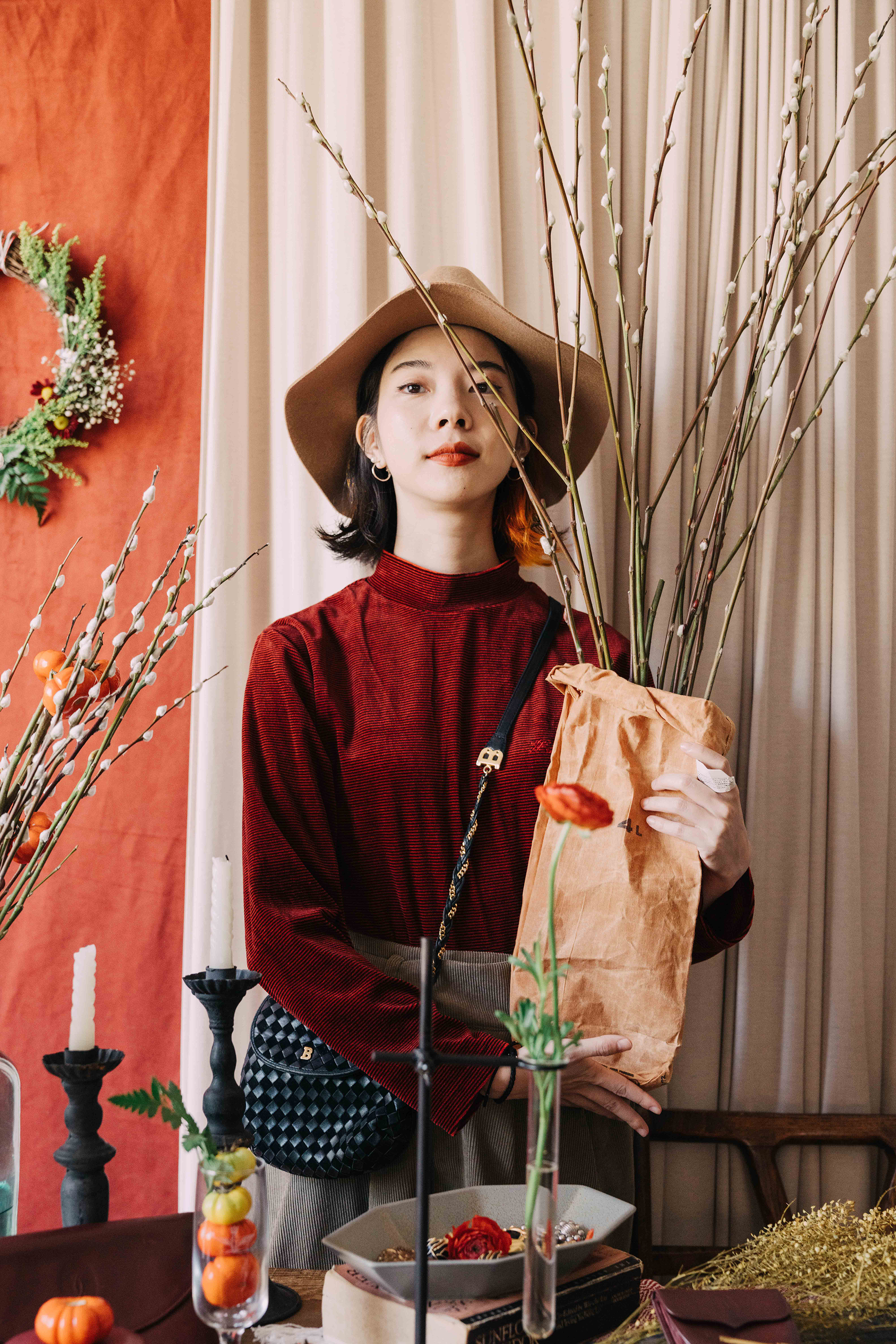 比起鮮紅色與大紅色,酒紅色的單品既不張揚又有品味,再搭載高貴又優雅的天鵝絨面料,又更能襯托出你的內斂氣質。用古著天鵝絨半高領上衣配上 YELLOW 108 棕色紳士帽,大地色的組合展現出你的穩重,配上 A ROOM MODEL 自製裙與黑色古著皮包,正式又體面。天冷時不妨穿上 Universal Overall 毛絨款外套,發揮保暖效用之餘還賦予一點點的可愛。