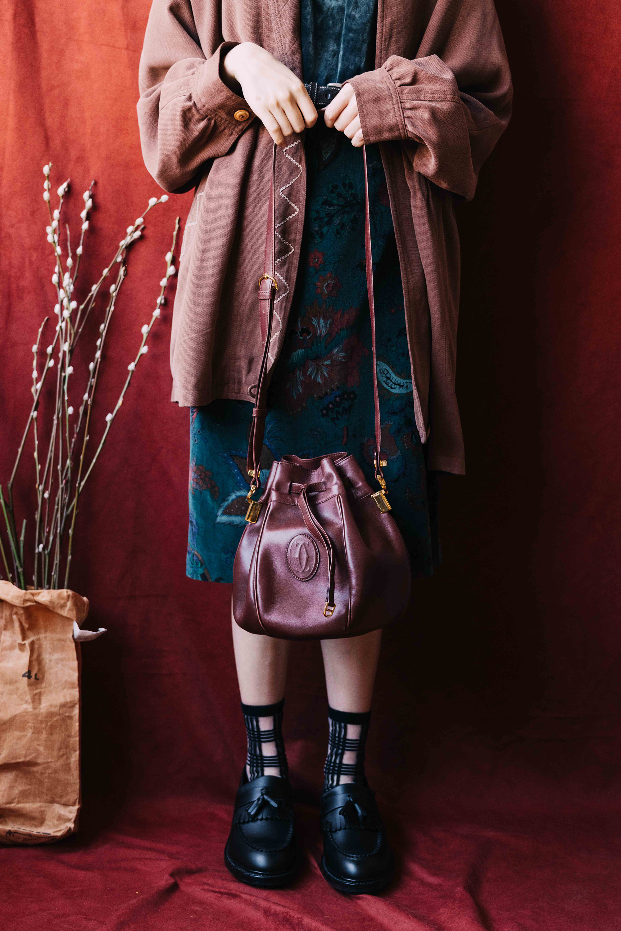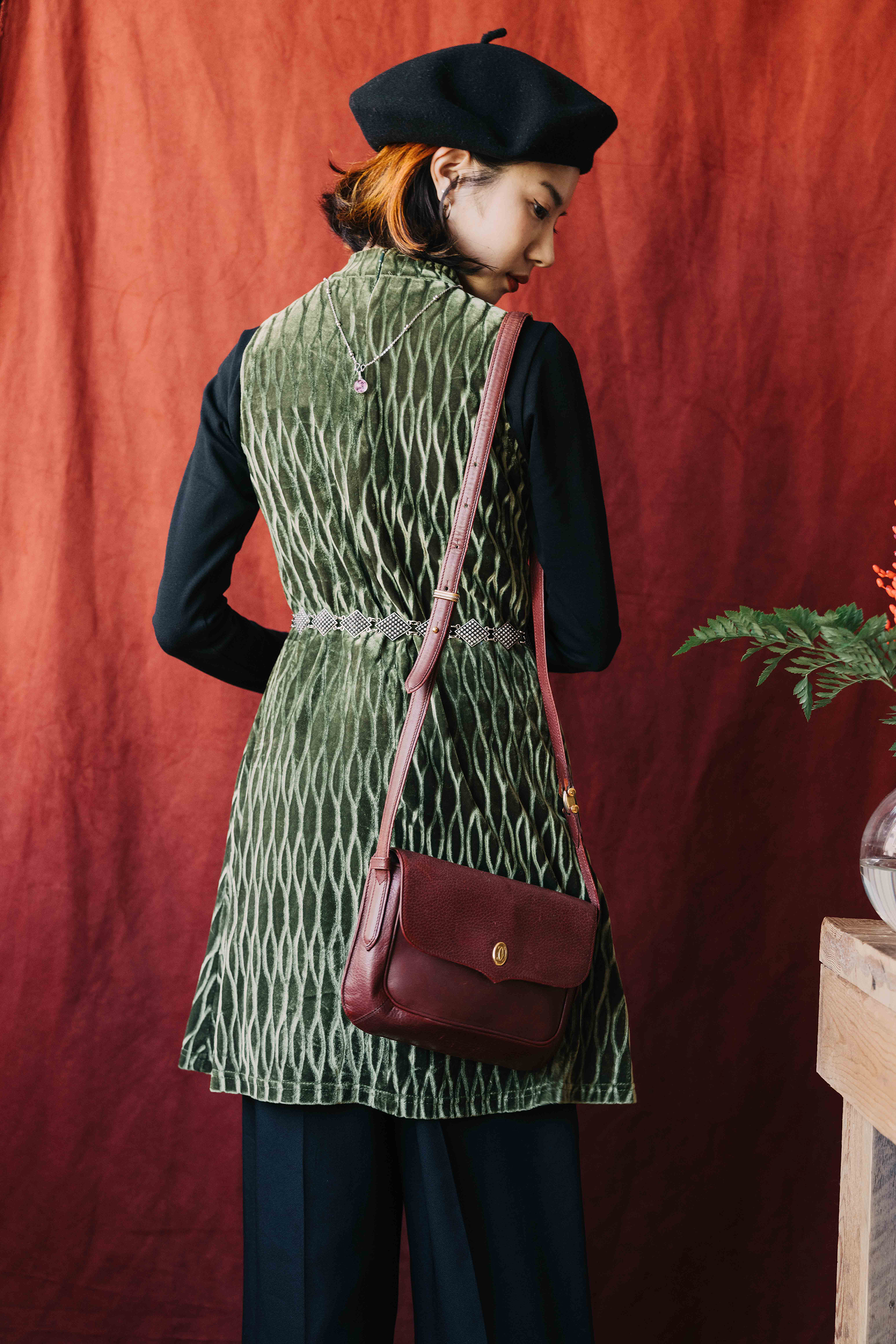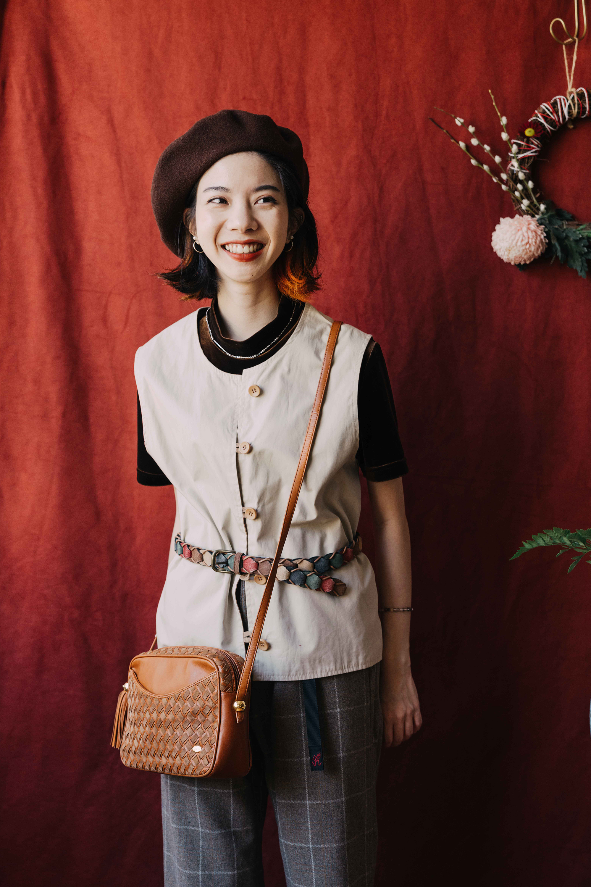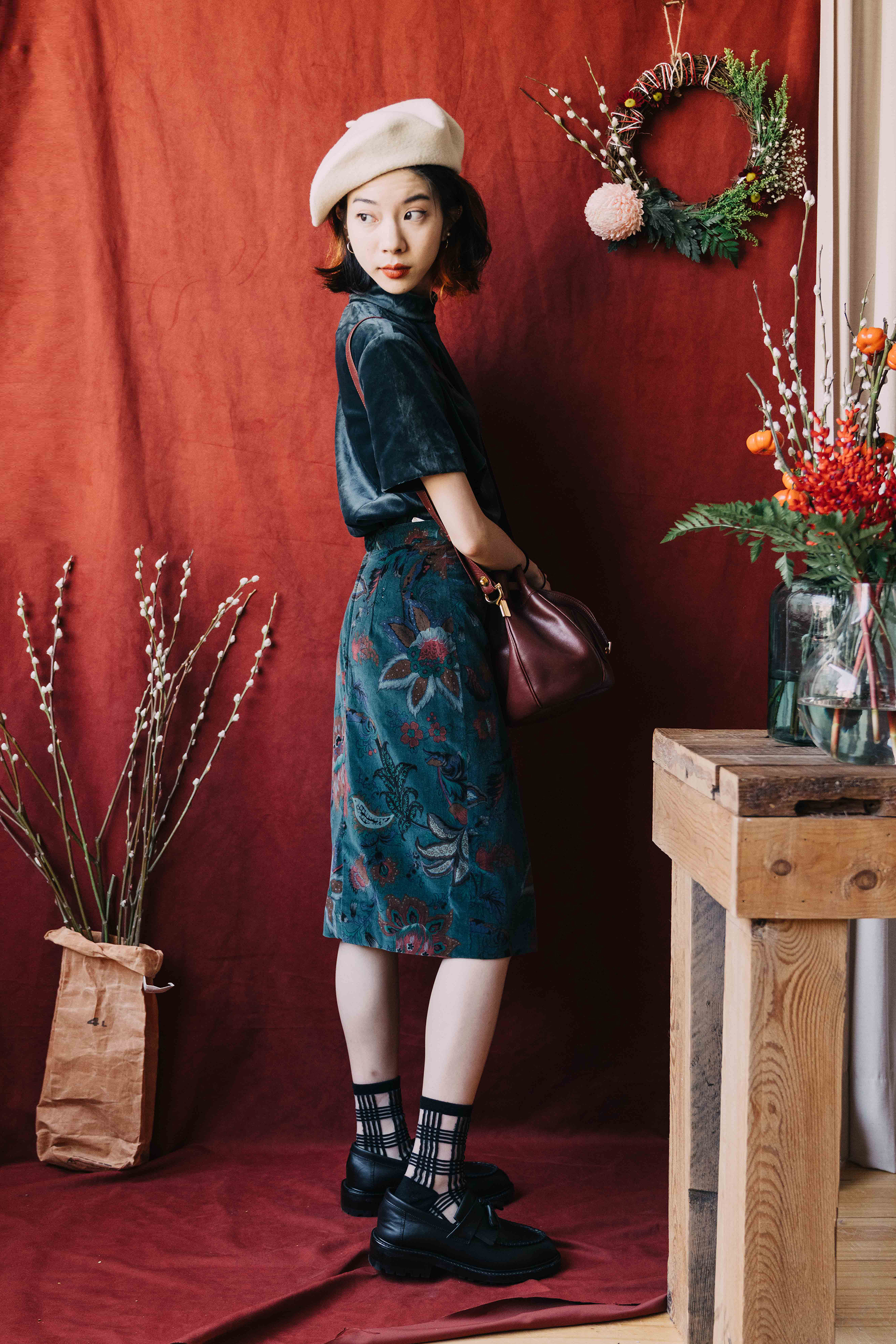 沈穩的藍綠色是你慣用的搭配色系,比起亮色系,你更注重單品的質料與花紋。天鵝絨短袖上衣讓你在回暖之際有了最佳選擇,搭配花紋高雅的古著窄裙,背上一只紅棕色皮革水桶包與貝蕾帽,關於這身搭配,巧思無所不在。