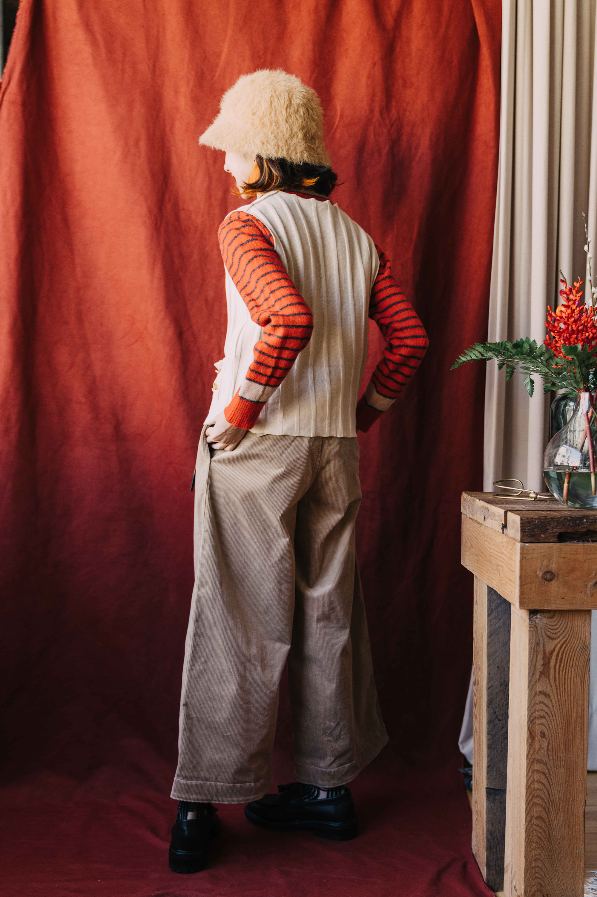 毛衣之所以能受人喜愛,不光是其柔軟扎實的舒服質感,更多時候,有趣的織紋與圖案變化,更讓人深深沈醉其中。穿上一件紅色條紋毛衣,配上卡其色寬褲與充滿細節的毛衣背心,宣示你的活潑與新年決心,今年的一切都將和你的穿搭一樣,變化多端又有趣。