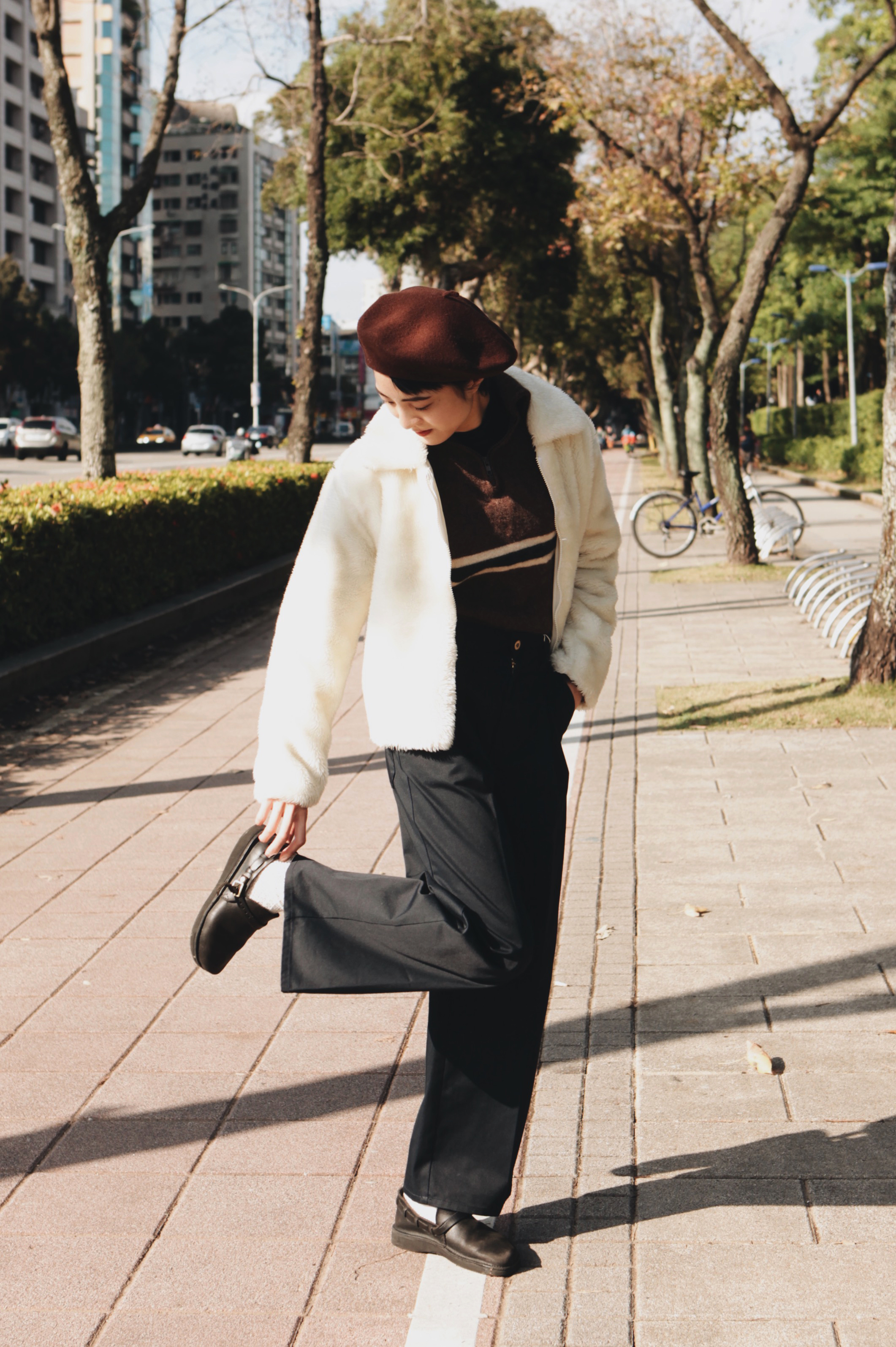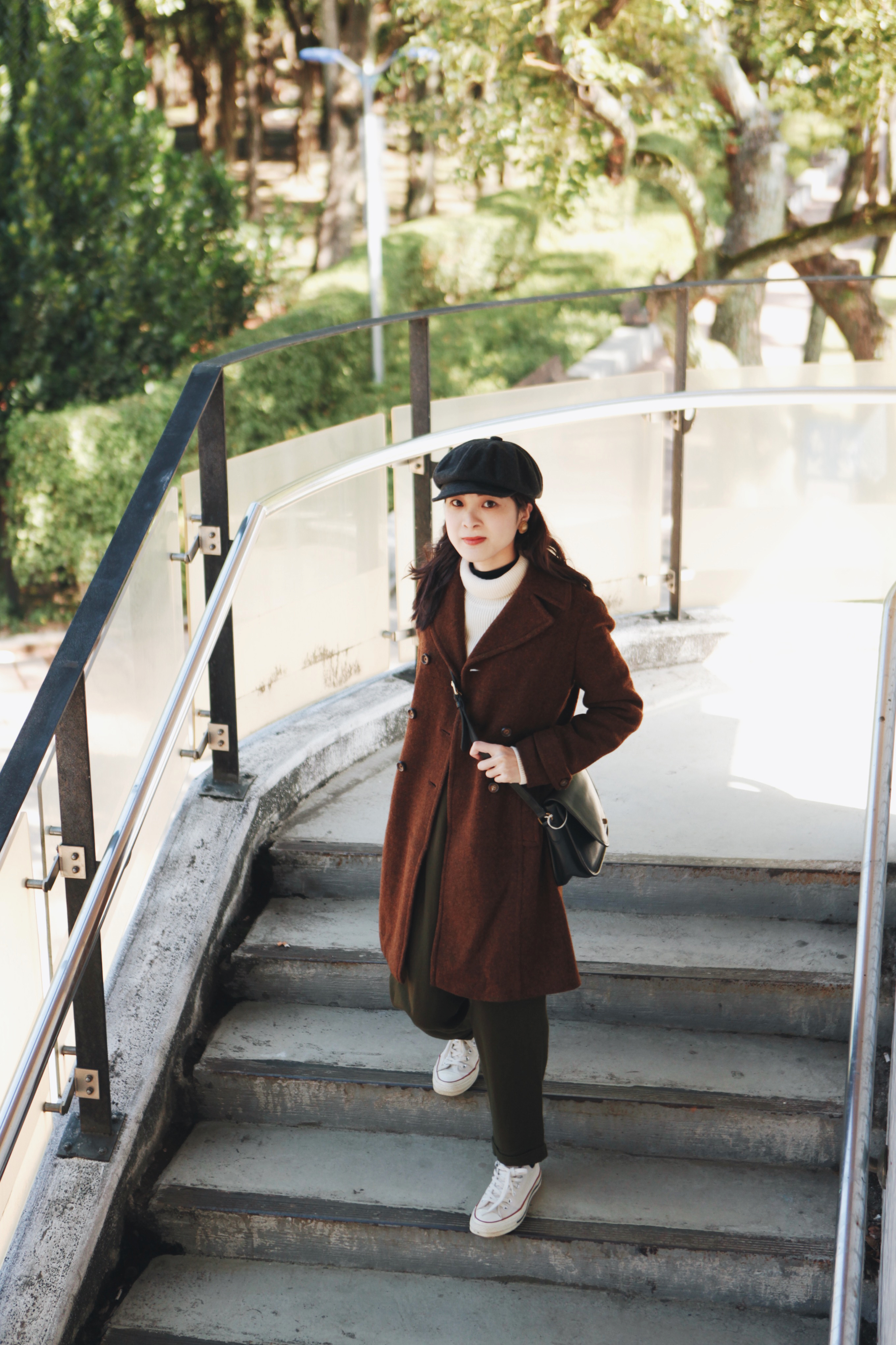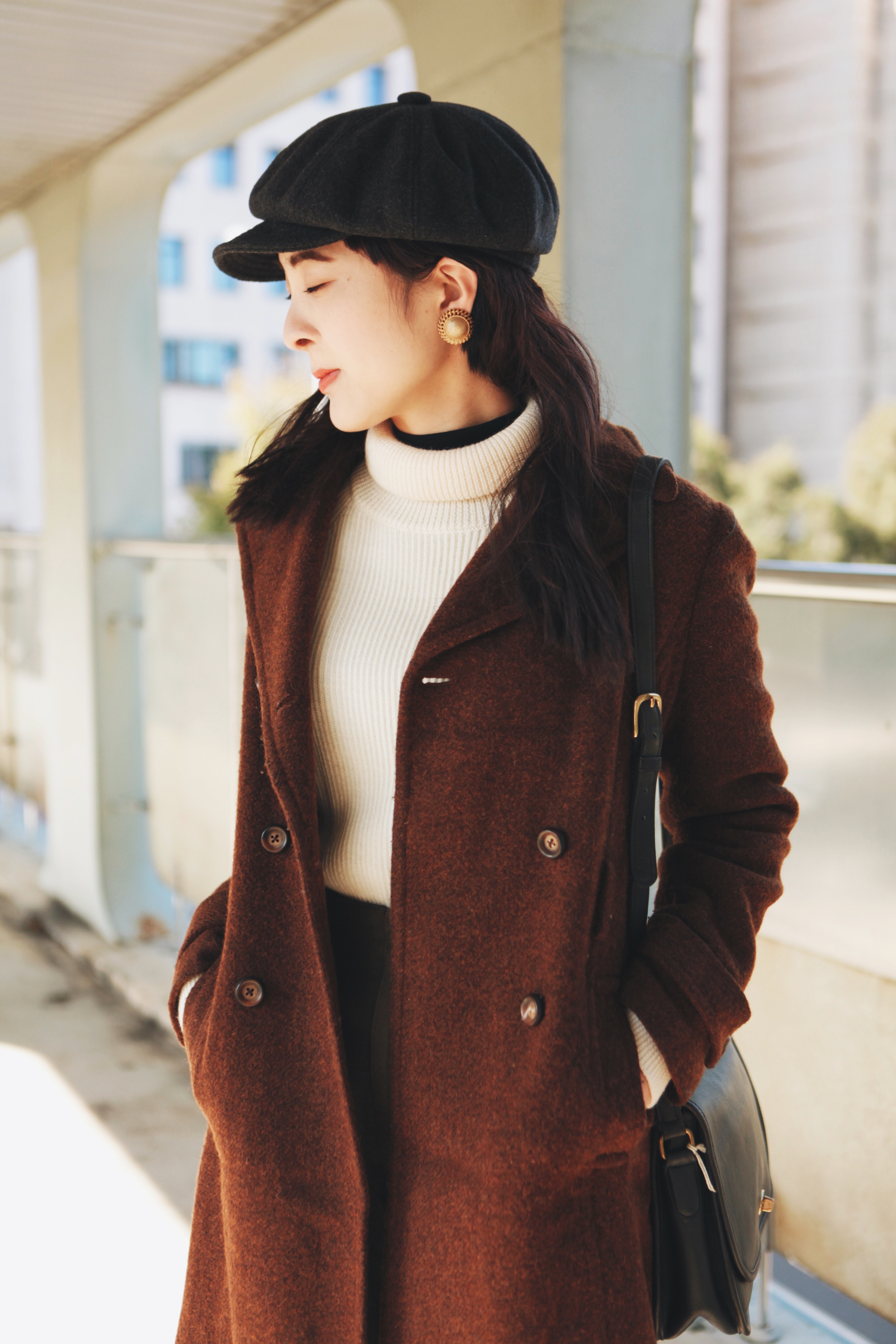 妳熟諳一個人旅行的方式,了解什麼樣式的衣服最能襯出妳的美。以白色高領毛衣打底,配上深色毛呢褲,高腰的版型讓整體造型俐落了不少,並趁著好天氣,套上那件躺在衣櫃裡一陣子的棕色毛呢雙排扣外套,沒有過多裝飾是妳喜愛它的原因,妳始終知道如何在簡單中展現優雅韻味。