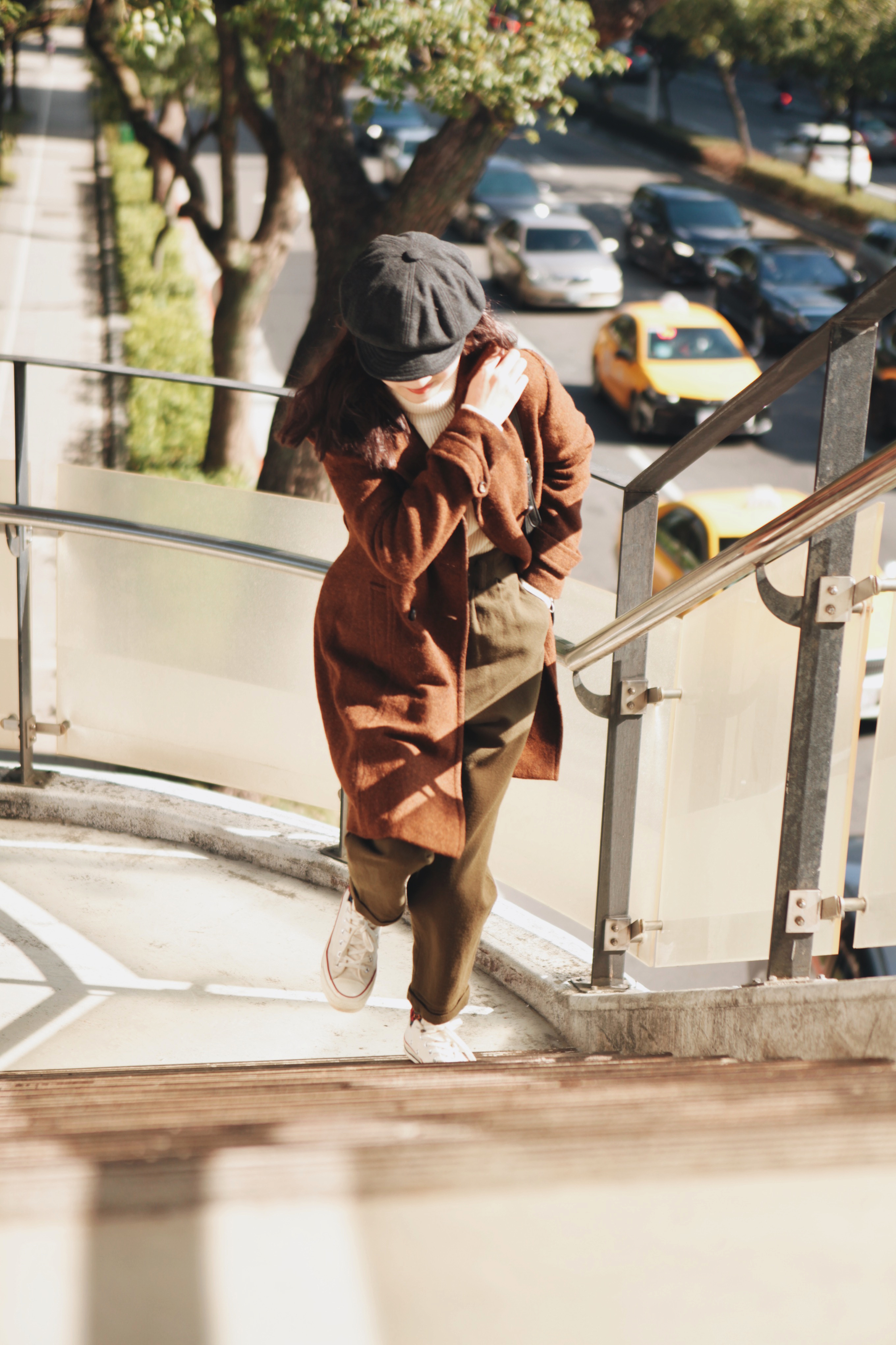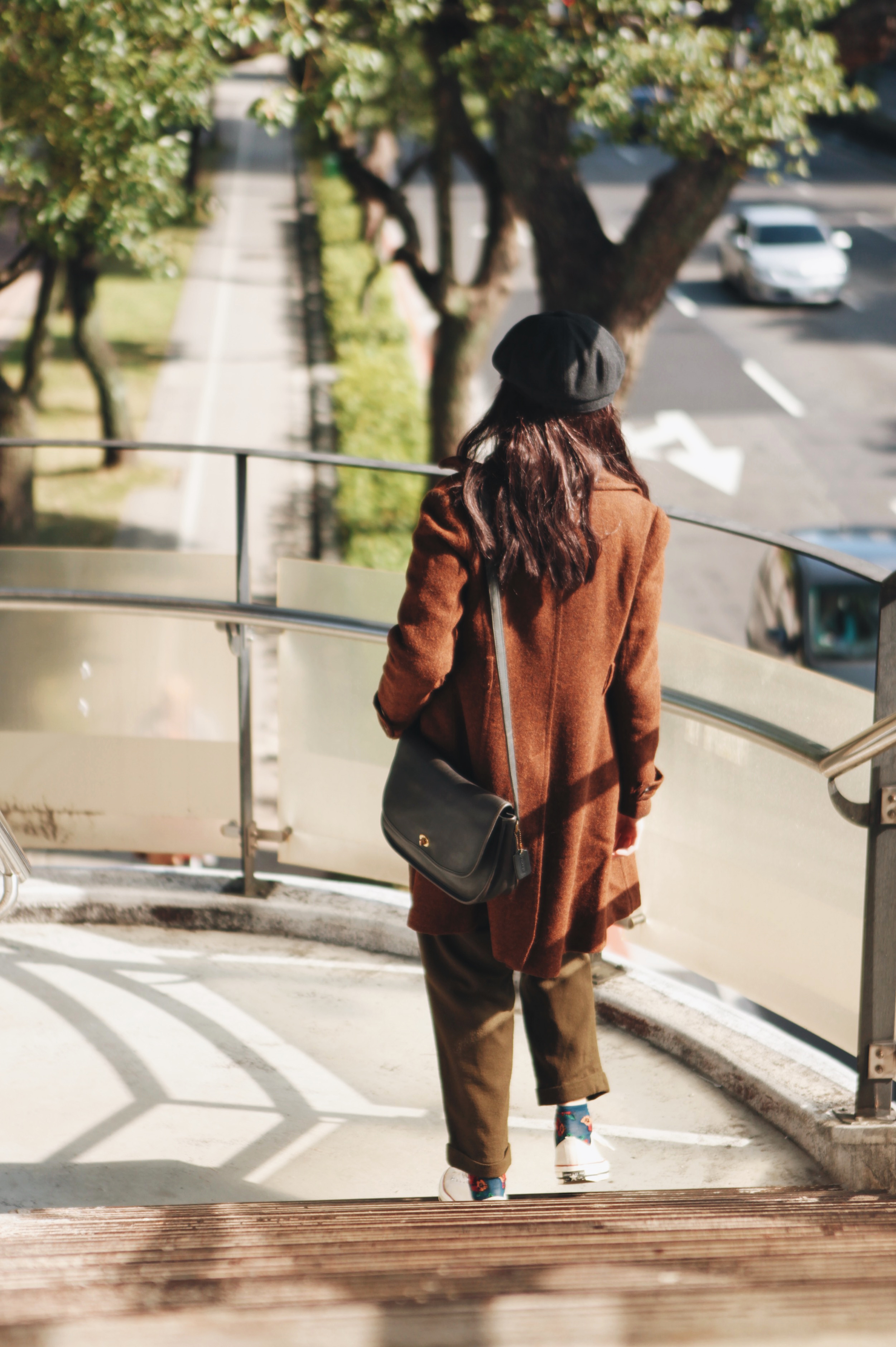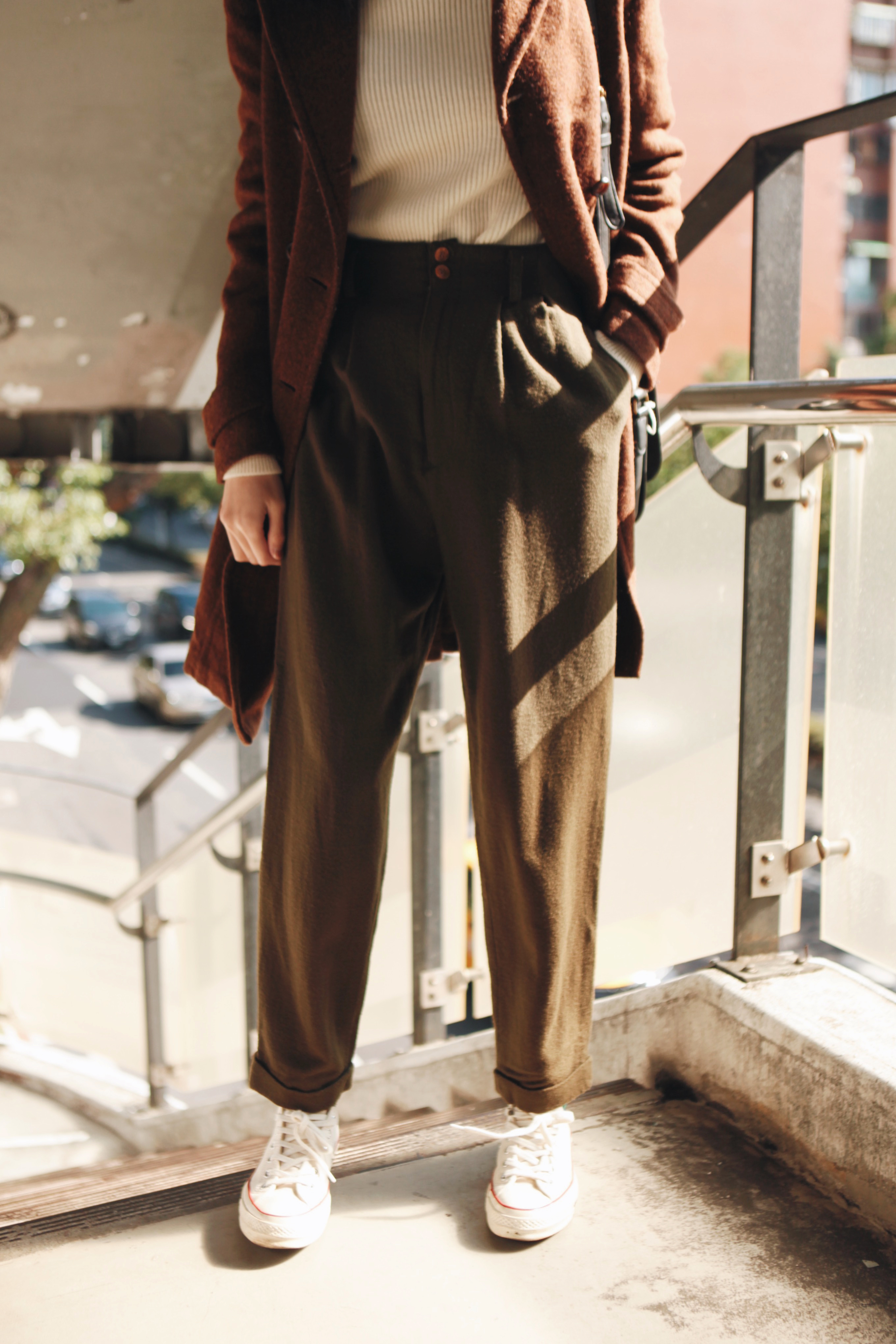 妳熟諳一個人旅行的方式,了解什麼樣式的衣服最能襯出妳的美。以白色高領毛衣打底,配上深色毛呢褲,高腰的版型讓整體造型俐落了不少,並趁著好天氣,套上那件躺在衣櫃裡一陣子的棕色毛呢雙排扣外套,沒有過多裝飾是妳喜愛它的原因,妳始終知道如何在簡單中展現優雅韻味。