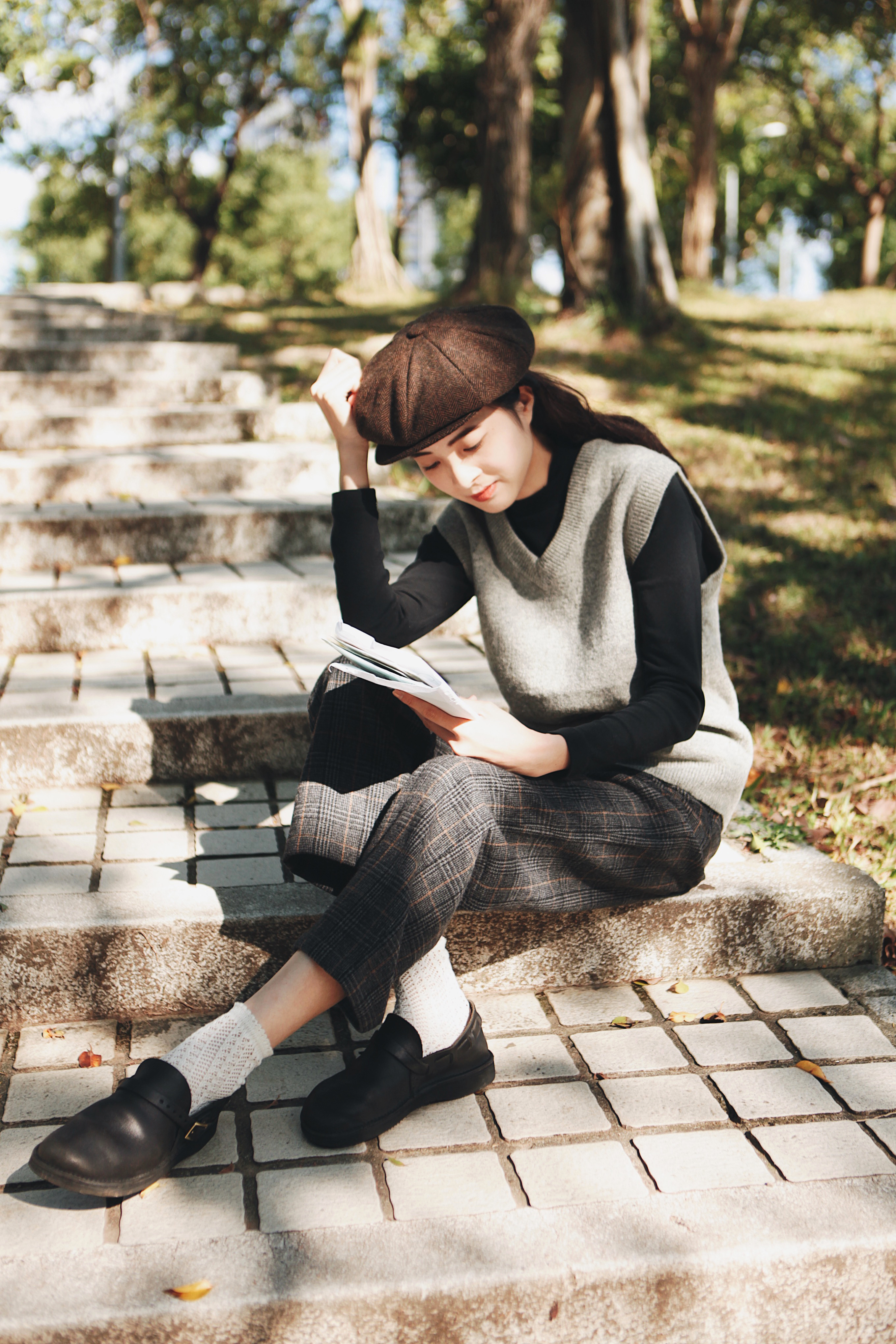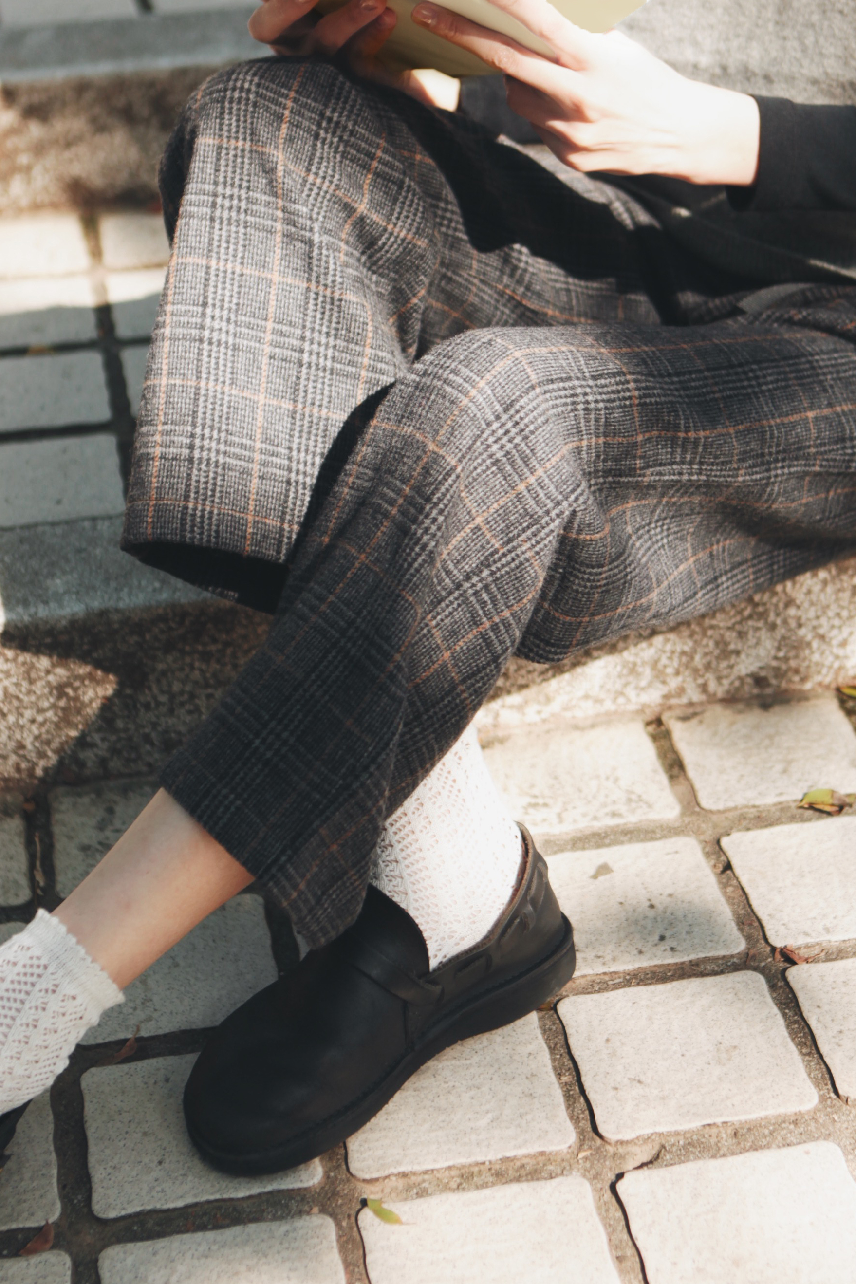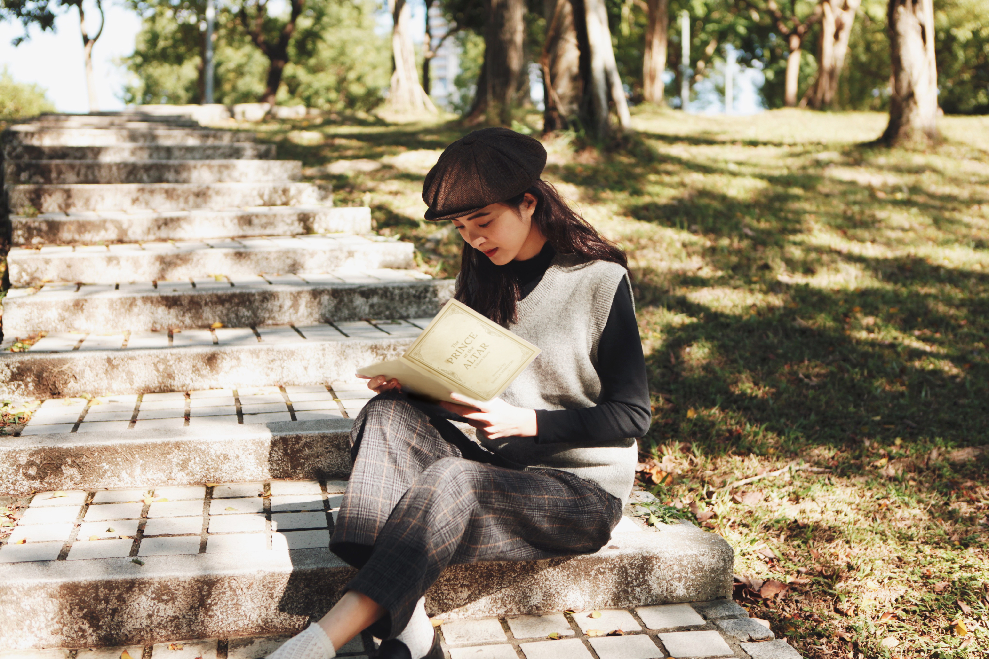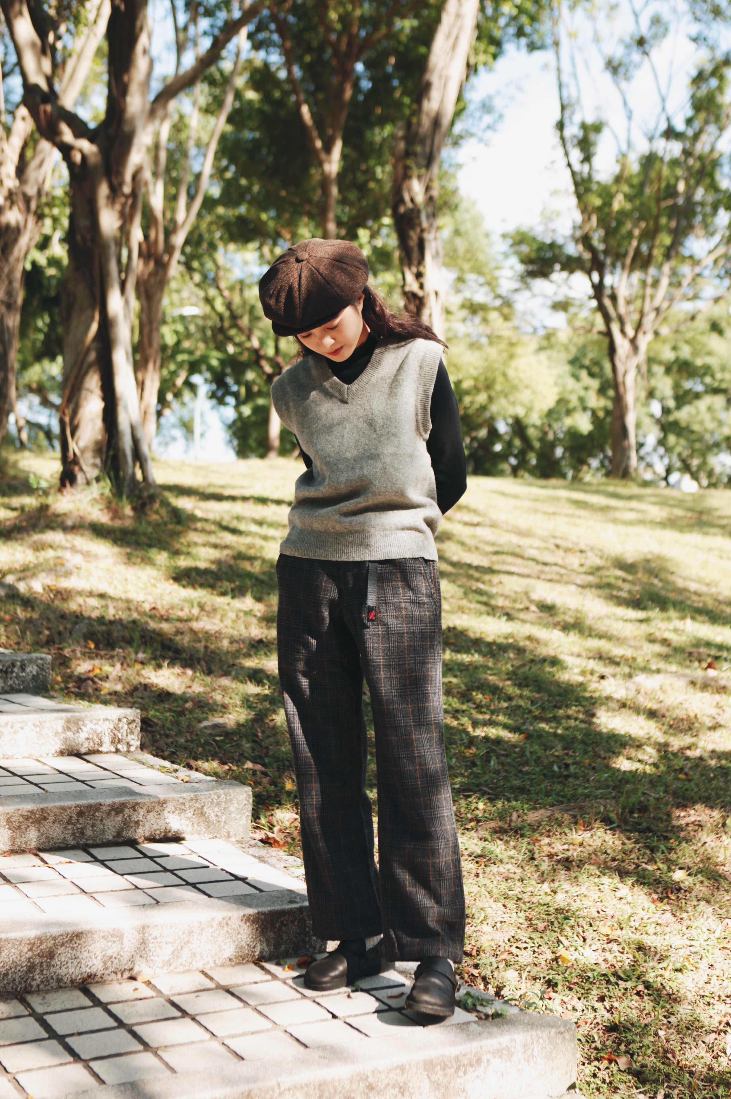 今天沒有待辦事項的壓力,終於可以好好喘口氣,妳從書櫃隨意挑選了本書放進包包裡,走向漫步綠蔭的街道上,享受久未嚐到的清閒時光,走得累了就挑一處坐下,翻翻那本看不膩的書,透過故事主角的生活來複習自己對生活的憧憬。而格紋與大地色系,是最能襯出你知性氣質的兩大要素,穿上 Gramicci 格紋毛呢褲搭配淺灰色毛衣,簡單的層次搭配,就像這個下午的暖陽一樣,簡單地讓人滿足又喜歡。