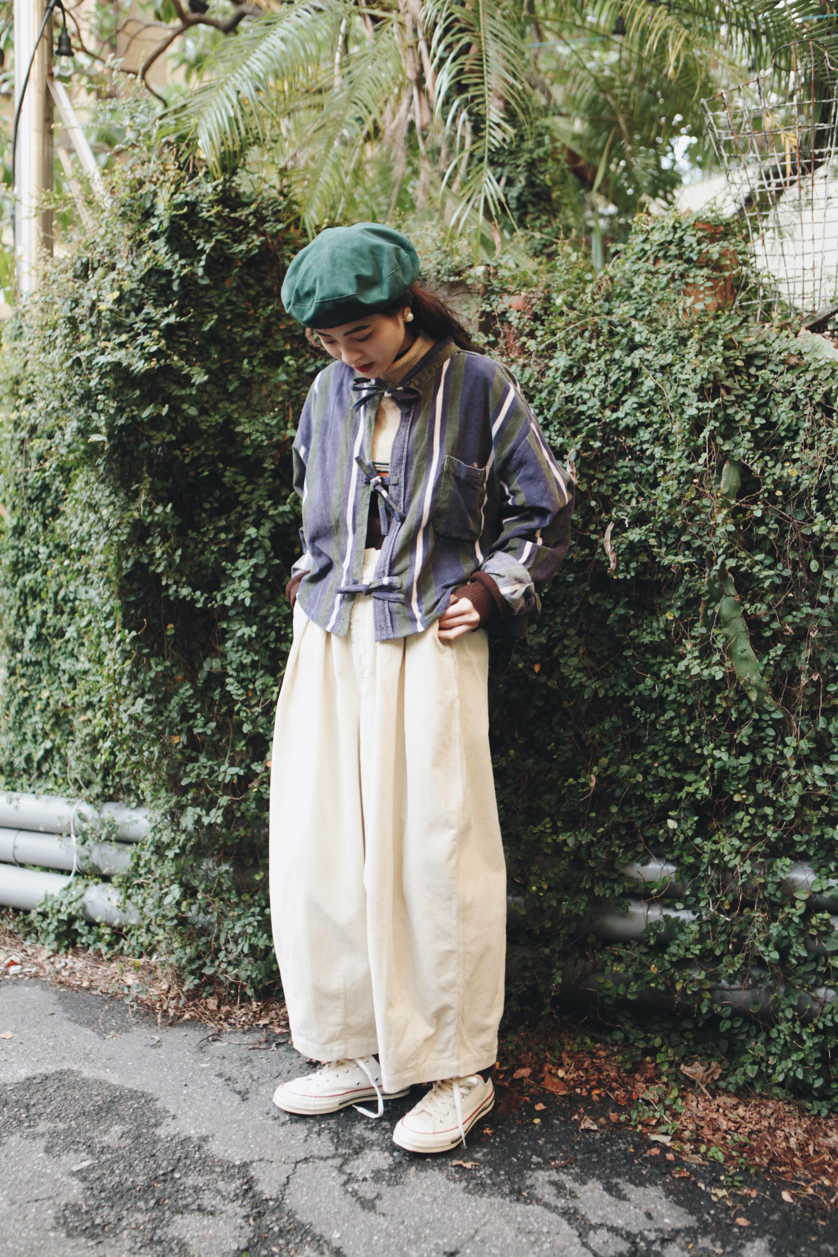 前往咖啡廳的途中總是令妳期待不已,罩上一件 F5 改製襯衫,短版的版型,蝴蝶結釦的細節設計則能滿足喜歡在中性打扮添加一點點優雅成分的妳,天冷的時候還可配上柔軟又保暖的 Vintage Czech M85 Liner,讓氣質再上乘;而繭型米白色的 Harvesty 燈芯絨馬戲團褲則能中和上半身的柔美氣息。