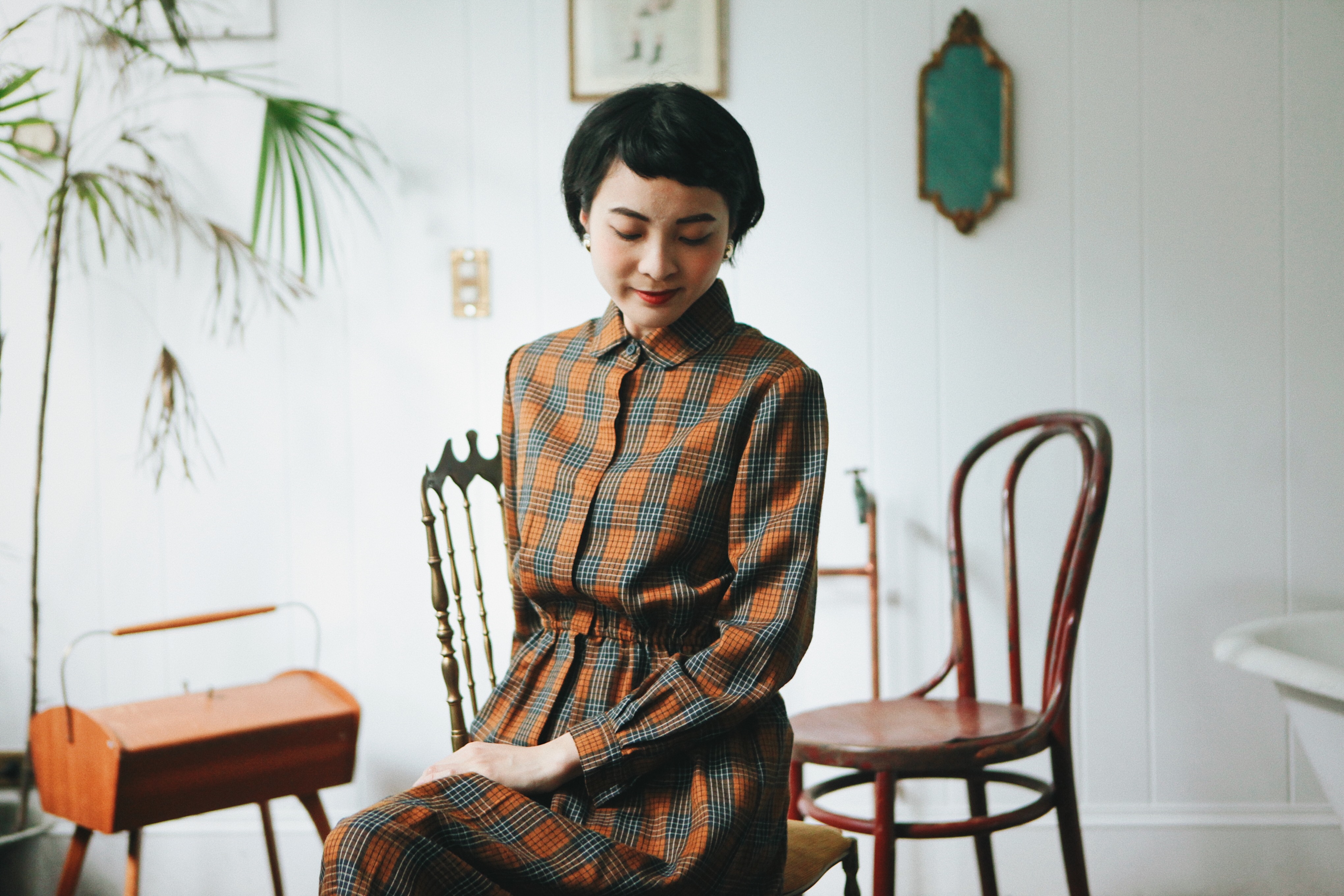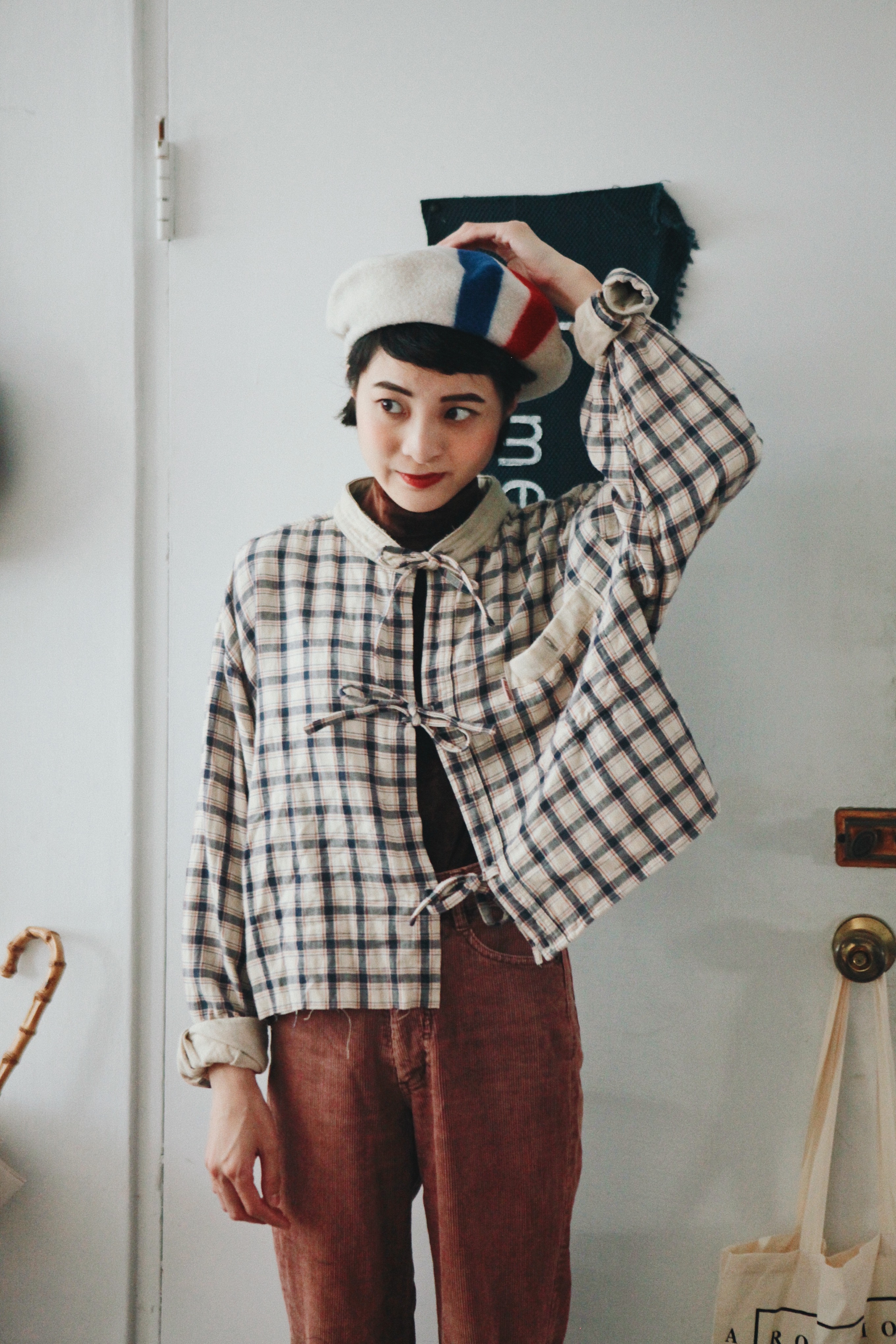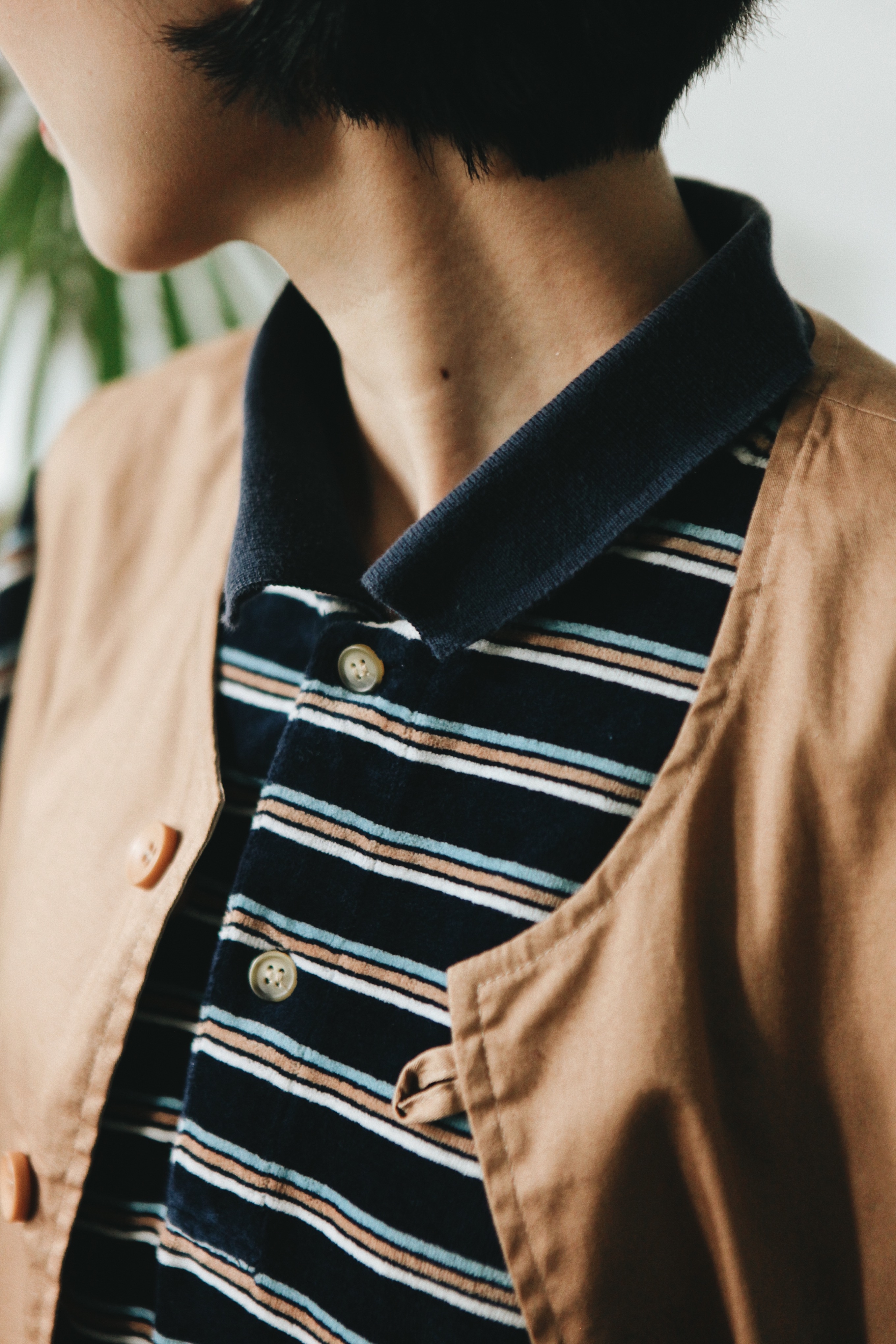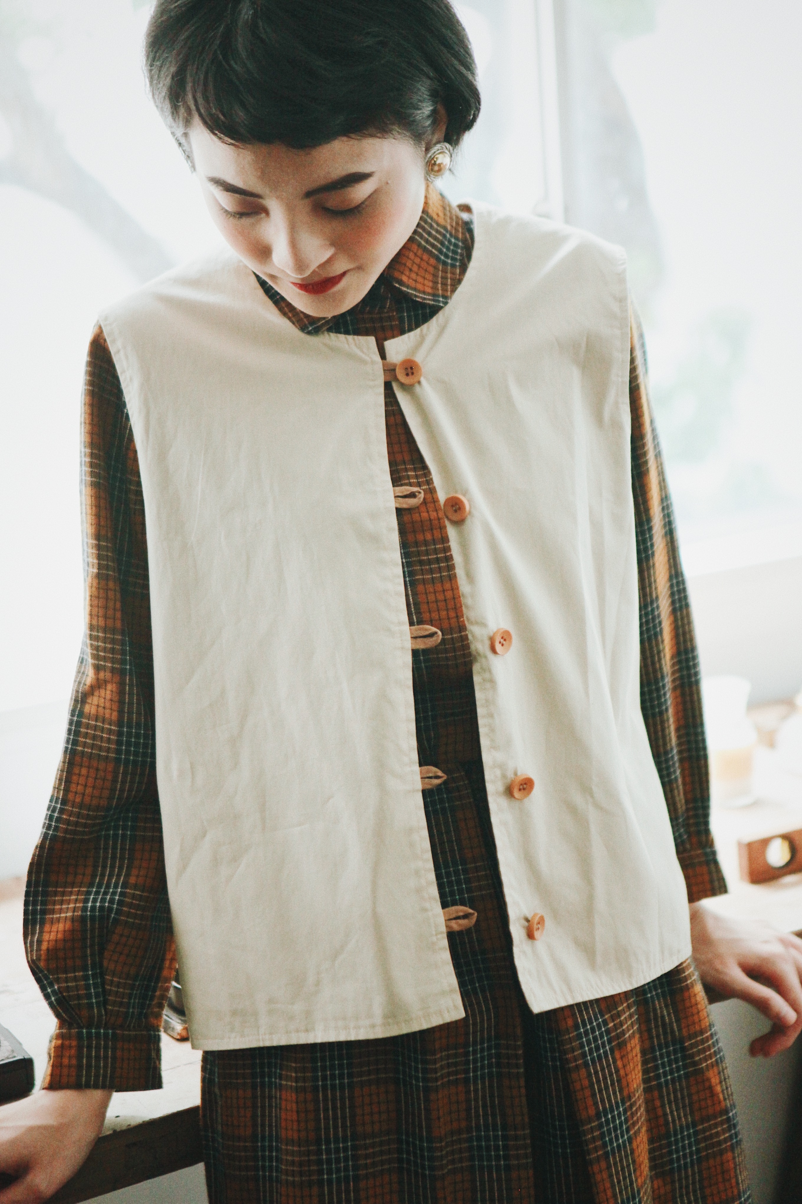 這件耗時半年的自製品背心,從扣子到布料的選擇,都是一步一步紮實累積而來;雖說布料輕薄,但在初冬時節搭配在大衣外套裡,也是種增加層次的小秘訣,且雙面穿的特點讓你輕鬆就能達到多變的目的。