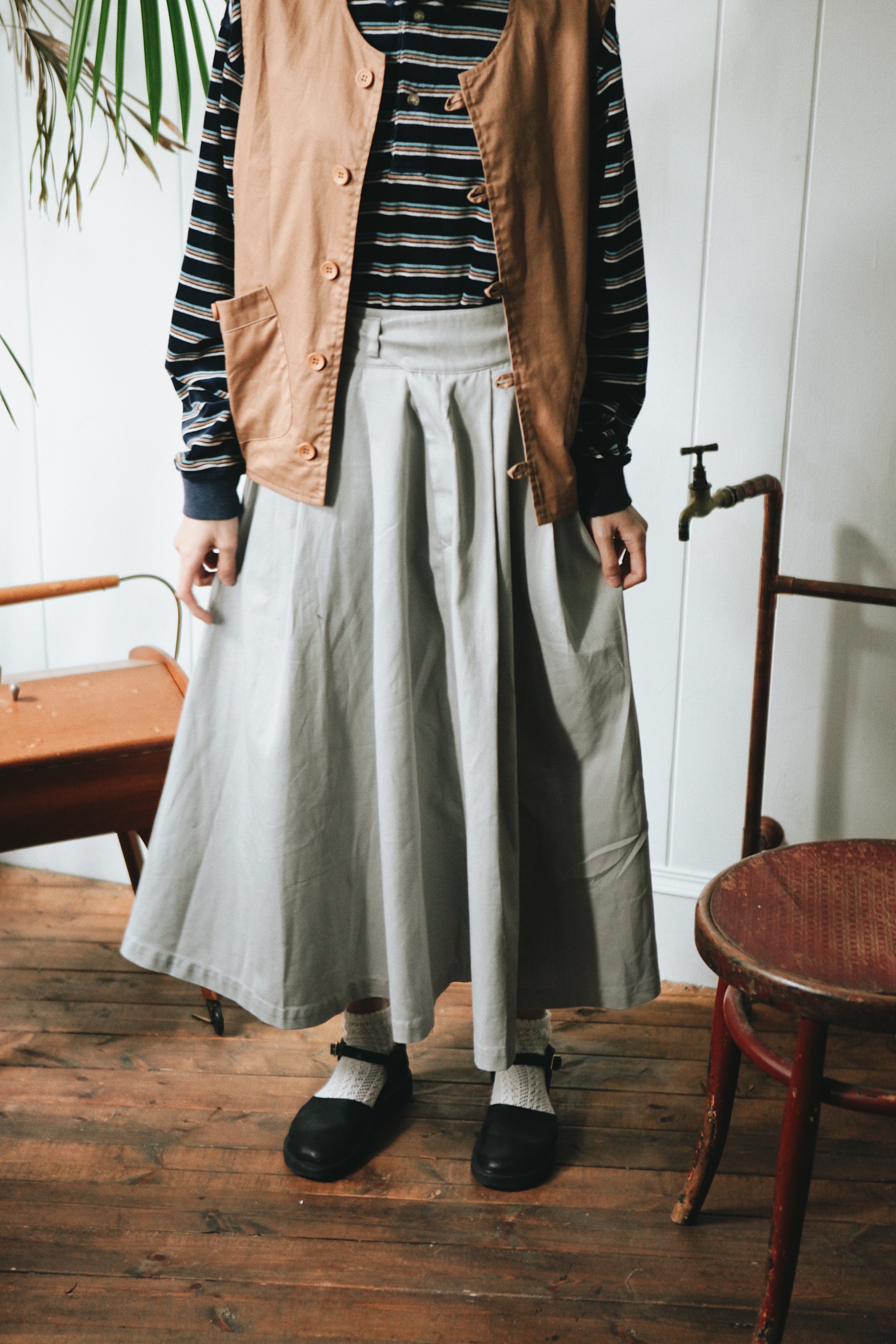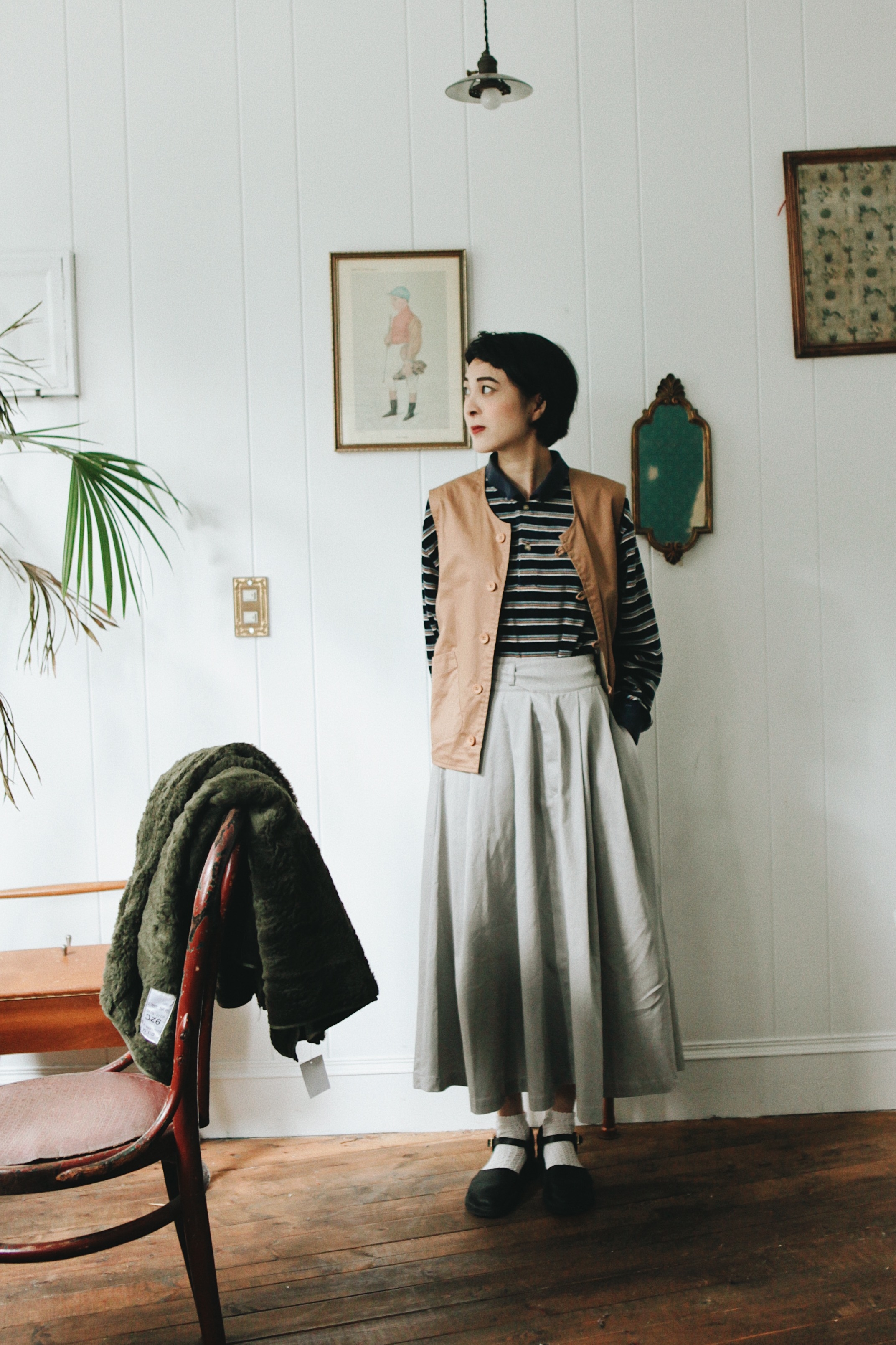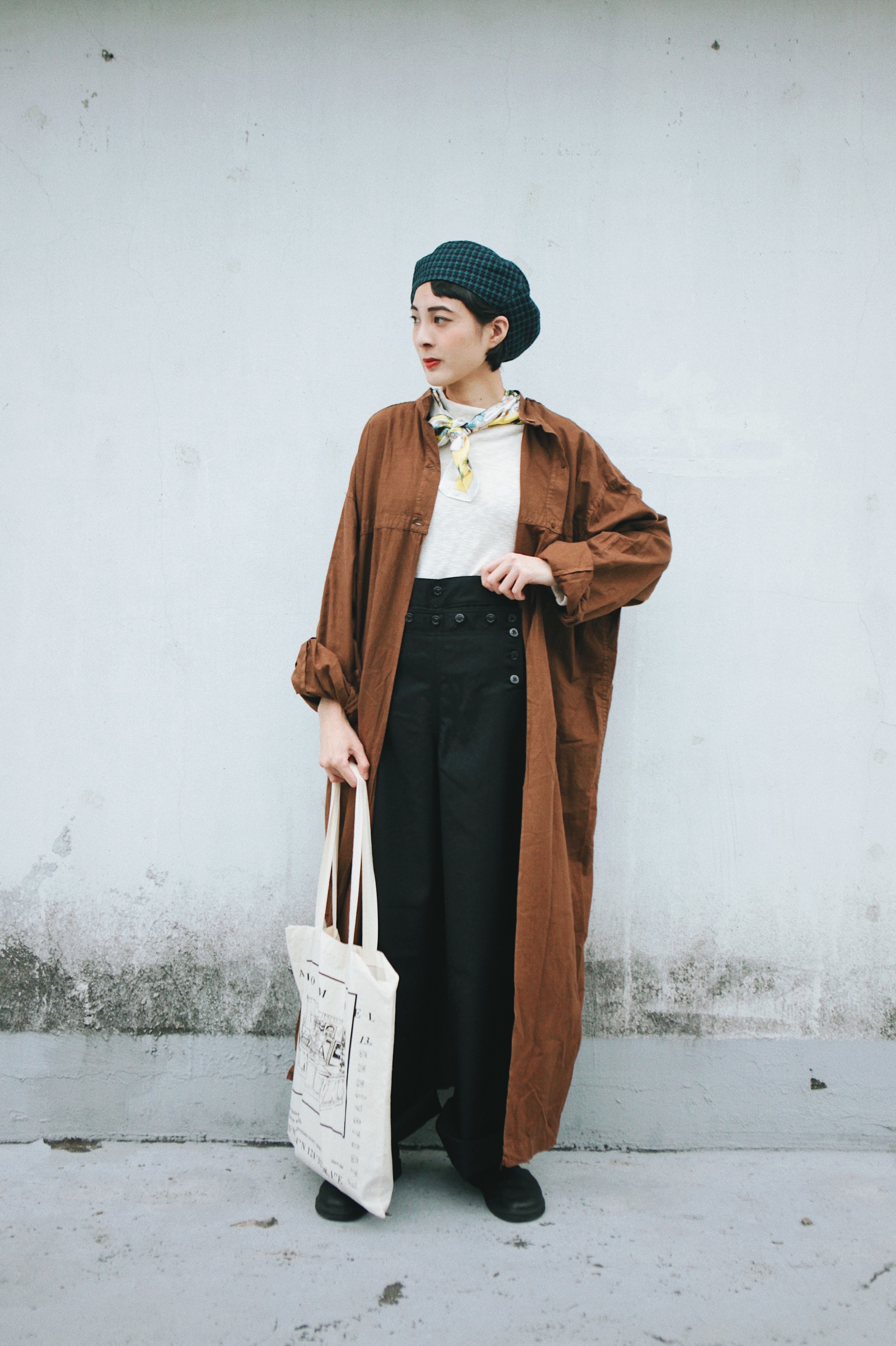 說起令我們自豪的自製品,可少不了英軍褲頭復刻裙!採用厚度與挺度都足夠的的斜紋布製成氣勢十足的傘狀裙擺,搭載可調整腰圍的雙側釦,打造出更成熟、更有立體感的群裳。色系更是百搭且百看不厭,無論是淑女或是中性風格都能輕鬆駕馭,而相較於常見的大地色系,今年也嘗試看看灰白色吧,一穿上便自然流淌出柔美氣息。