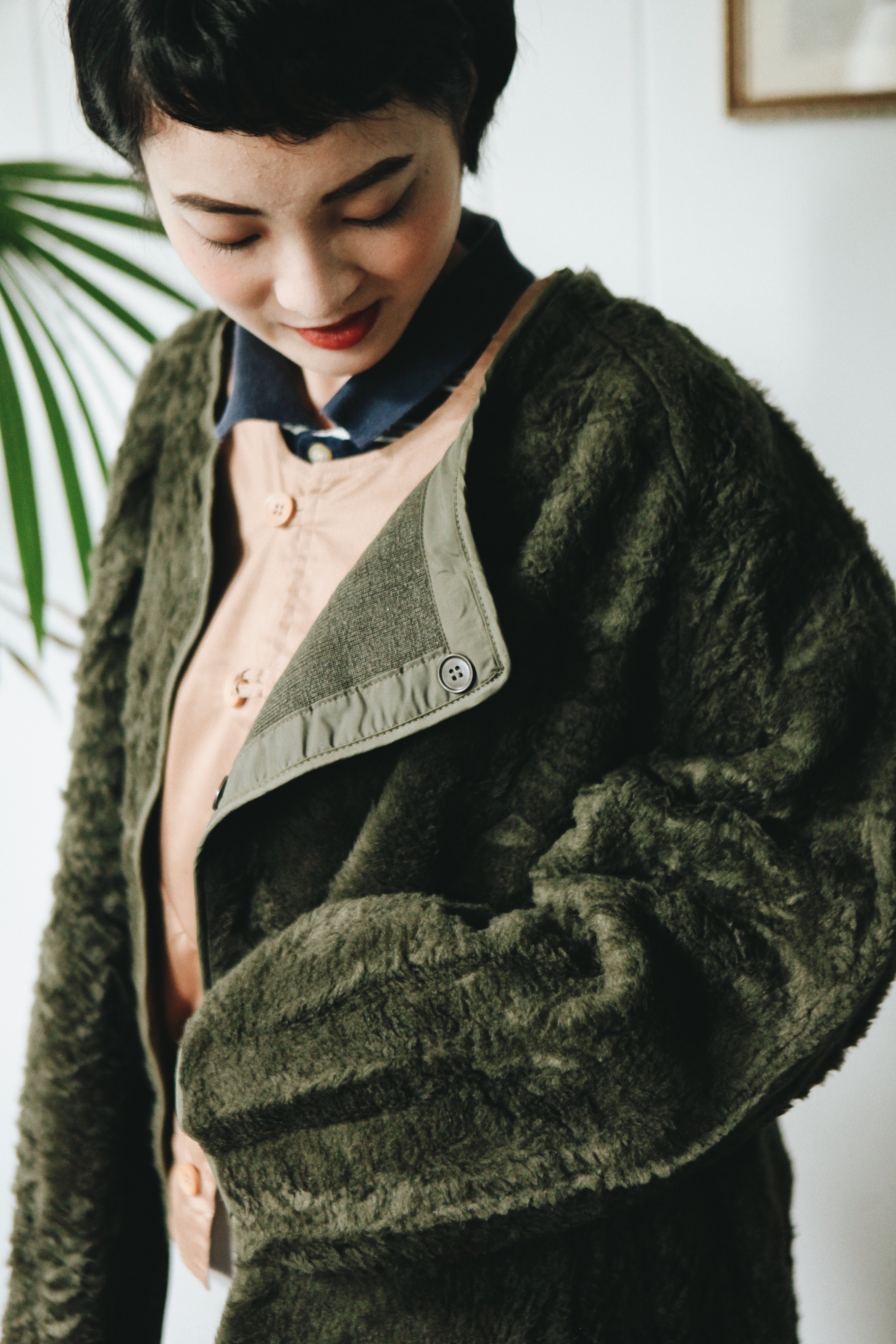 近幾年在日本街頭蔚為風潮的不僅是軍品而已,以往只當作內裏著用的軍外套內襯,也受到了大量關注,許多日本人直接將其當作大衣外套搭配,呈現出另人耳目一新的風格。除了熱門選項 M65 liner,不妨也參考看看這款法軍軍用外套內襯,寬大的版型搭載厚實保暖的軍綠色絨毛,在視覺上極具份量感,而無領的設計反倒為搭配創造了多層次的空間,讓內裏搭配的襯衫衣領可以輕易展露。