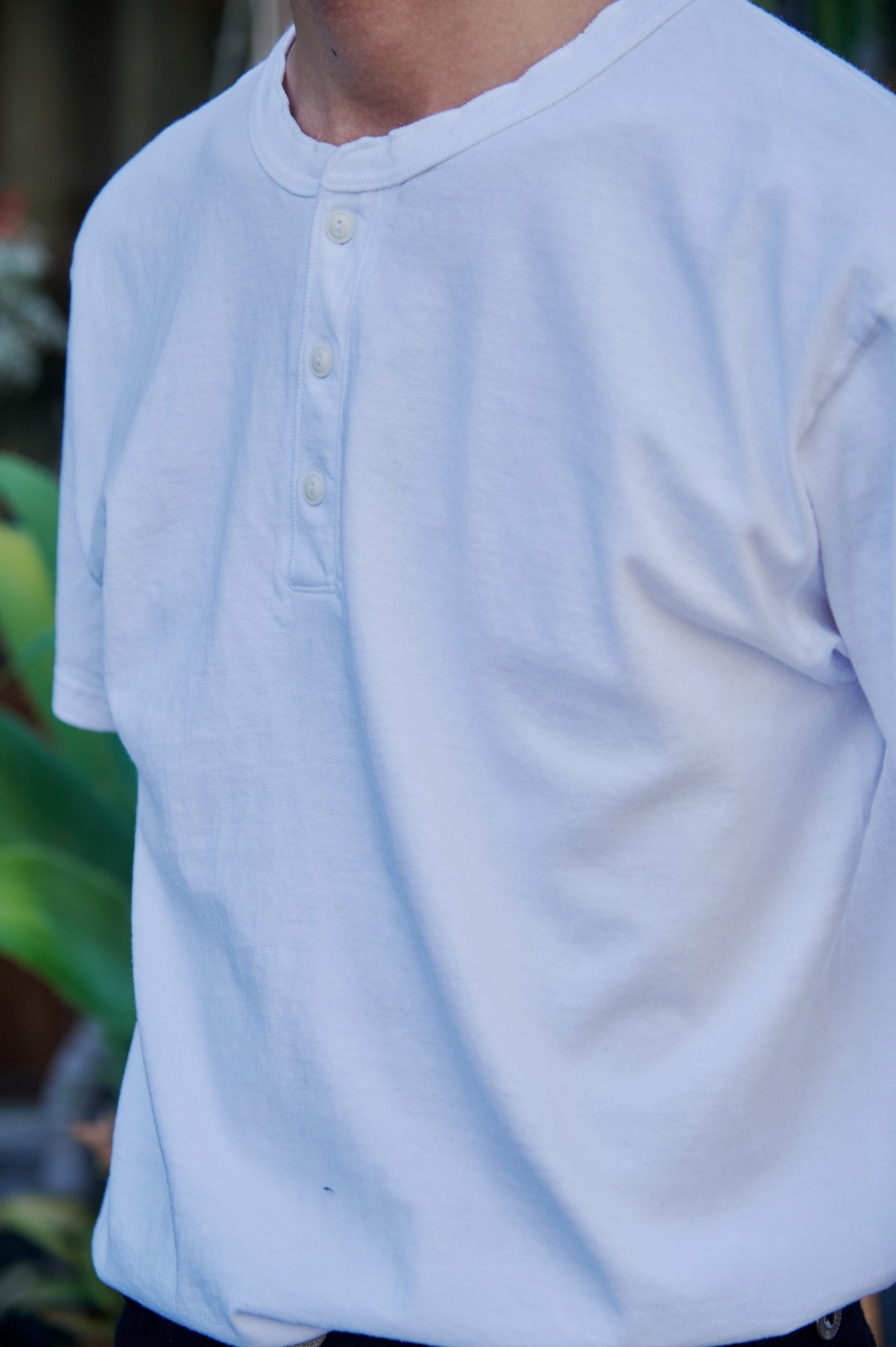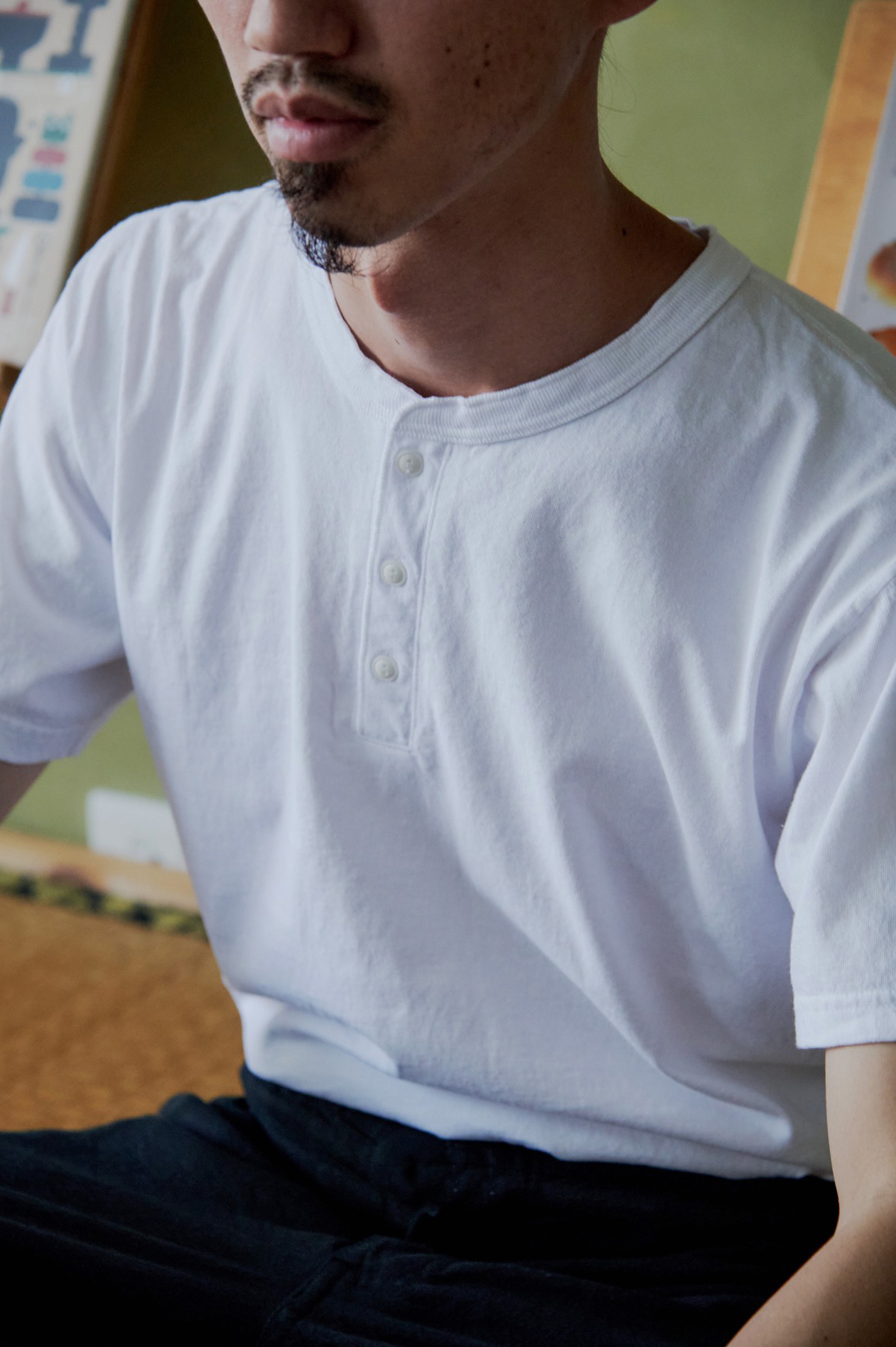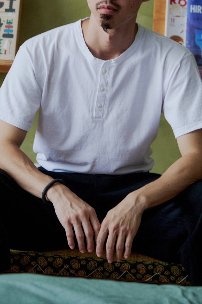 第二套則是我平常比較沒有在嘗試的風格,有著亨利領的 Henly Tee,搭配法國軍用褲款,以麻為主、混紡棉的布料適合悶熱的夏天著用,褲頭與褲腳的鐵釦零件也做得很細緻。