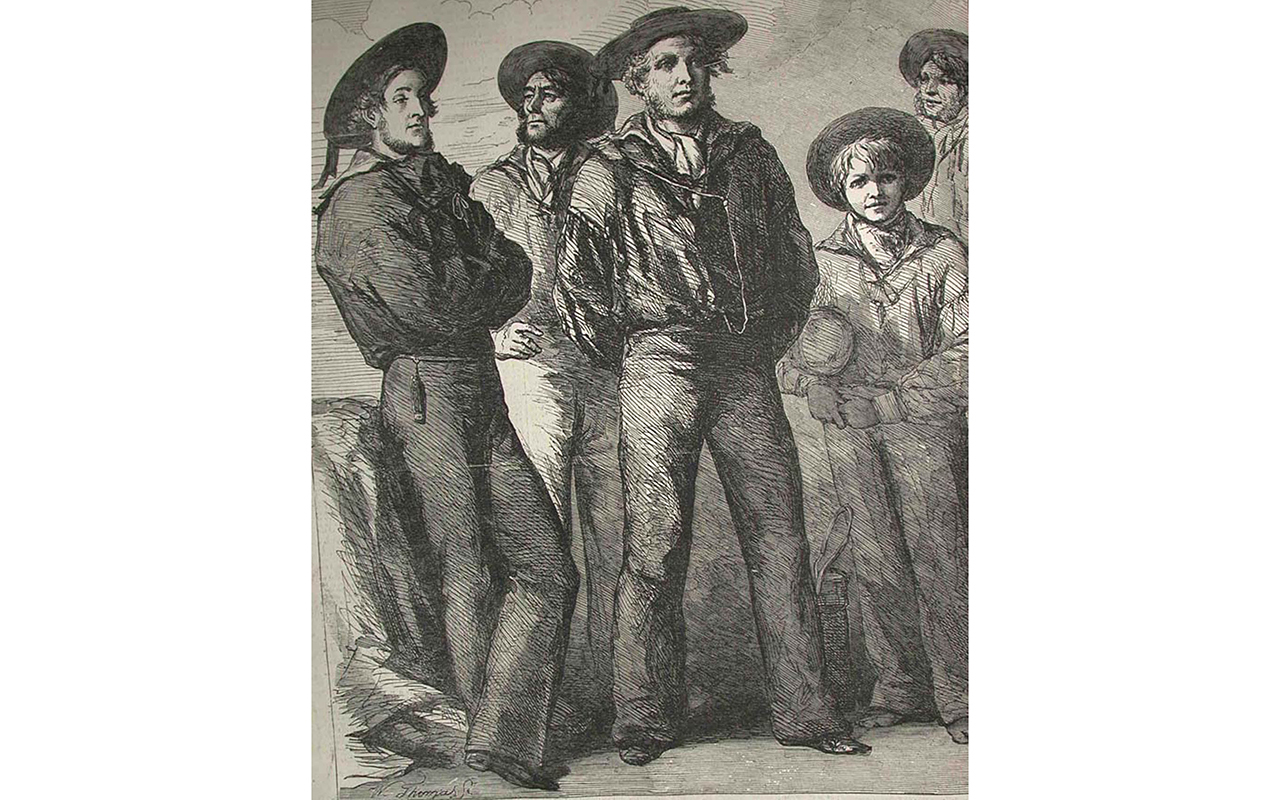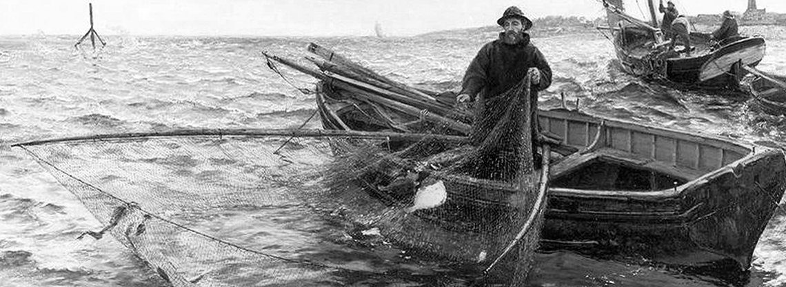 有海的地方,就有水手、漁夫、探險家,他們窮盡生命探索古老海洋的寬廣及深邃度,所穿的服裝保護身體面對海上生活的種種嚴酷考驗,著重實用、溫暖、耐磨。輪廓符合海洋民族注重的簡約美感,你可以發現漁民裝通常沒有複雜的裝飾、束繩、扣帶、過大的鈕扣,以防止身體被漁網、繩索纏住;色系上常使用白色布匹及靛藍染製的深藍色。