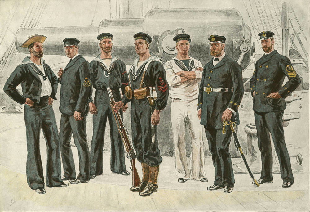 早期海軍成員可以說是一群沒有榮譽感的烏合之眾,可能是亡命天涯的囚犯、或港口自願上船的居民。高替代率、高風險使得船員沒有任何稱為制服的服裝。直到1745年一群英國軍官向上級請願申請統一的制服顏色,最後由英王喬治二世定奪,他認為海軍將領之妻Bedford公爵夫人,穿著深藍服裝在海德公園的身影令人印象深刻,決定了以藍白為主色調,英國海軍藍開始席捲大航海時代;隨後在1775美國海軍也參考仿效了英軍的制服與用色。