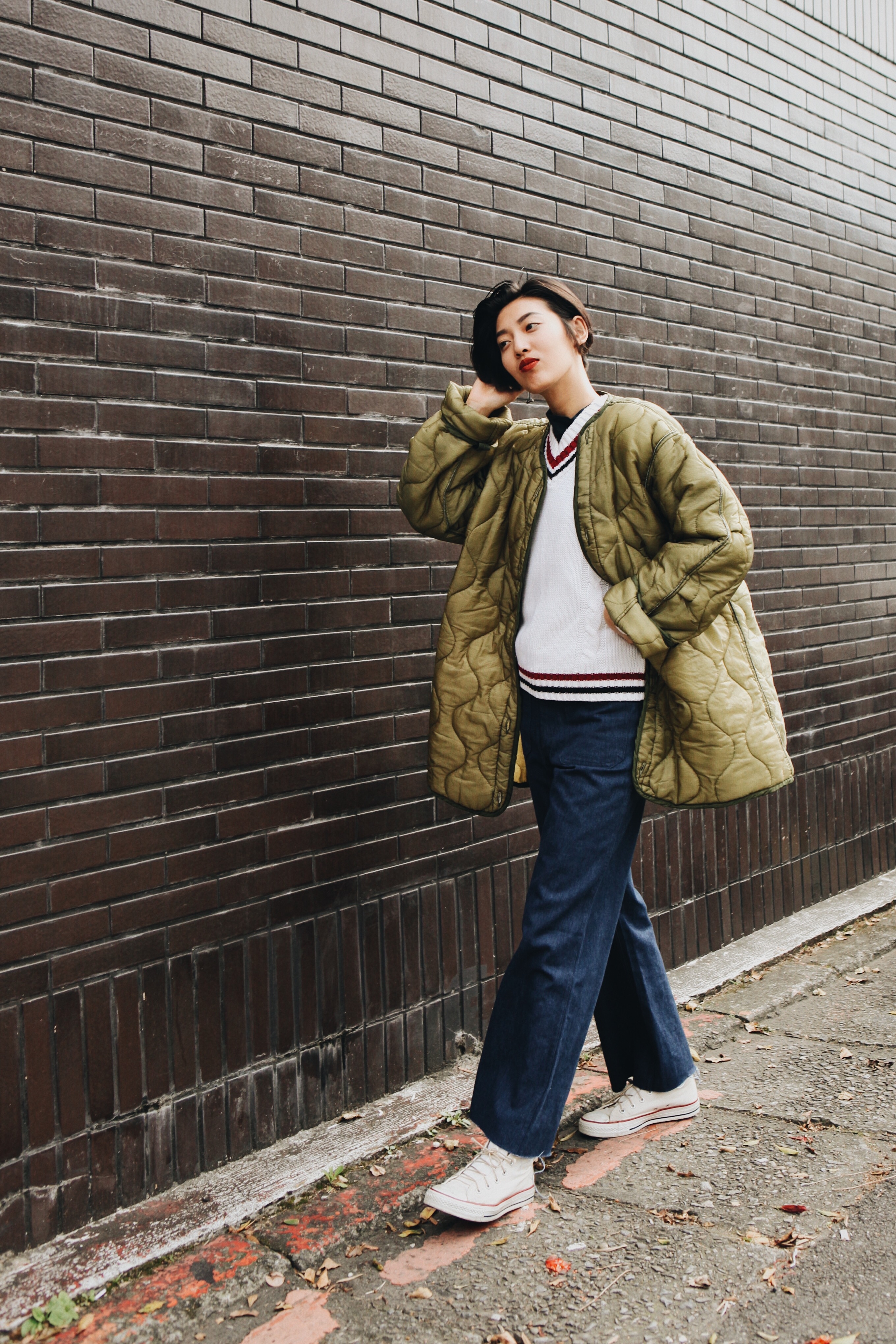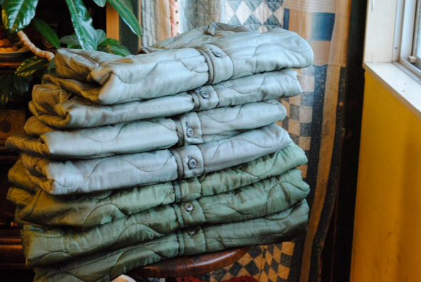 軍裝的發展有如伸展台上的服裝,因應作戰環境不斷推陳出新,美軍更是先進技術與款式繁雜的佼佼者。美軍M65 Liner除了內裡外套必有的元素,沿著輕量尼龍絎縫出特殊的織紋(以前的棉被也常用這種方式固定棉料),輕巧同時能防風保暖,無領容易跟內搭做出層次,蓬蓬的內裡外套穿起來蓬鬆可愛,無領能呈現率性氛圍,容易搭出個性感。