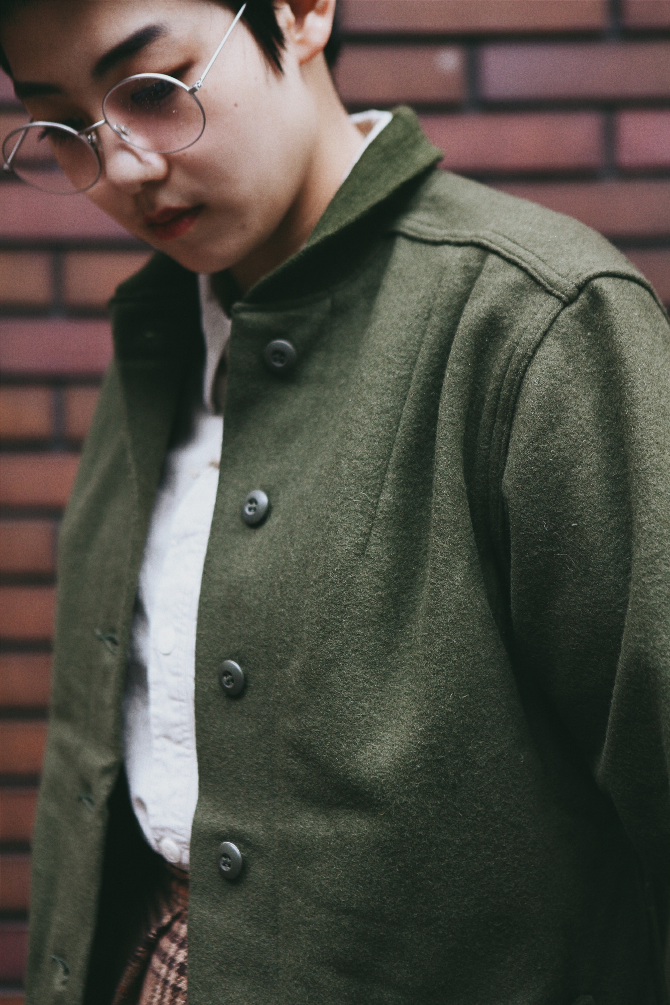 來自80年代美國陸軍女兵公發的內裡式外套,厚實的羊毛材質保暖,內裏的滑布夾層防風,能防止冷風灌入。其他特色包含圓潤的披襟領(Shawl Collar)、兩側方正的外縫式口袋、袖口的螺紋針織等。