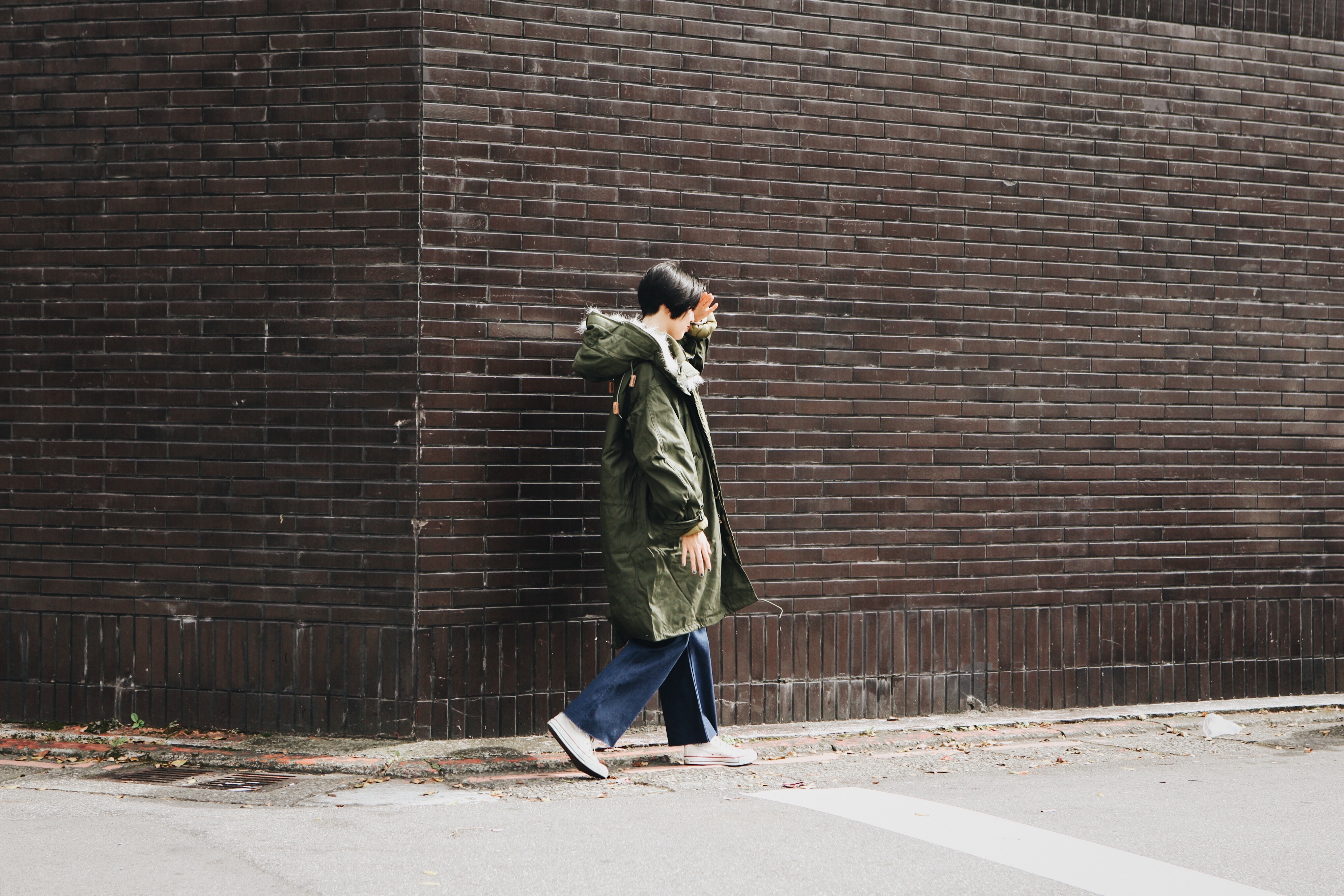平時穿著軍用外套,冷的時候裡面加上內襯。