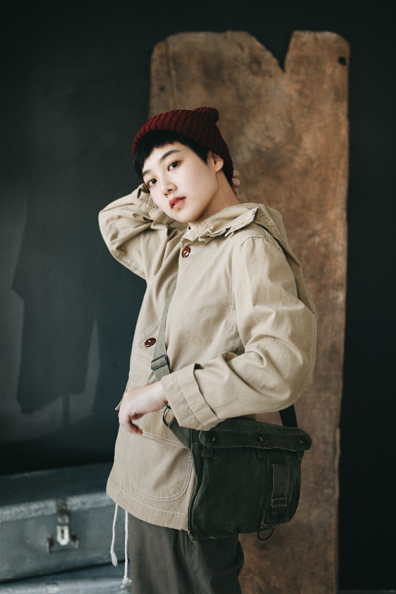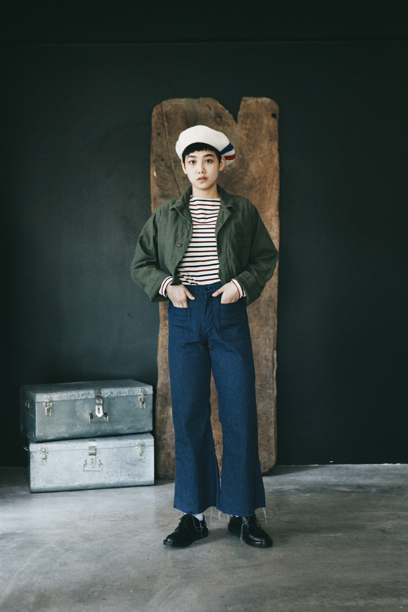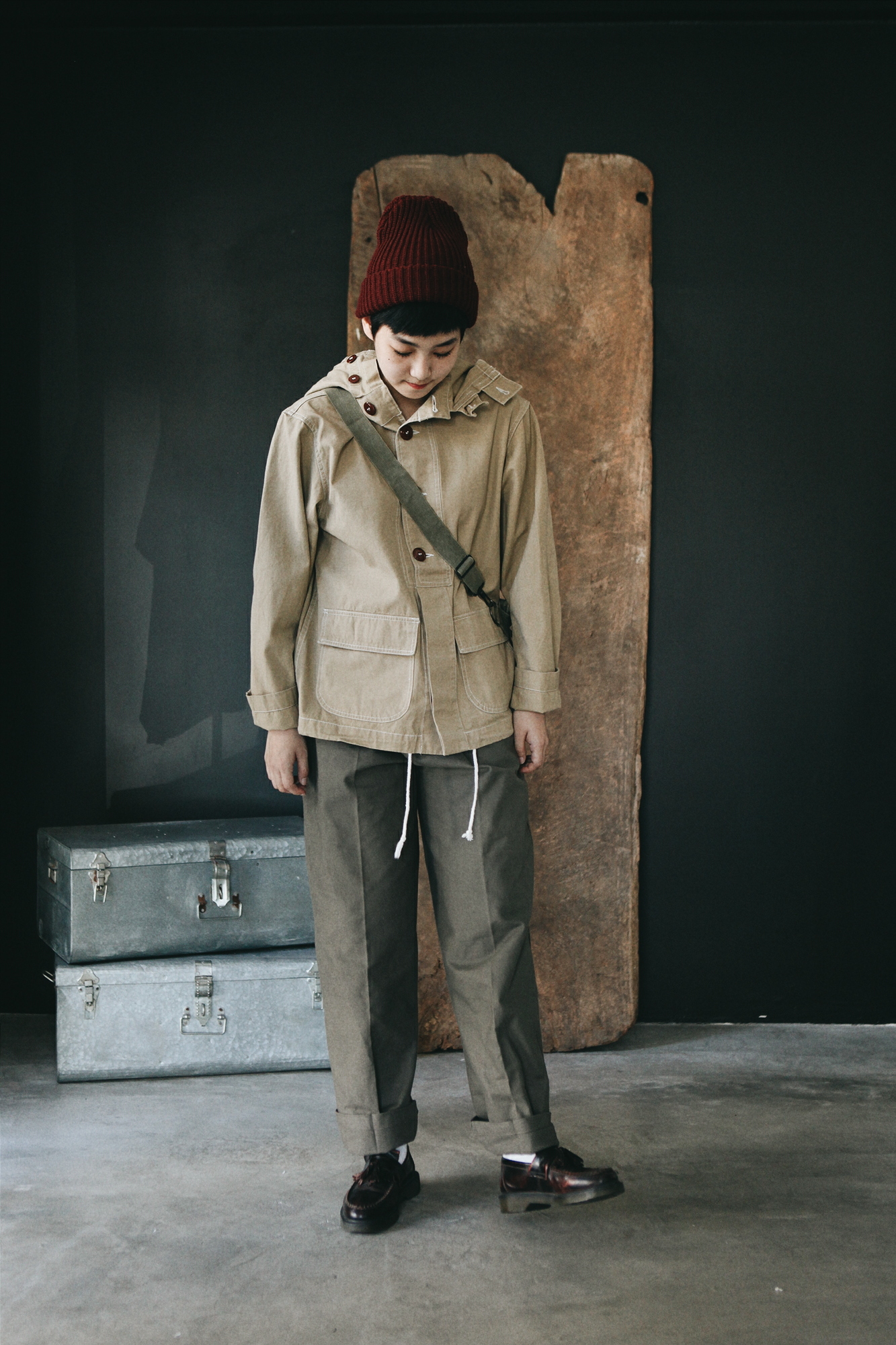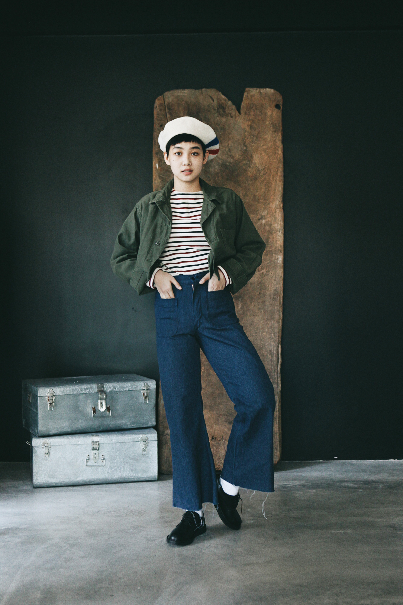 因為特別喜歡女生穿著軍品呈現的愜意自性態度,所以刻意找到了市面上少見的美軍HBT女子軍褲。HBT的全名是「Herringbone Twill」,這種人字紋布料紋理斜向單一方向而得名。二戰後美軍率先將原本用於西裝上的HBT材質用於制服上,不易掉色、不易縮水、快乾、耐磨是此布料的優點。