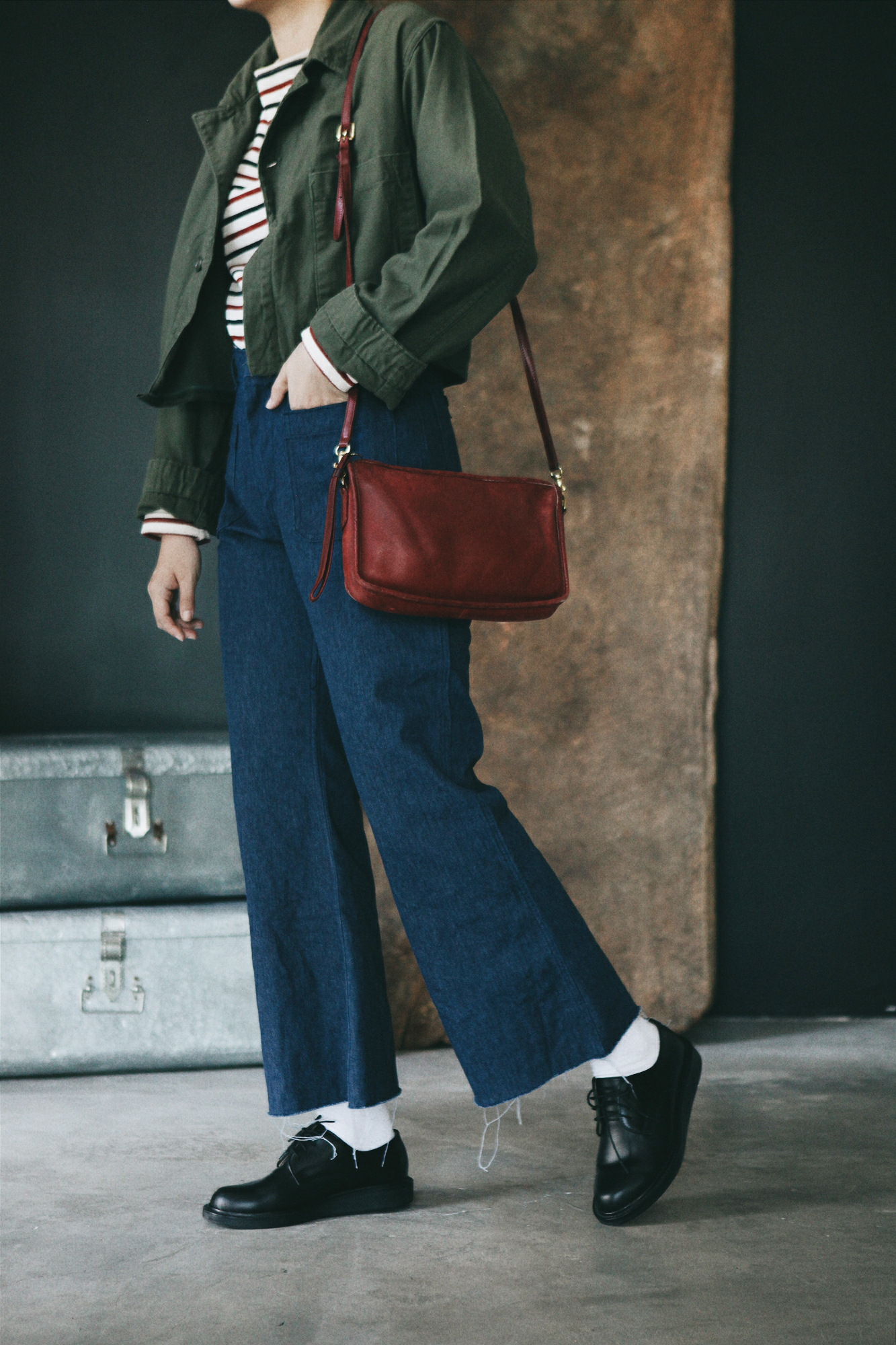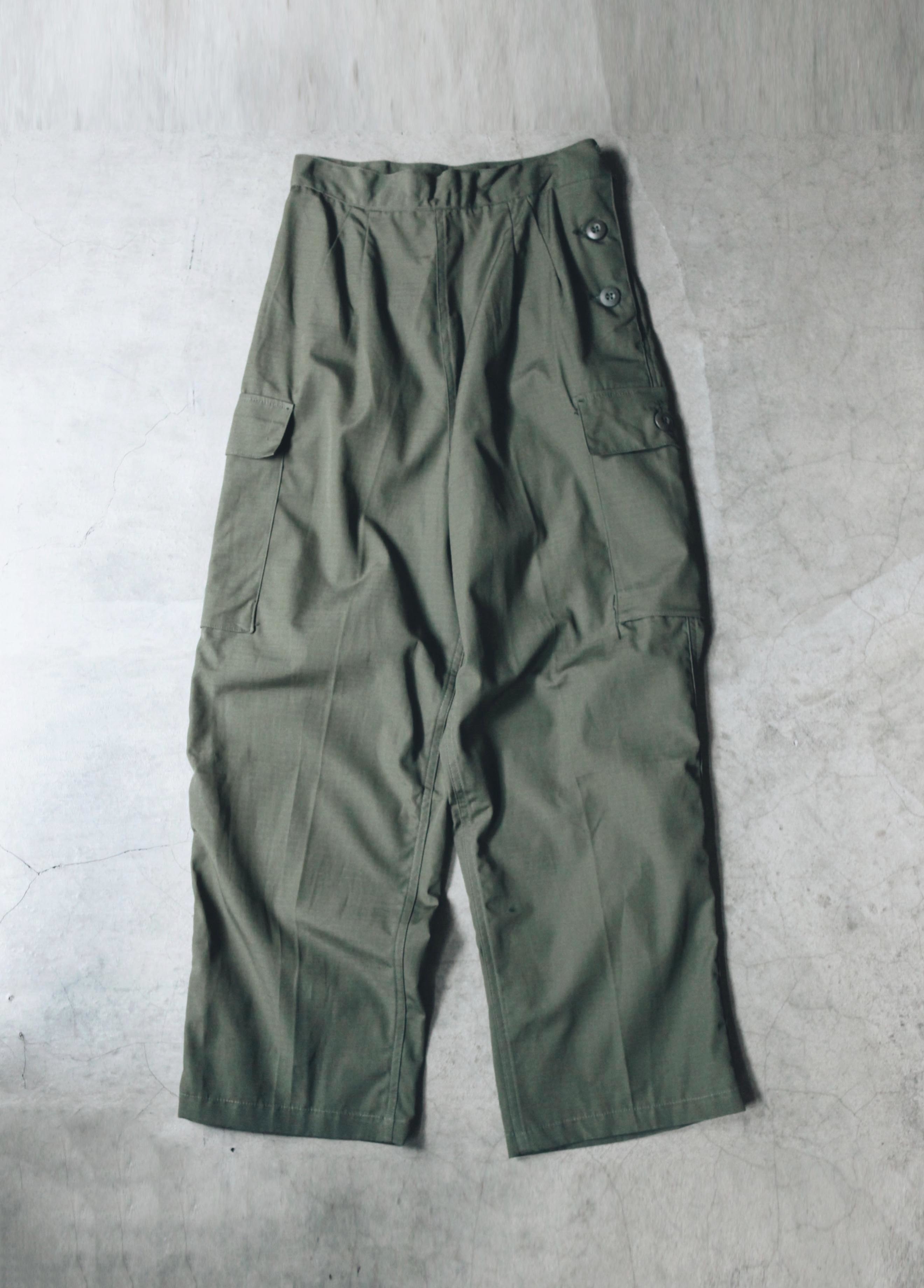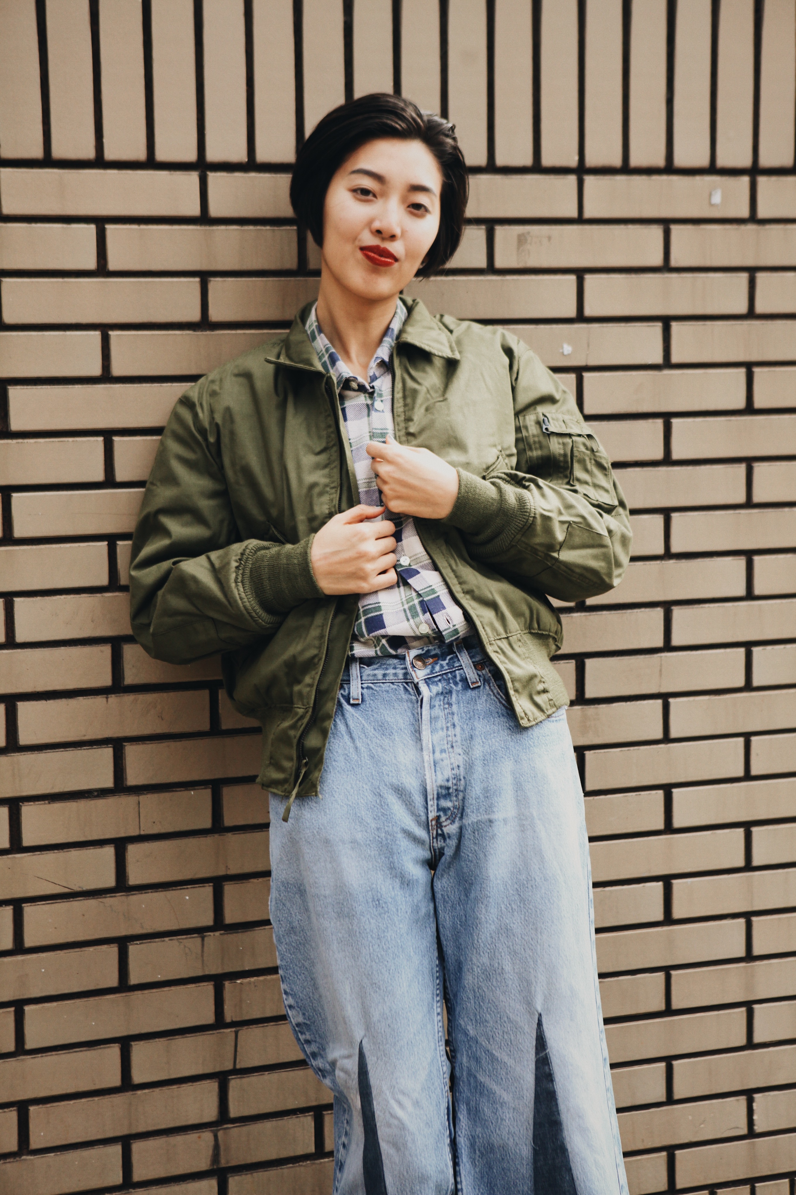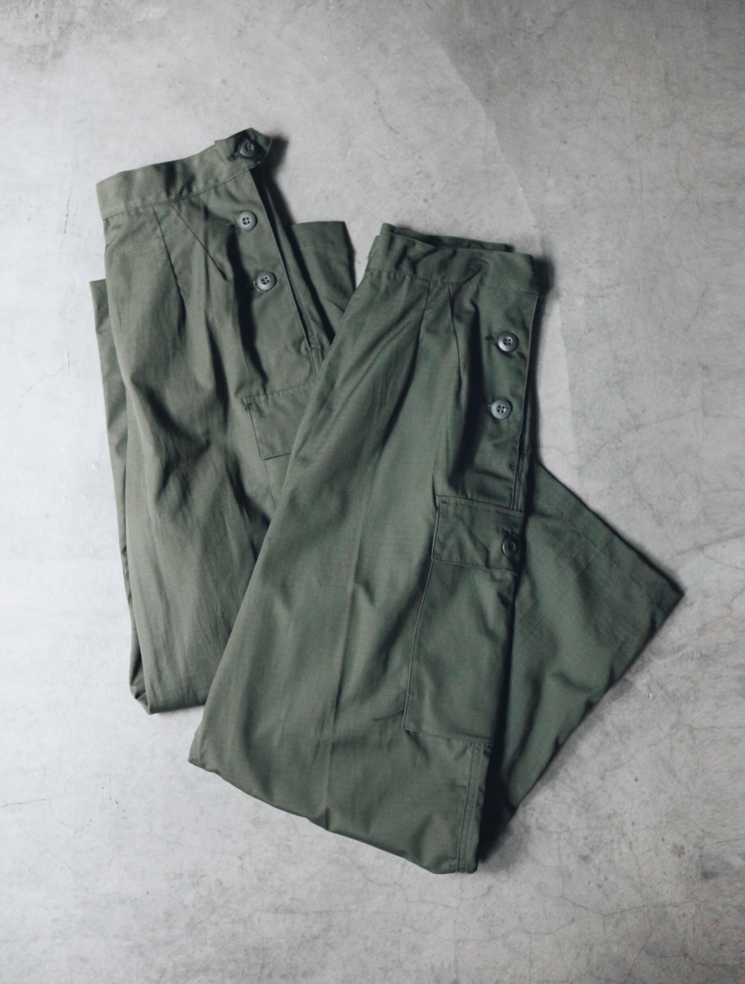 因為特別喜歡女生穿著軍品呈現的愜意自性態度,所以刻意找到了市面上少見的美軍HBT女子軍褲。HBT的全名是「Herringbone Twill」,這種人字紋布料紋理斜向單一方向而得名。二戰後美軍率先將原本用於西裝上的HBT材質用於制服上,不易掉色、不易縮水、快乾、耐磨是此布料的優點。
