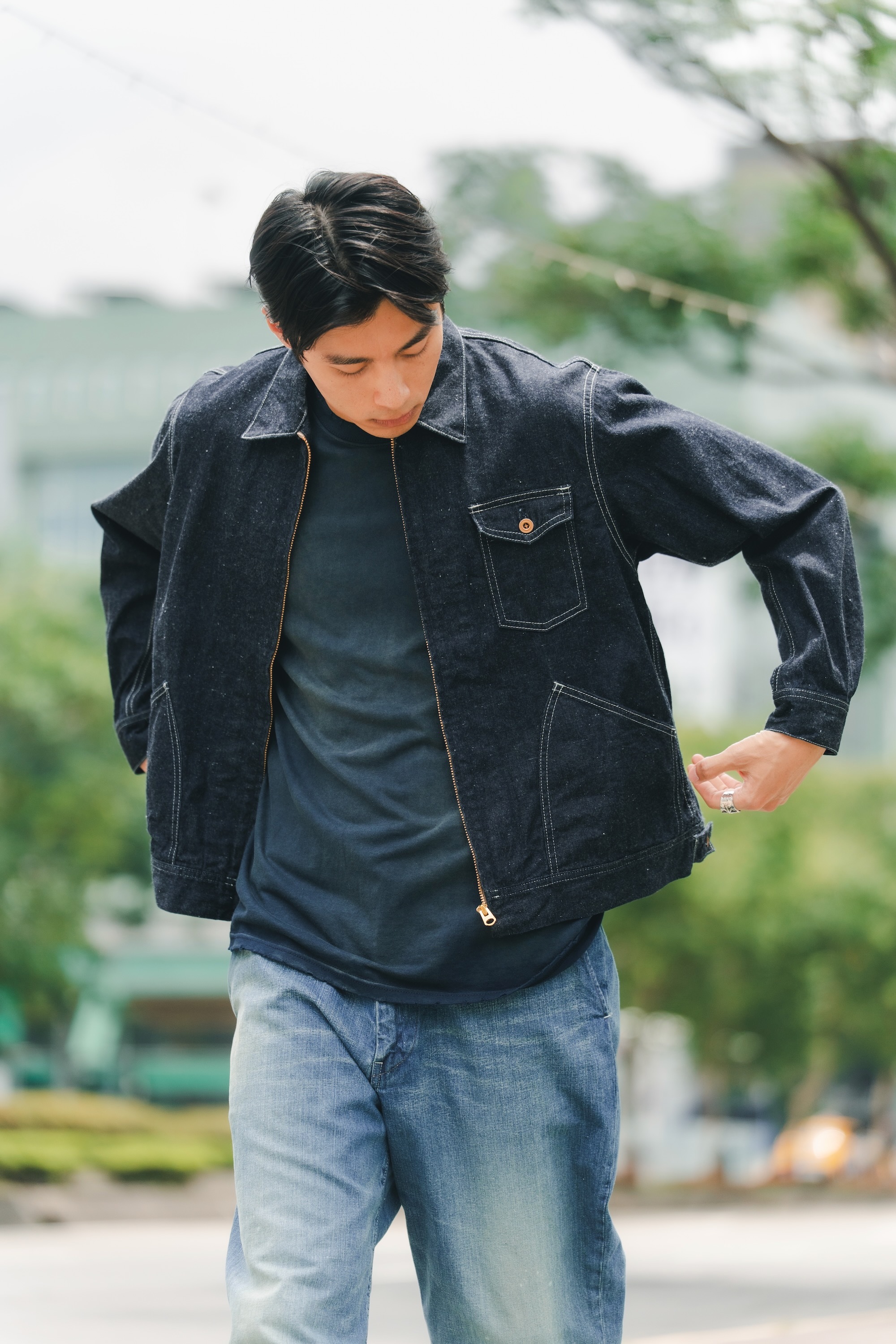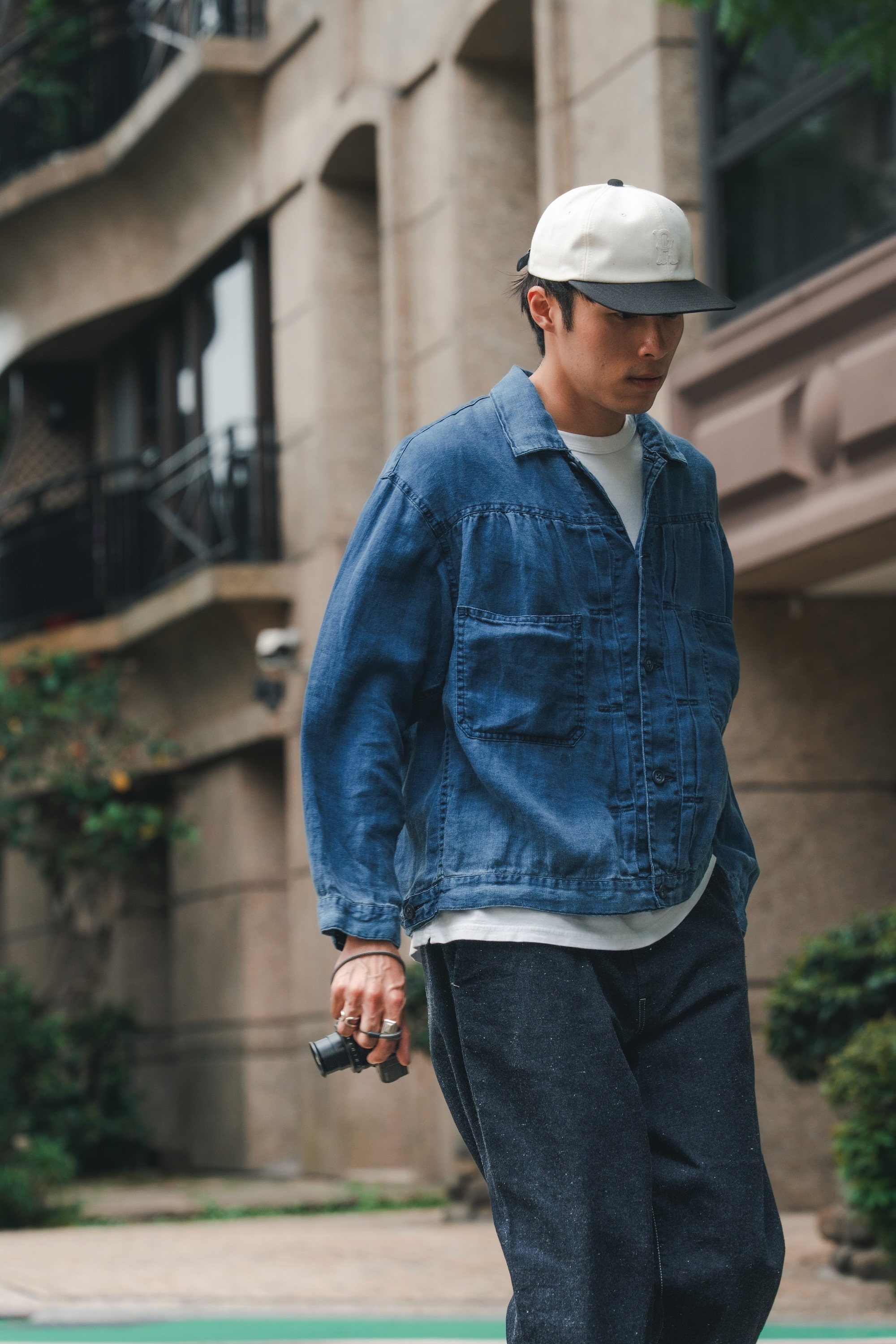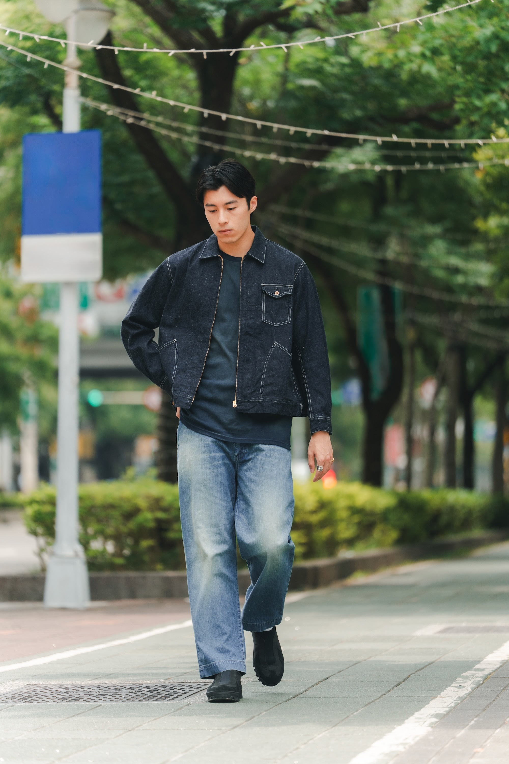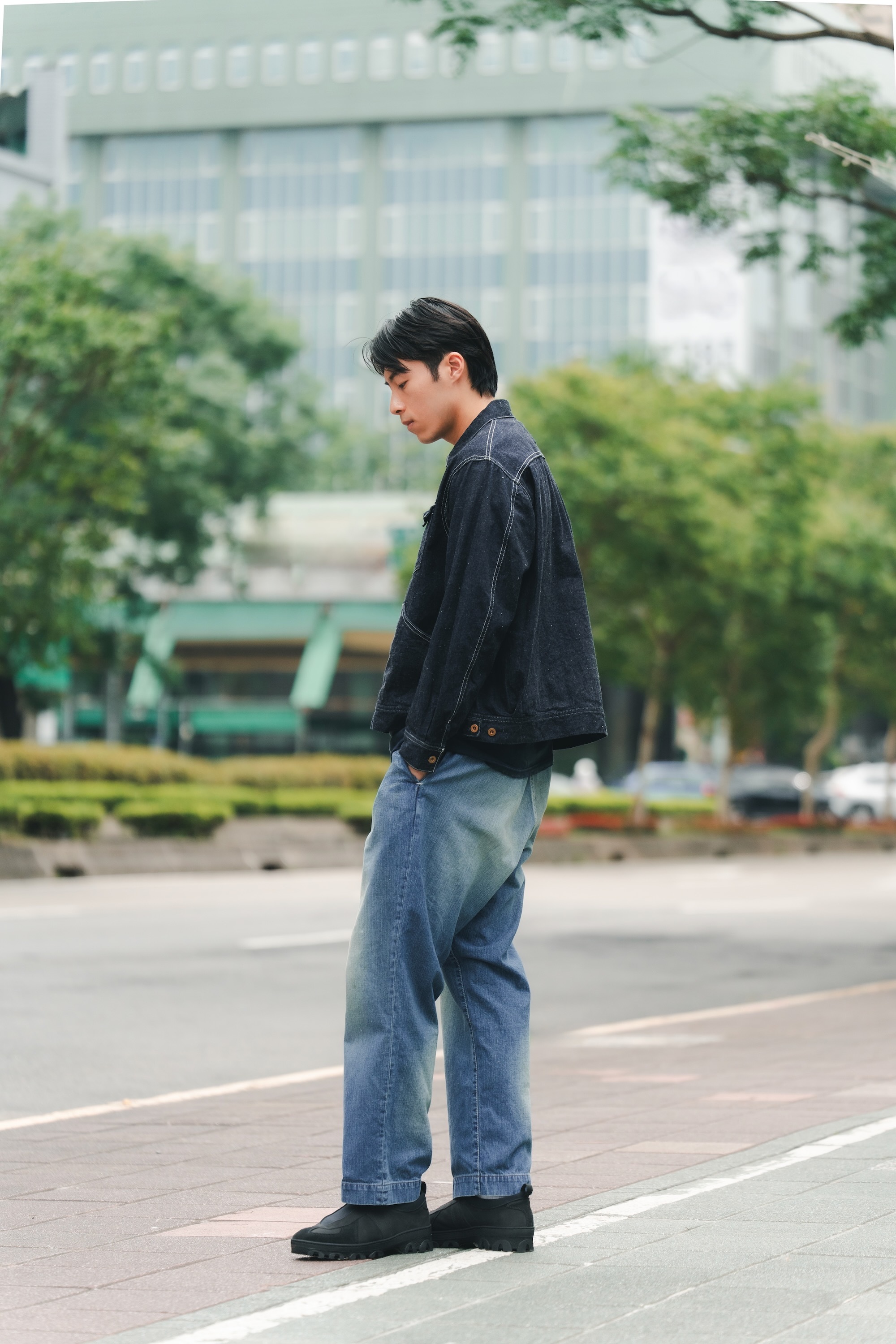單寧外套與褲子來自日本品牌H.UNIT