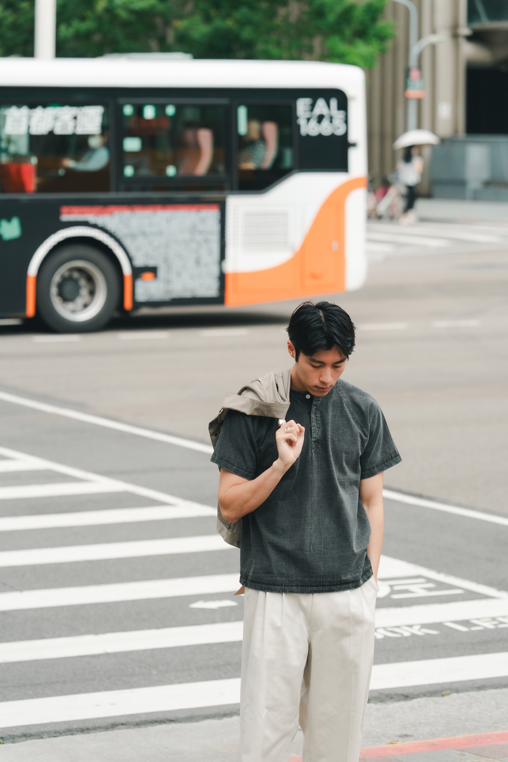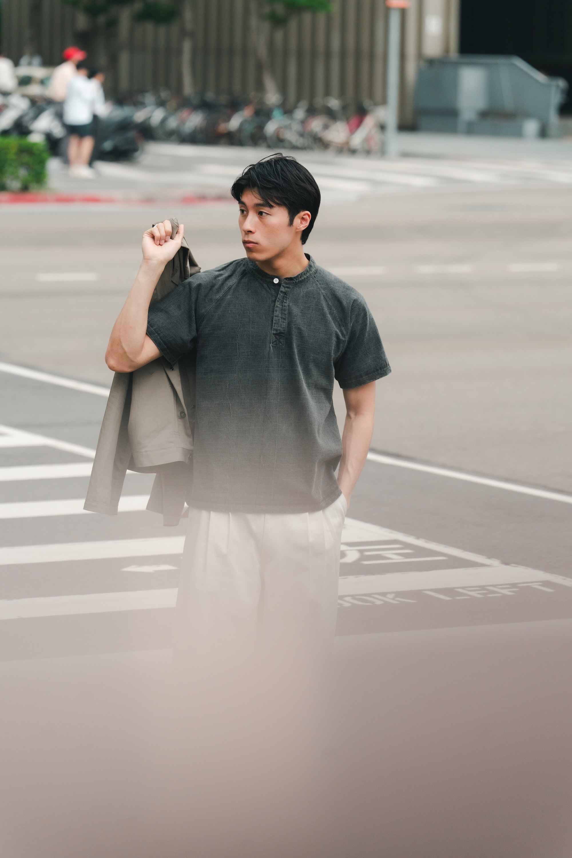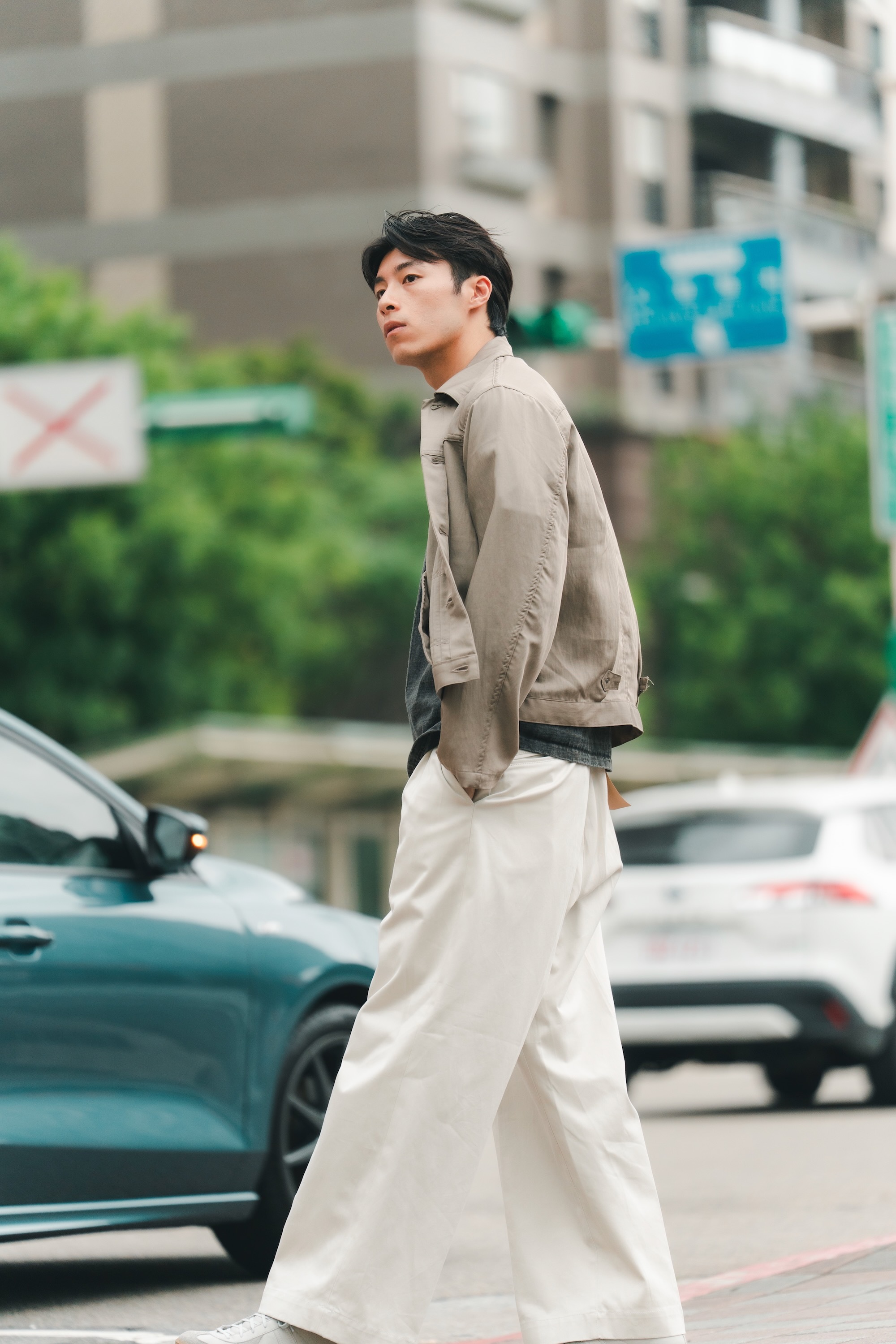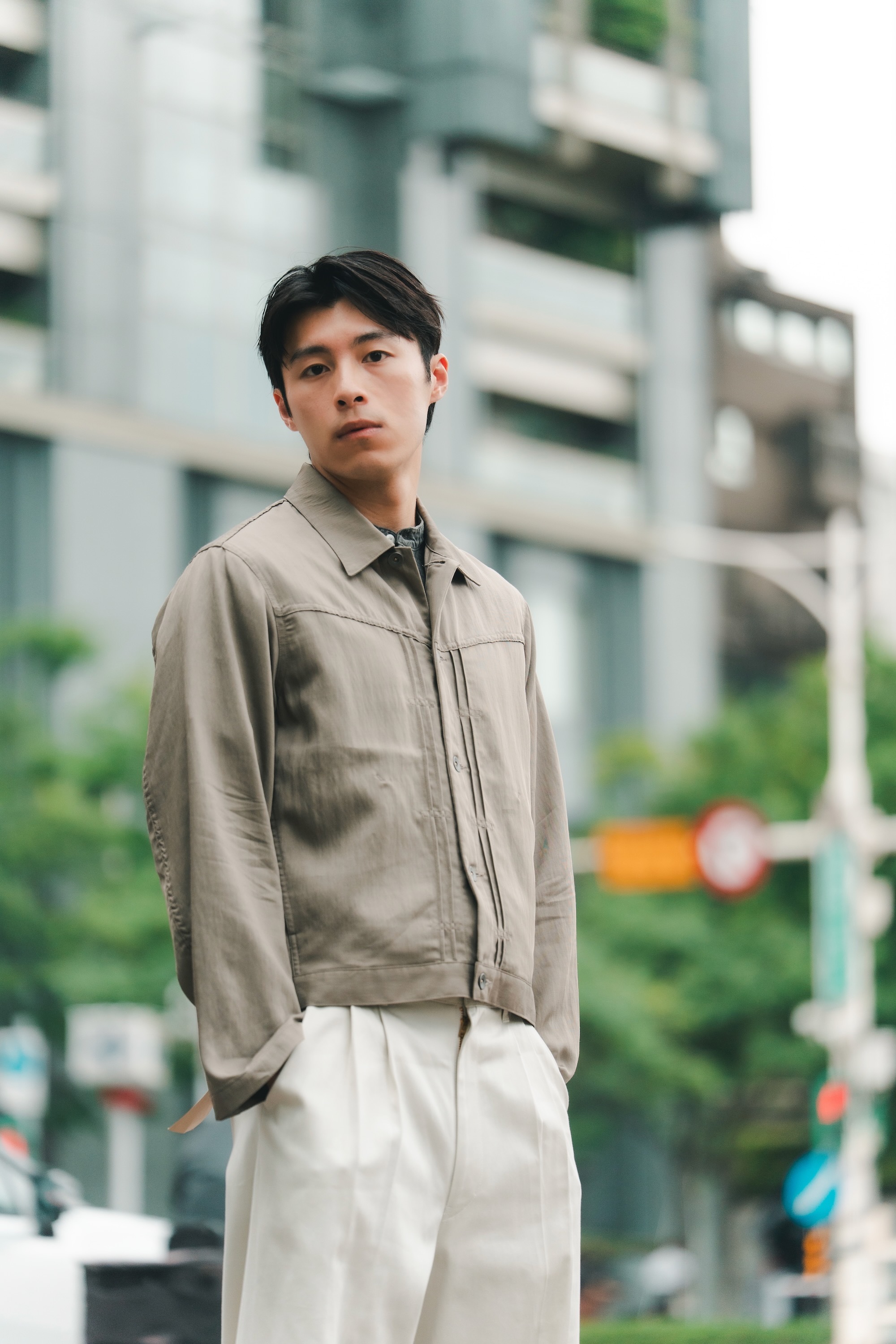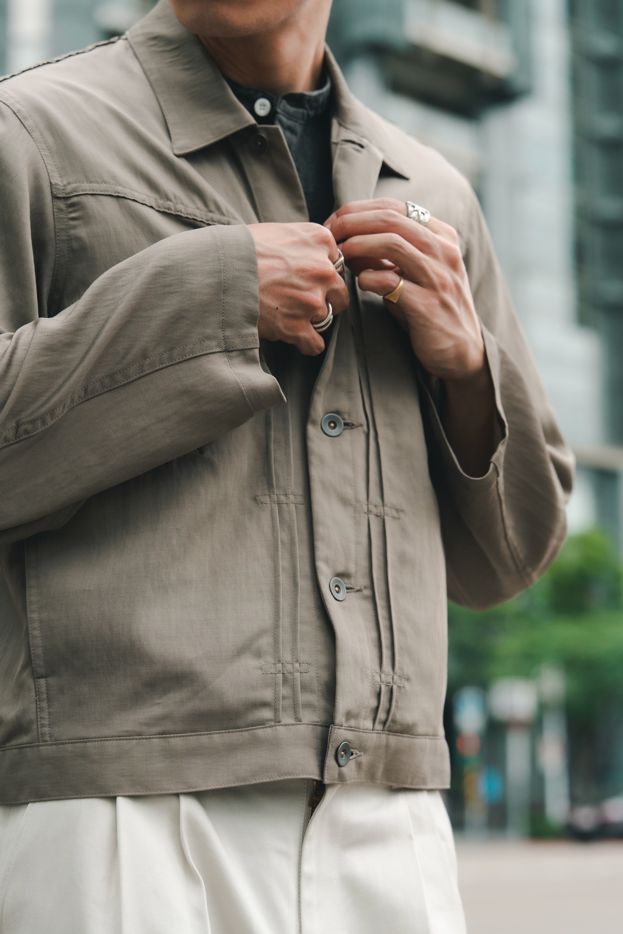 短版的設定與質感棉麻搭配,已經將外套推入另外ㄧ個帥的層次中了。