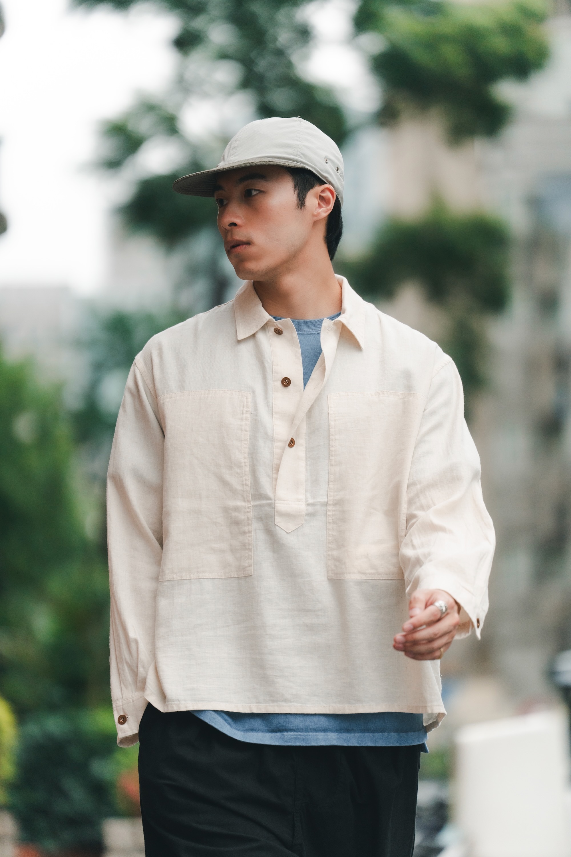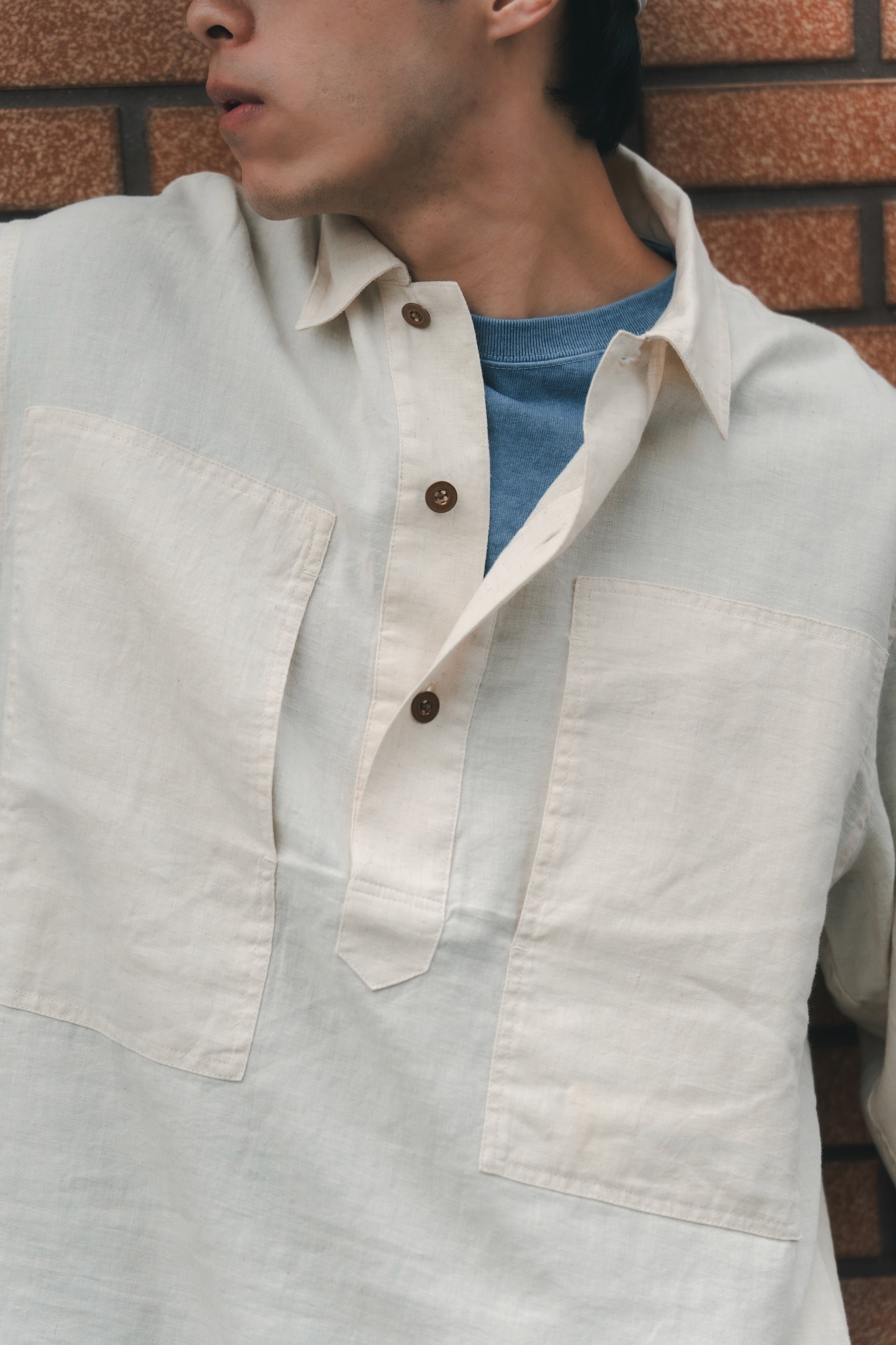 H.UNIT - Two Pocket Pullover使用 70% 棉、30% 亞麻混紡而成的的 30 支棉麻斜紋布。