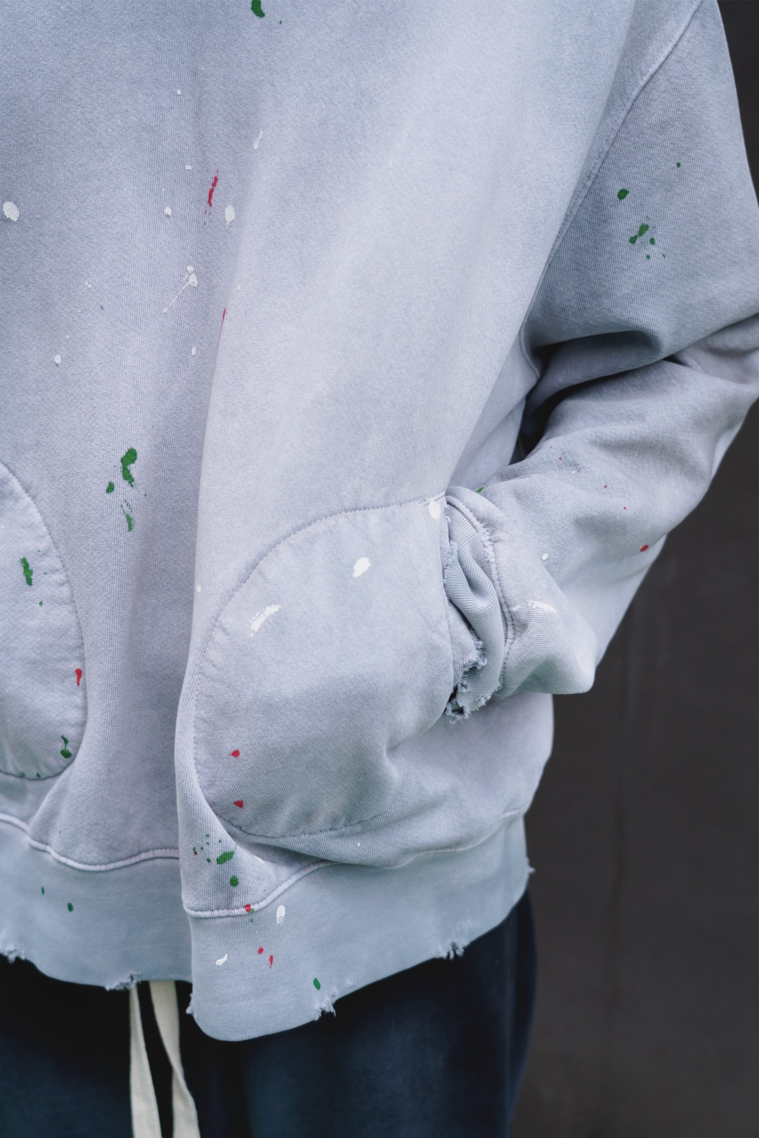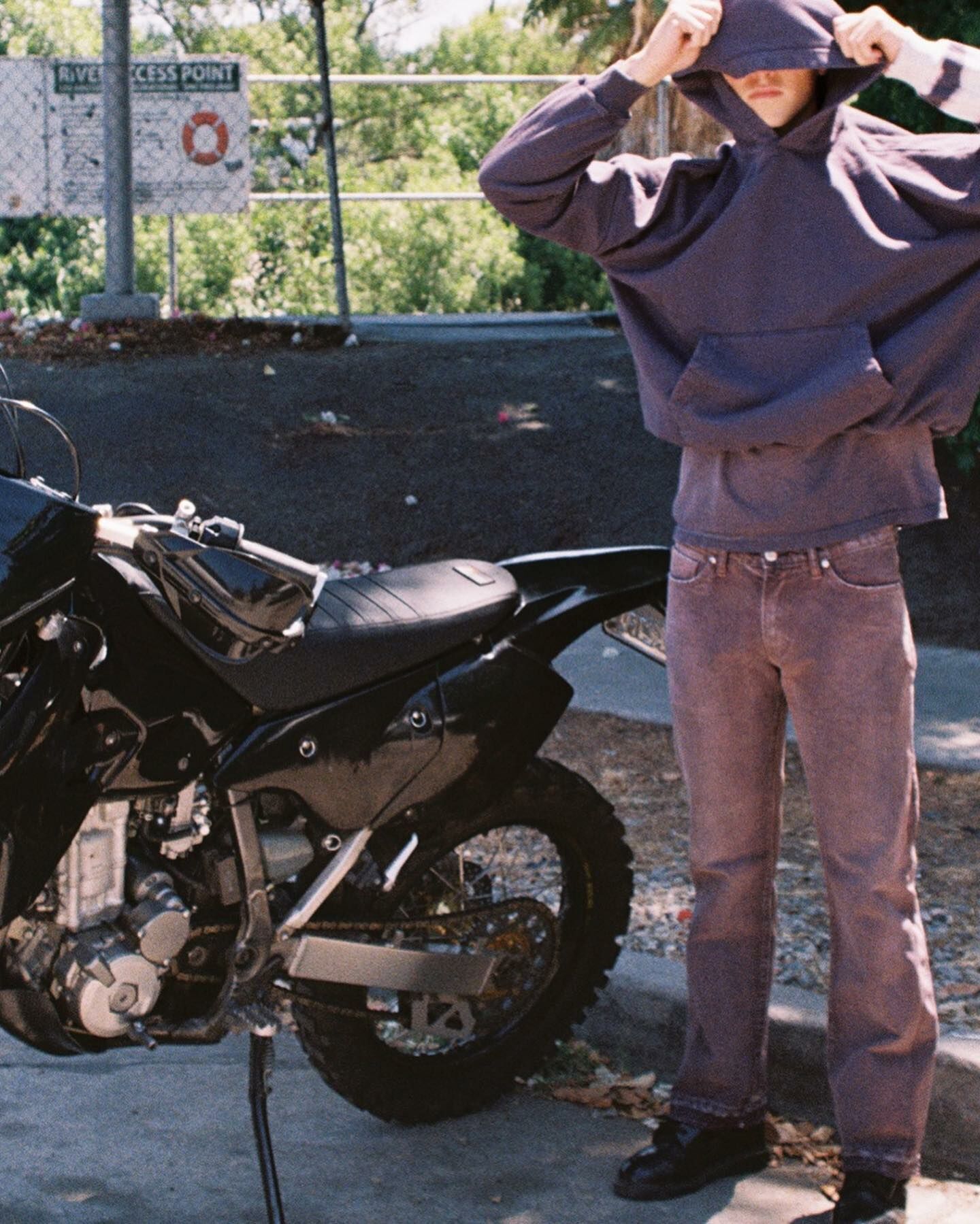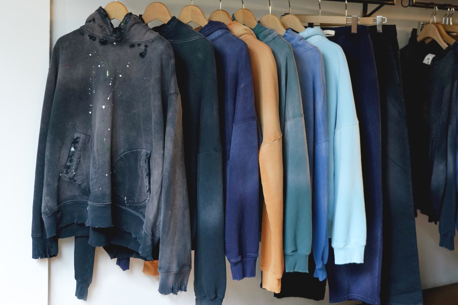 採用寬鬆剪裁與自然色調,材質選用重磅棉布或有機材料,全程於美國製作,結合做舊刷破的處理工藝,讓每件都有不同的刷色和痕跡。